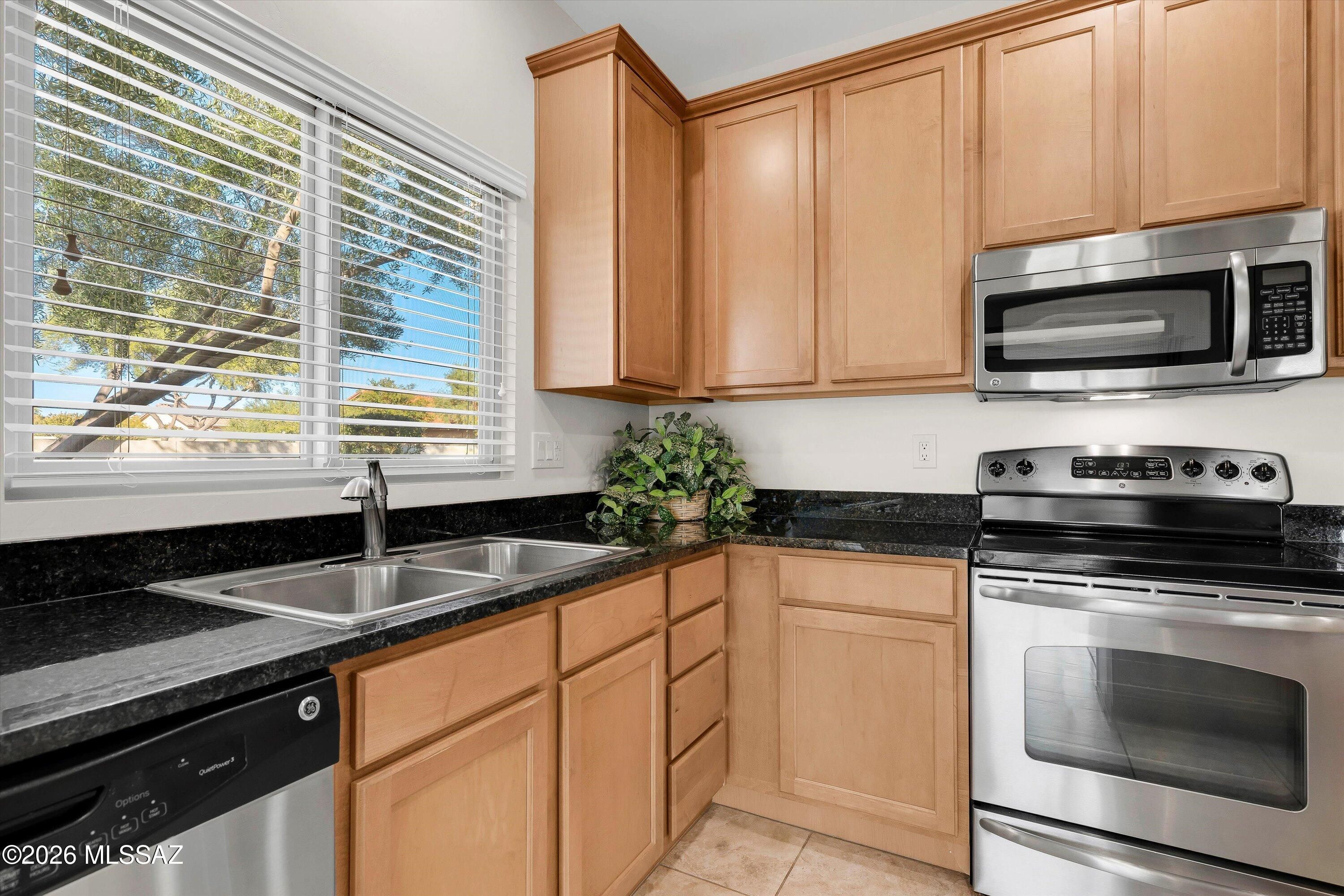 Charming Chaparral model move-in-ready situated on a spacious corner lot with common area behind, offering the privacy you've been searching for. Enjoy mountain views from the welcoming front courtyard--perfect for morning coffee. This 2-bedroom plus den home features an open-concept great room ideal for entertaining. Neutral tones flow throughout with tile and complementary LVP flooring (no carpet), stylish window coverings, and modern lighting and fans. The kitchen offers SS appliances, granite countertops, quality cabinetry with pull-outs, a center island, and opens seamlessly to the great room with a slider leading outdoors. The extended 2-car garage includes space for a golf cart and a utility sink. Major updates include HVAC and irrigation replaced in 2019 and roof recoated in 2023.