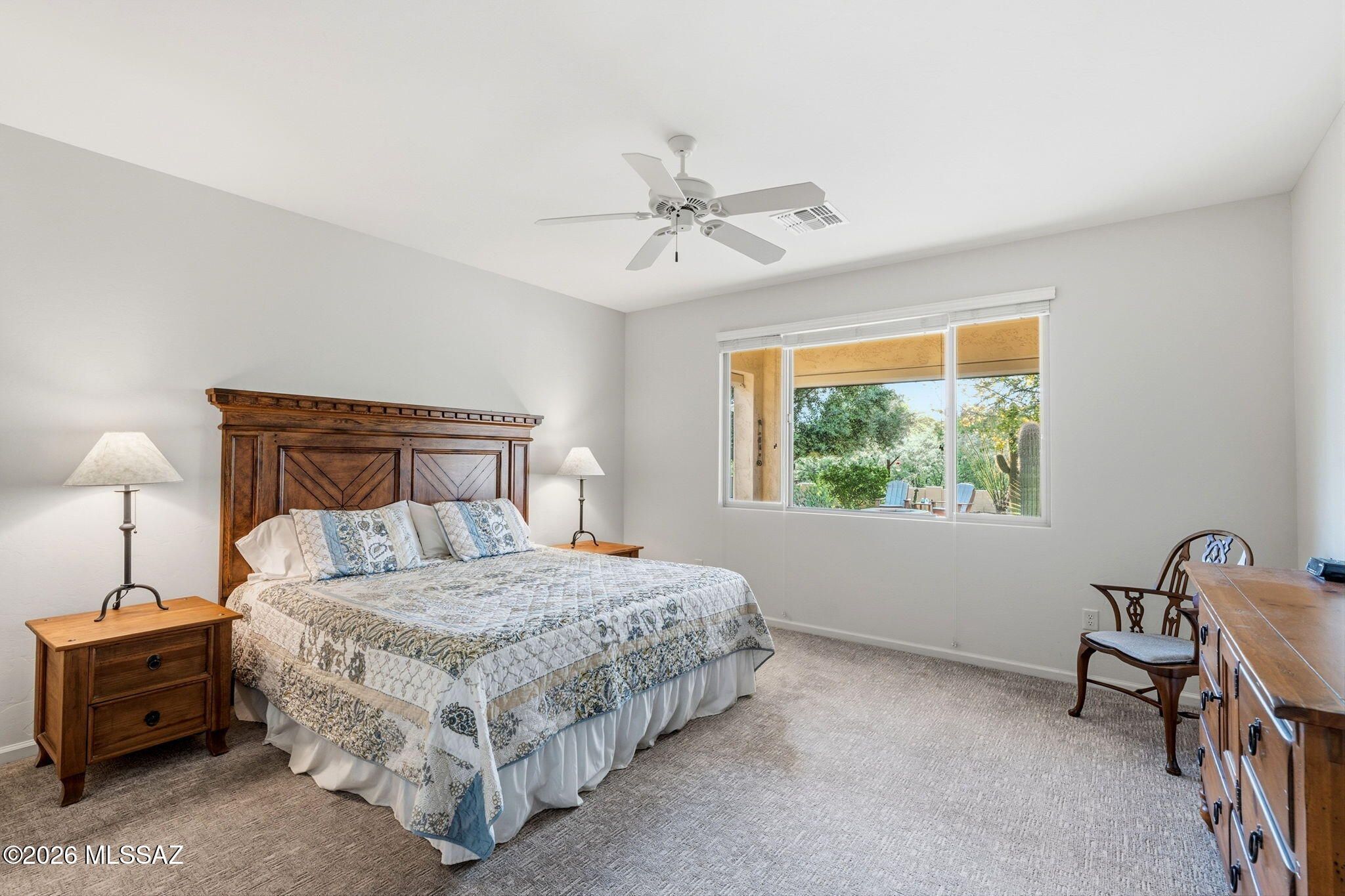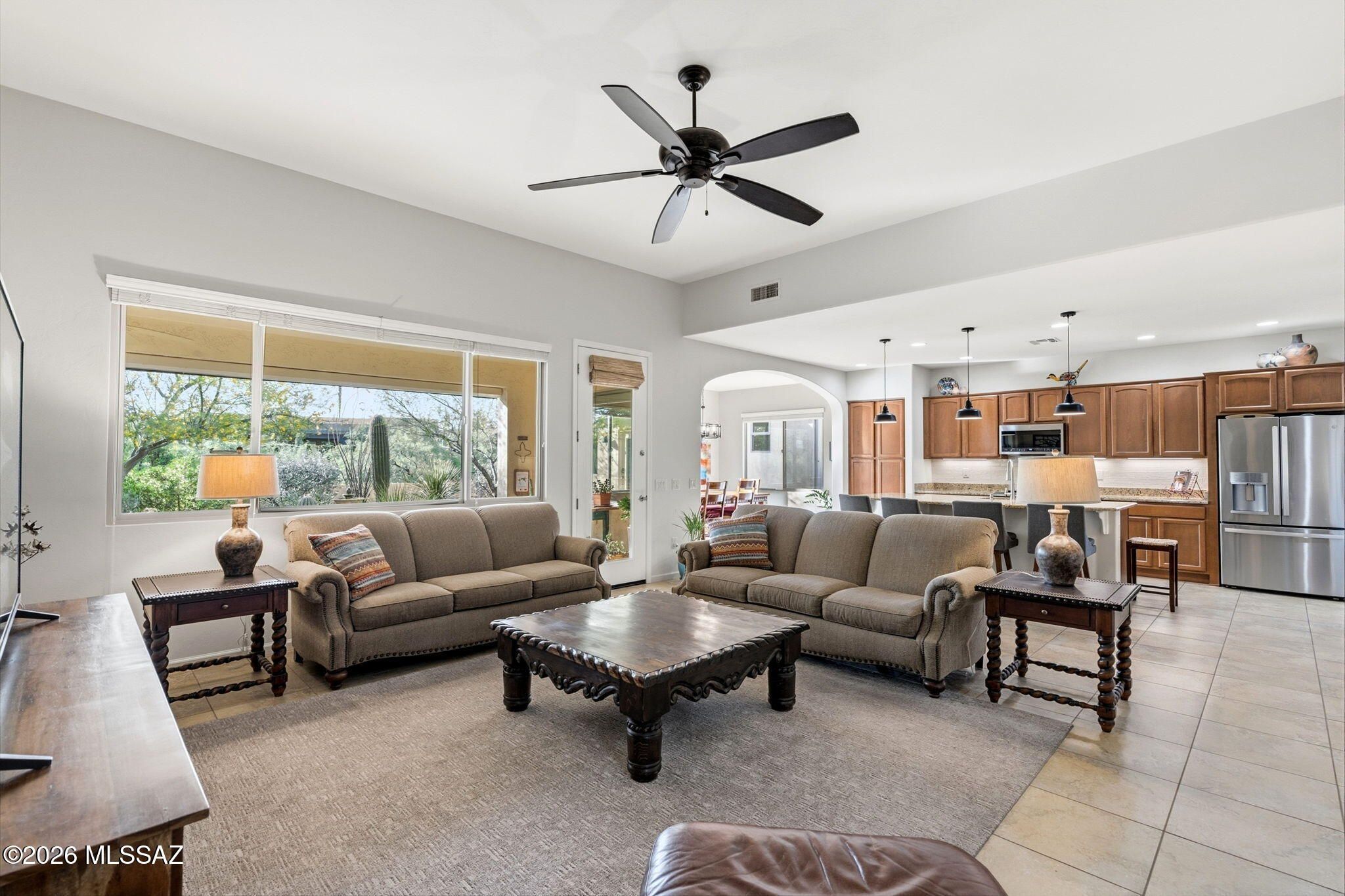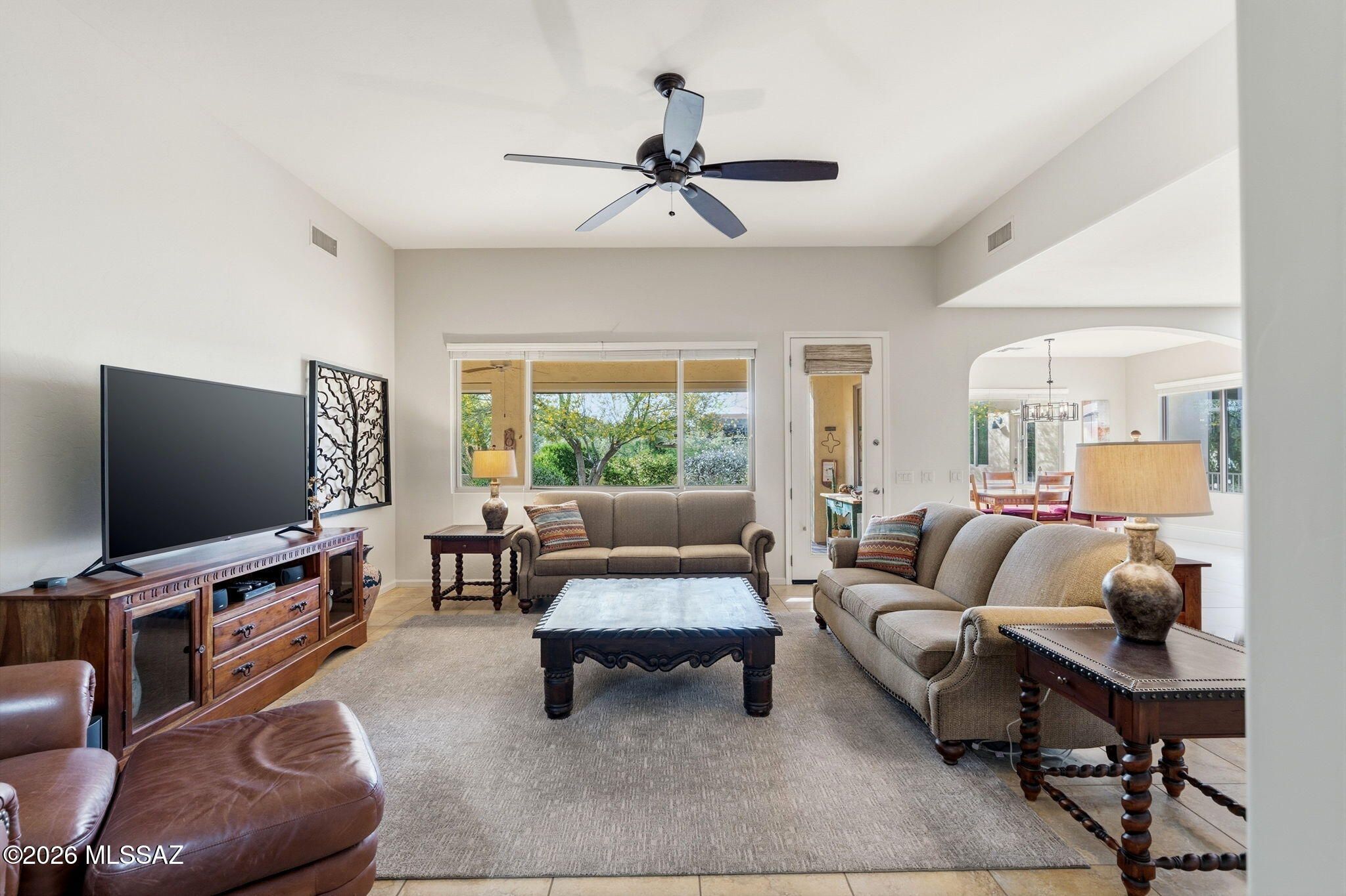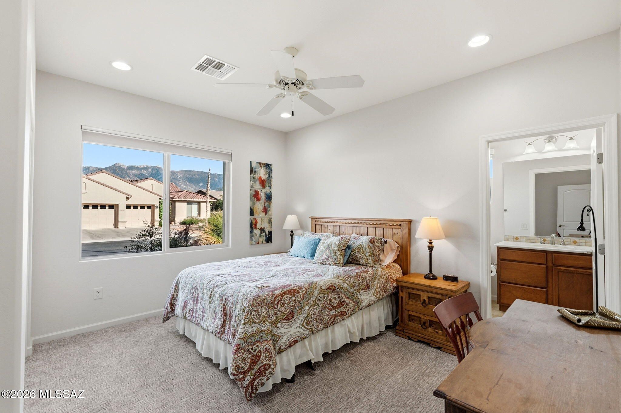 Located in the highly sought-after SaddleBrooke 55+ active adult community, this stunning 2,369 sq ft property offers the perfect blend of comfort, functionality, and Arizona lifestyle living. The main home features 2BD/2.5BA, plus a detached 1BD/1BA casita--ideal for guests, a private studio, or hobby space. Step inside to an inviting open-concept floor plan that seamlessly connects the living and dining areas to a chef's kitchen, complete with granite countertops, abundant cabinetry, and newer appliances, including an induction cooktop. The spacious owner's suite provides a relaxing retreat with a large walk-in closet and an oversized walk-in shower. A private guest room with ensuite bath ensures comfort and privacy for visitors, while the den--featuring custom built-in wall units--offer