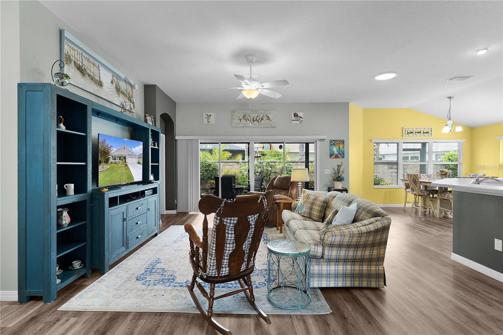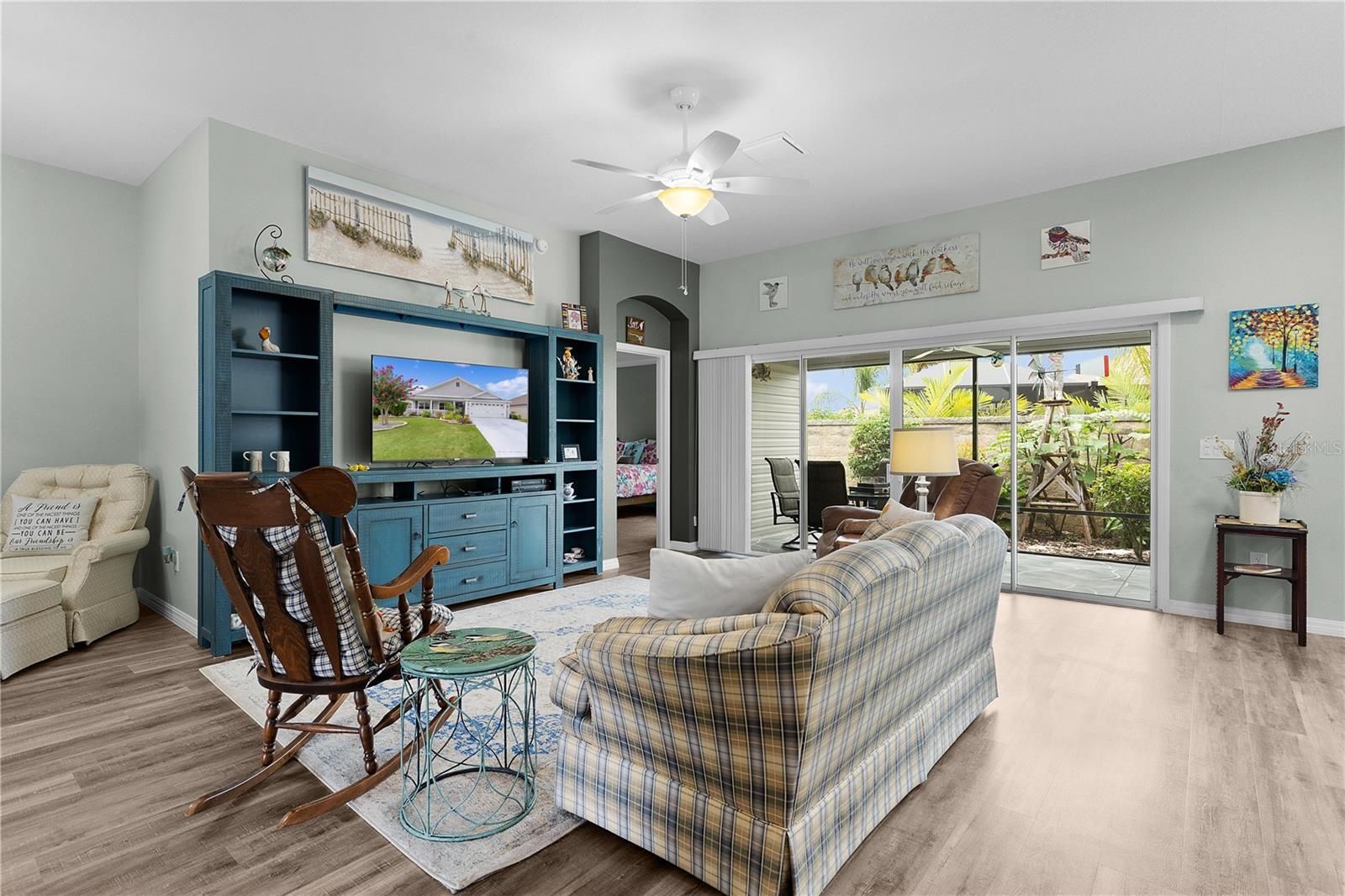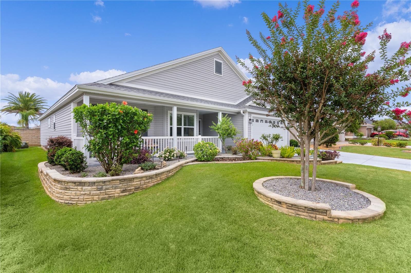 NEW LOWER PRICE! This GORGEOUS 3/2 SYCAMORE IN OSCEOLA HILLS SOARING EAGLE offers the perfect blend of comfort, privacy, and location. Enjoy peaceful mornings on the FRONT PORCH and evening on the PRIVATE SCREENED LANAI (backs to stone wall--no rear neighbors!). The OPEN FLOOR PLAN features a spacious great room, SOLAR TUBES for natural light, and one of the most sought-after kitchens in The Villages with STACKED CABINETS, CENTER ISLAND, POT DRAWERS, PANTRY, BAR & DINING AREA! YOU must come see the space this KITCHEN & GREAT ROOM PROVIDE!! PRIMARY SUITE boasts TWO WALK-IN CLOSETS, DUAL VANITIES, and ROMAN SHOWER. Two guest rooms are separate from Primary, both have closets and ceiling fan, one has a second enclosure by pocket door to access the hall bath. Other highlights include LUXURY PLANK VINYL FLOORING, LARGE LAUNDRY w/UTILITY SINK, EPOXIED garage floor, STACKED STONE LANDSCAPING and low maintenance yard designed to attract butterflies. Just minutes from Burnsed Rec Center, Rohan Regional Rec Center, golf, pools, pickleball, tennis and endless activities. Active neighborhood with monthly socials and endless opportunities for your active lifestyle. Bond Balance: $17,587.62 COULD BE SOLD TURNKEY w/seller reserving about 10 items plus stored items in garage