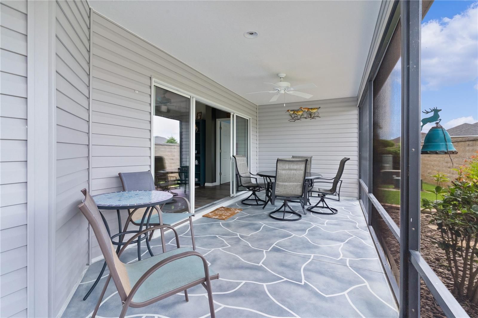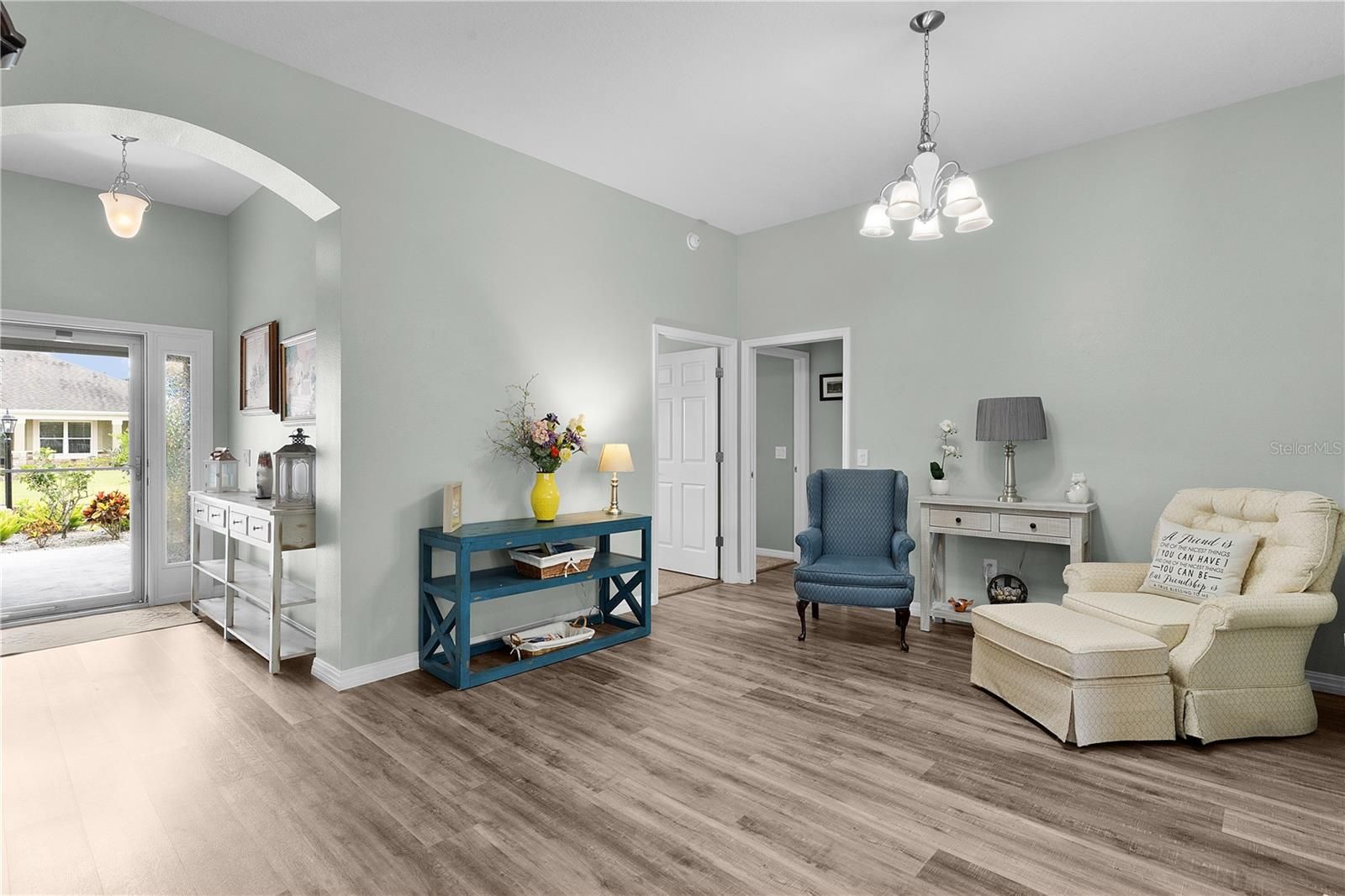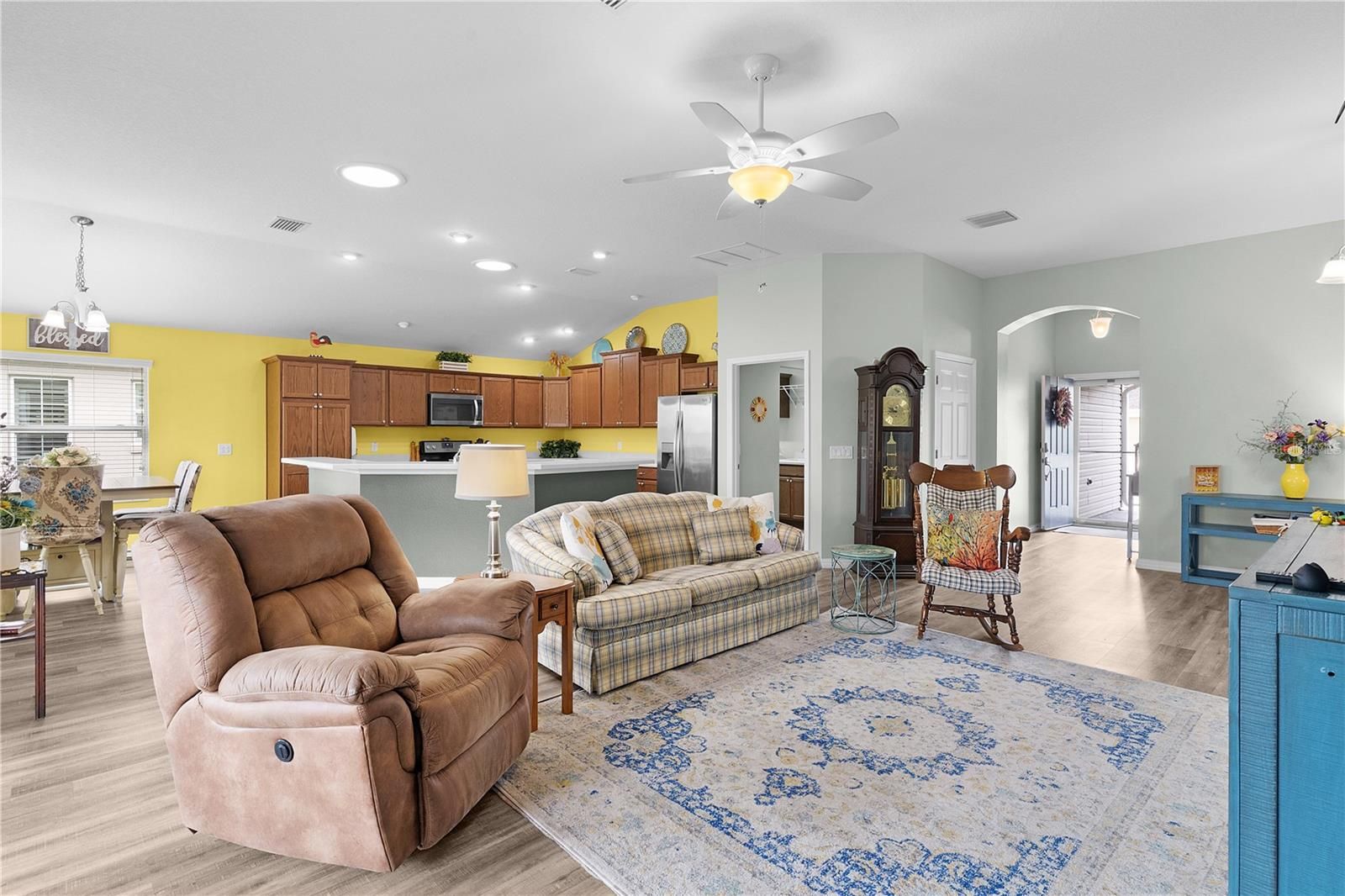 NEW LOWER PRICE! This GORGEOUS 3/2 SYCAMORE IN OSCEOLA HILLS SOARING EAGLE offers the perfect blend of comfort, privacy, and location. Enjoy peaceful mornings on the FRONT PORCH and evening on the PRIVATE SCREENED LANAI (backs to stone wall--no rear neighbors!). The OPEN FLOOR PLAN features a spacious great room, SOLAR TUBES for natural light, and one of the most sought-after kitchens in The Villages with STACKED CABINETS, CENTER ISLAND, POT DRAWERS, PANTRY, BAR & DINING AREA! YOU must come see the space this KITCHEN & GREAT ROOM PROVIDE!! PRIMARY SUITE boasts TWO WALK-IN CLOSETS, DUAL VANITIES, and ROMAN SHOWER. Two guest rooms are separate from Primary, both have closets and ceiling fan, one has a second enclosure by pocket door to access the hall bath. Other highlights include LUXURY PLANK VINYL FLOORING, LARGE LAUNDRY w/UTILITY SINK, EPOXIED garage floor, STACKED STONE LANDSCAPING and low maintenance yard designed to attract butterflies. Just minutes from Burnsed Rec Center, Rohan Regional Rec Center, golf, pools, pickleball, tennis and endless activities. Active neighborhood with monthly socials and endless opportunities for your active lifestyle. Bond Balance: $17,587.62 COULD BE SOLD TURNKEY w/seller reserving about 10 items plus stored items in garage