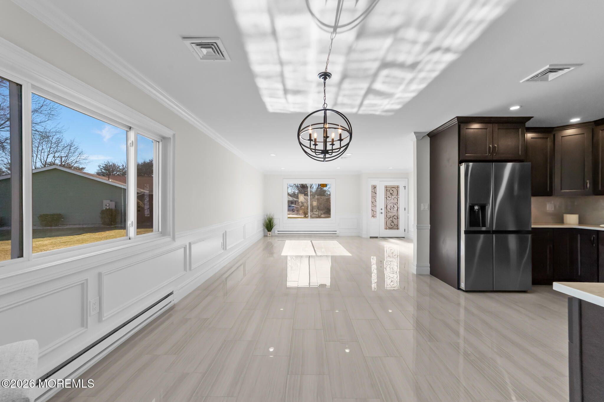 A Truly Exceptional Residence in Clearbrook 55+ Welcome to one of Clearbrook's most impressive homes, gracefully set on a quiet cul-de-sac. From the moment you arrive, the custom entry door invites you into a light-filled, open-concept layout designed for both comfort and elegance. Exquisite tile flooring, detailed wainscoting, custom millwork, and recessed lighting create a timeless and upscale ambiance throughout the main living spaces. The designer kitchen is a showstopper, featuring bespoke cabinetry with thoughtfully designed storage including lazy Susans, a built-in spice rack, and concealed pull-out trash bin. Quartz countertops, a matching tile backsplash, a large stainless steel sink, upgraded appliances, and curated custom lighting complete this refined culinary space. The expansive family room flows seamlessly to sliding glass doors that open to a stunning paver patioan ideal setting for entertaining or enjoying peaceful outdoor moments. The luxurious primary suite offers a serene retreat, complete with a custom spa-inspired en-suite bath featuring a walk-in shower and generous closet space. The second bedroom is perfect for guests and boasts an impressive 9 feet of closet storage. The third bedroom provides flexible living options, ideal as a home office, den, or private sitting room. A beautifully appointed main bath with tub/shower serves guests with comfort and style. Residents enjoy access to Clearbrook's exceptional clubhouse amenities, including a state-of-the-art wood shop, ceramics studio, card rooms, billiards, pickleball, bocce, and much more. Low taxes and truly carefree livingHOA includes water, sewer, trash, snow removal, and professional landscaping. This is refined 55+ living at its finest.