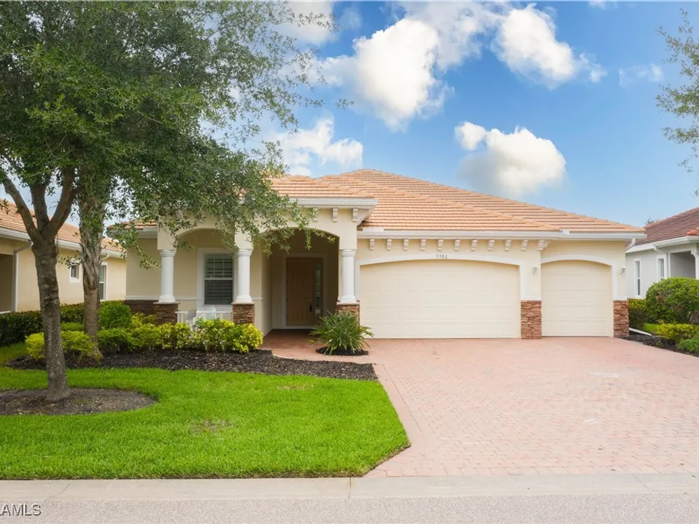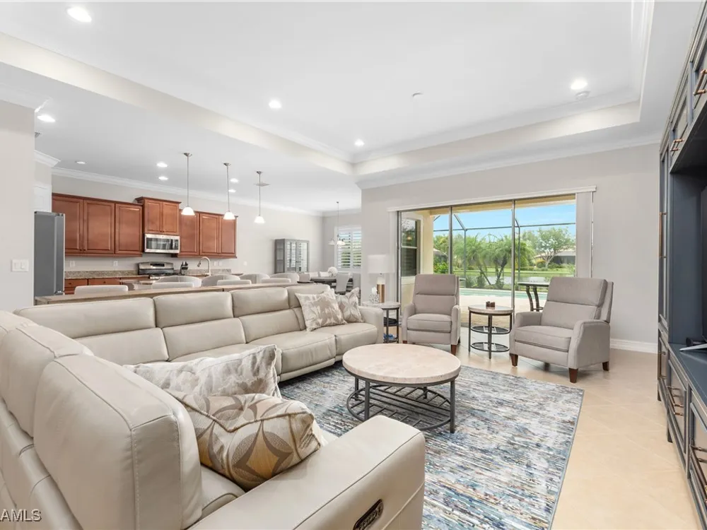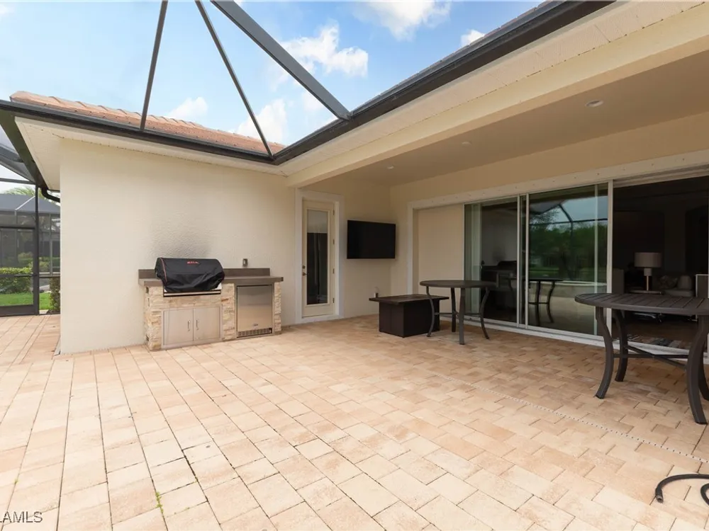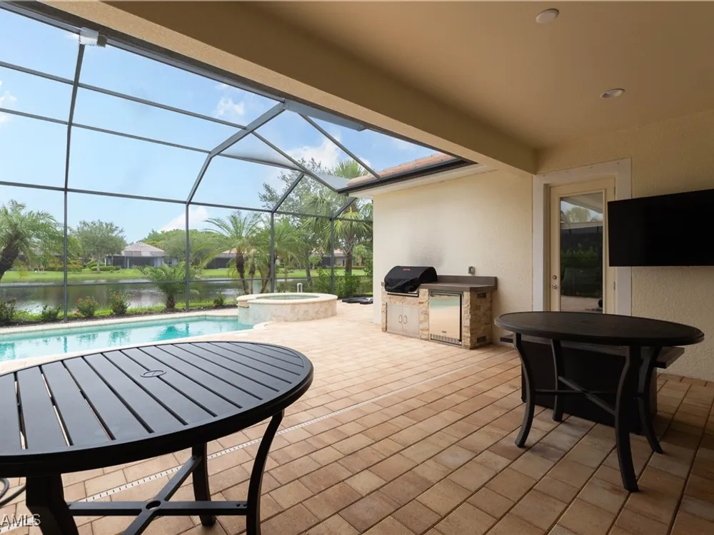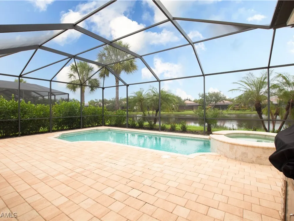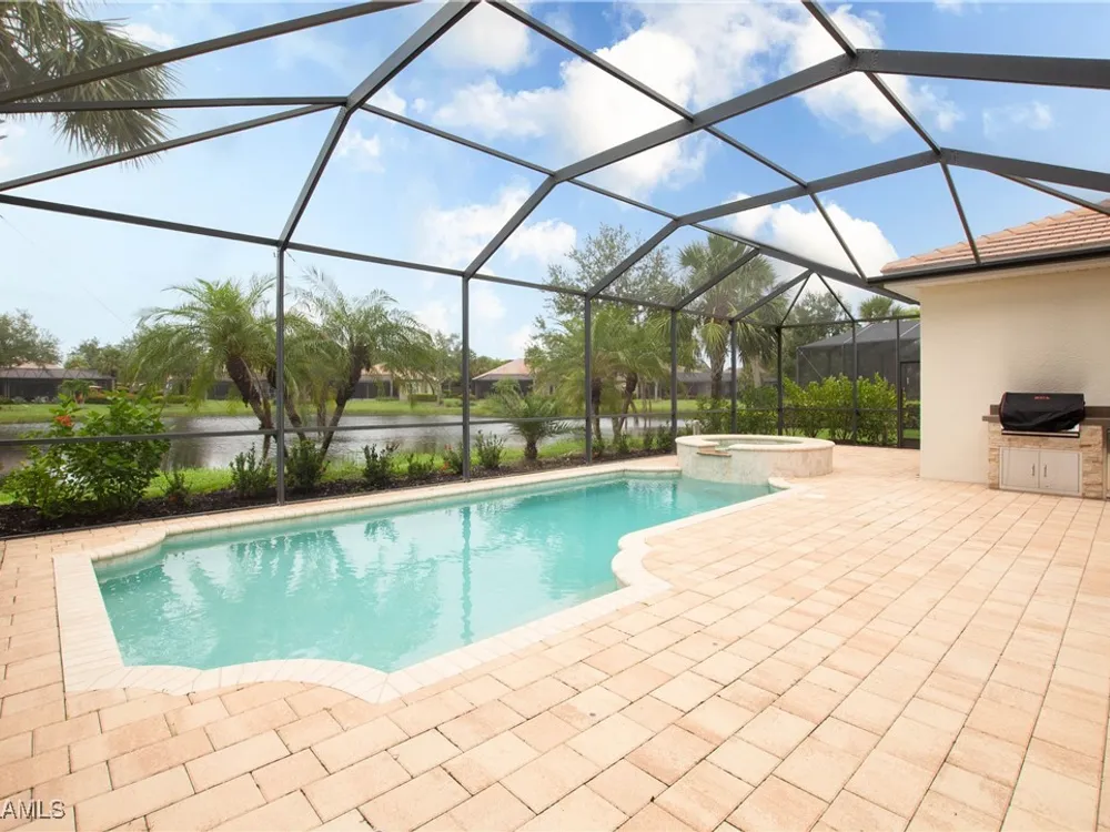 This PARTIALLY FURNISHED beautiful POOL home features 3 bedrooms, 3 bathrooms, an attached 3 car garage and a wide open floor plan. The seller has taken this house from builders grade to custom. It features nearly 2600 sq ft of living space, new wood floors were installed in all the bedrooms, fixtures were replaced and the 3 car garage has a new custom epoxy floor applied. Boasting high tray ceilings, custom lights, PLANTATION SHUTTERS, crown molding, an OUTDOOR KITCHEN, custom ceiling fans, CUSTOM CLOSETS and much much more ... this home is a show piece. The kitchen has STAINLESS STEEL and an eat in kitchen with an open view of the entire main living area. The exterior of the house was repainted. Note: The large lanai has a HEATED POOL AND HOT TUB, overlooks a gorgeous fresh water lake, has a NEW OUTDOOR KITCHEN and a large lanai to accompany all your guests. Verandah has created a wonderful lifestyle with two 18-hole championship golf courses, tennis courts, a state-of-the-art fitness center, a community pool, pickleball, and bocce ball courts....there's even a Doggy Park for man's best friend. For those who love outdoor activities, how about venturing out and KAYAKING on the adjacent ORANGE RIVER, or going for a nice bike ride or walk on the 9+ miles of trails? Verandah is conveniently located to Downtown Ft Myers, the Caloosahatchee River, and both the Ft Myers and Punta Gorda Airports.