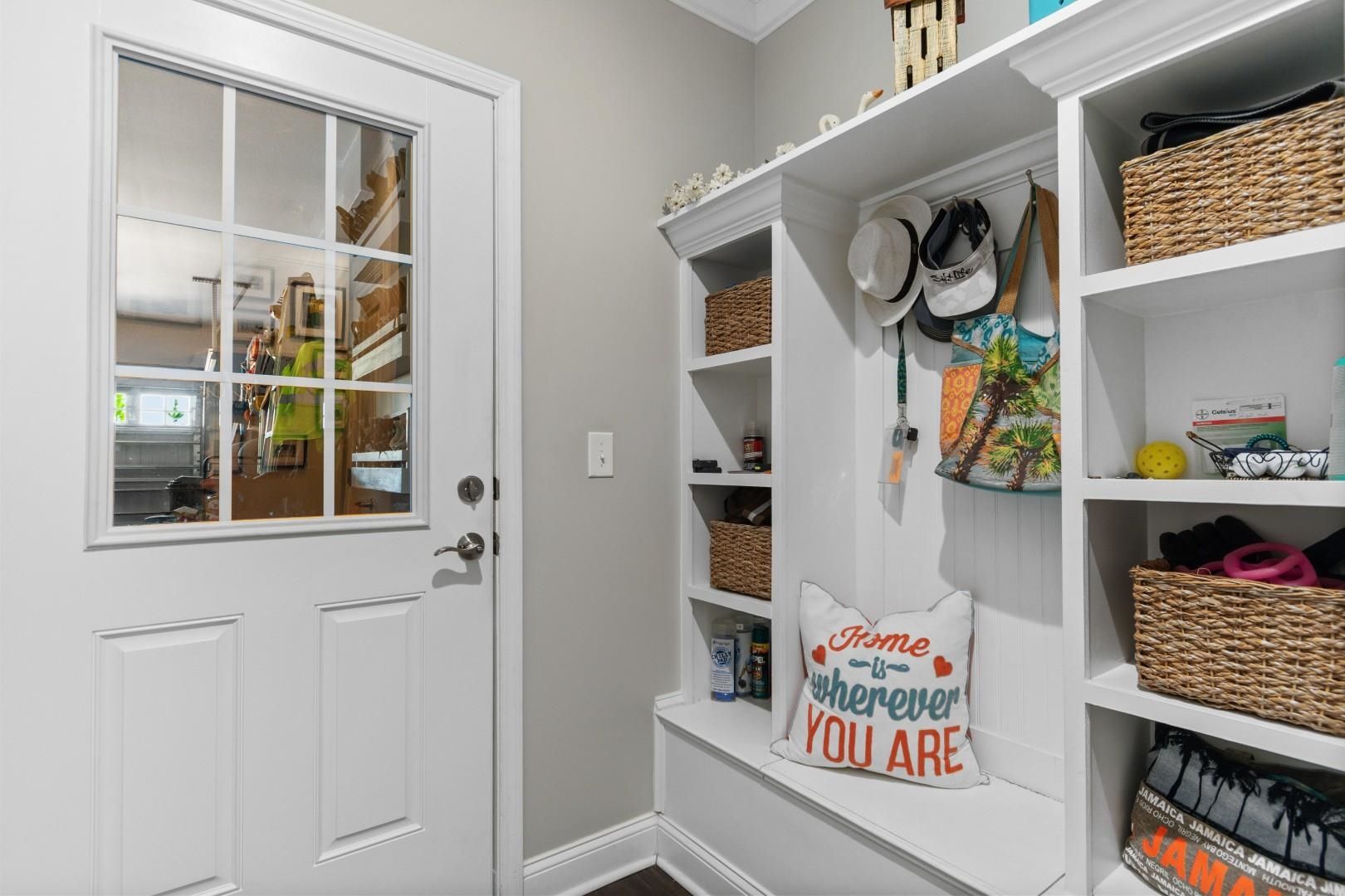 - Attic Access, Tray Ceiling(s), Ceiling Fan(s), Dual Sinks, LinenCloset, Main Level Primary, Pull Down Attic Stairs, Permanent Attic Stairs, Separate Shower, Vanity, Walk-In Closet(s), Window Treatments, Breakfast Bar, Bedroom on Main Level, Entrance Foyer, Kitchen Island, Stainless Steel Appliances, Solid Surface Counters