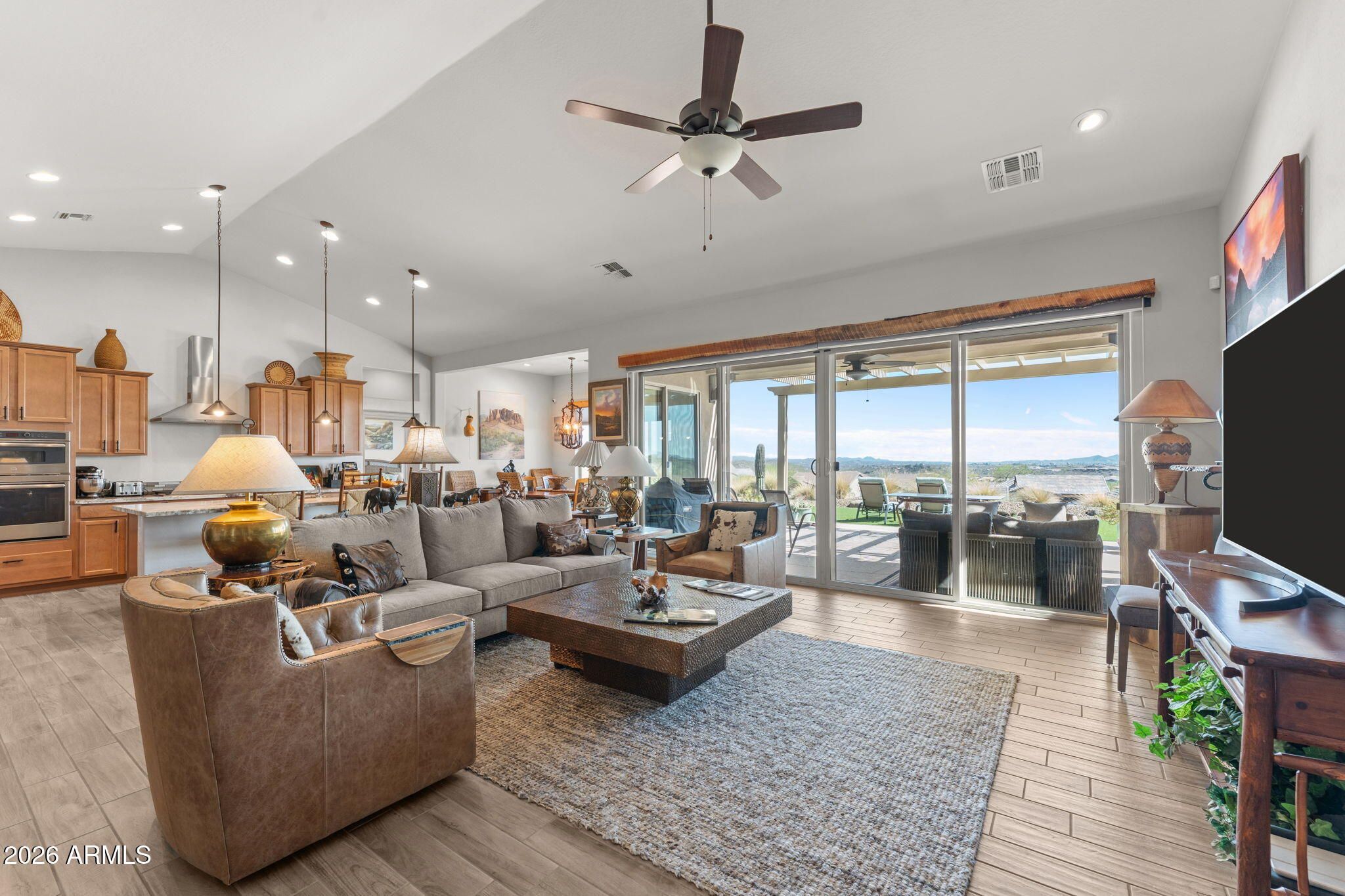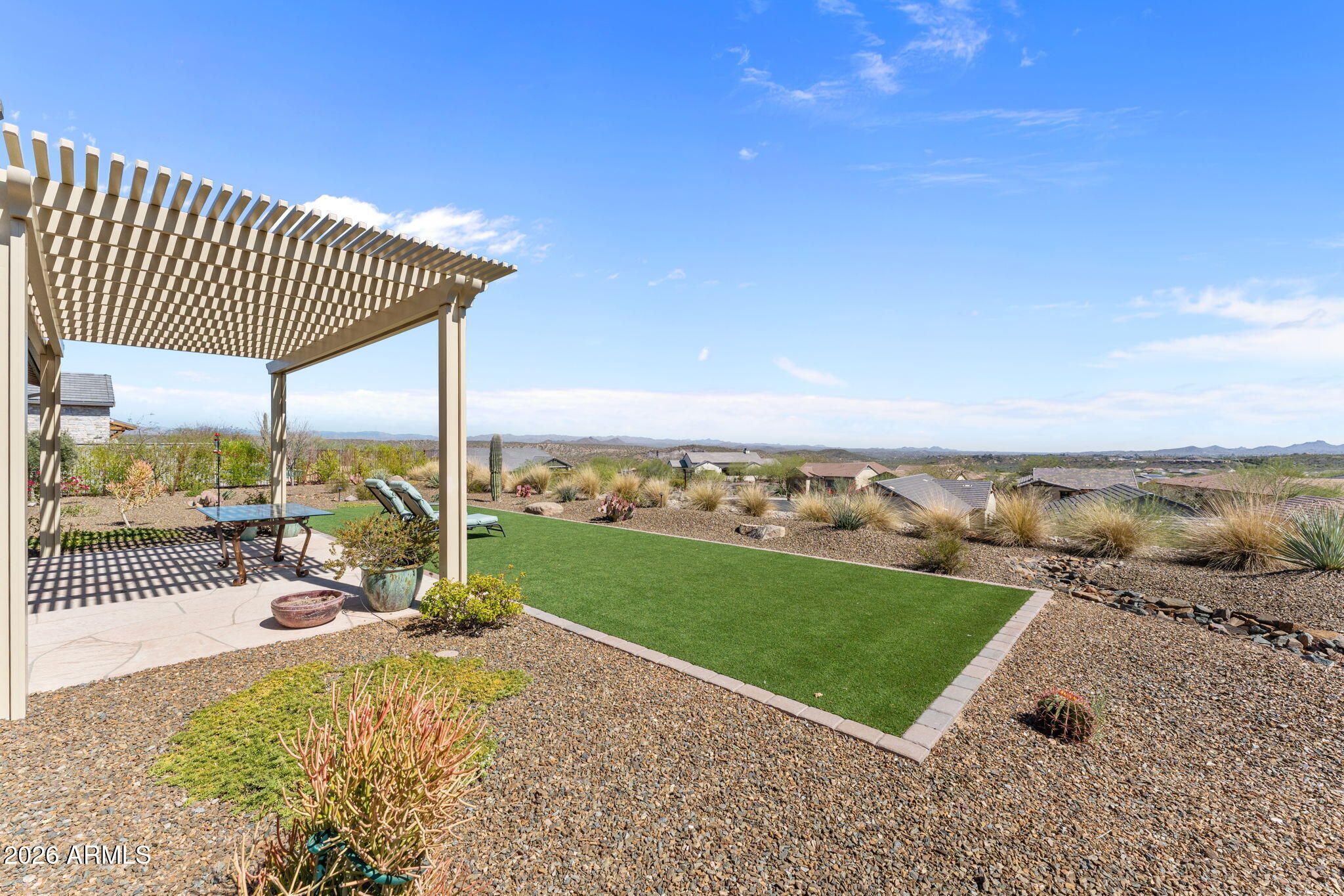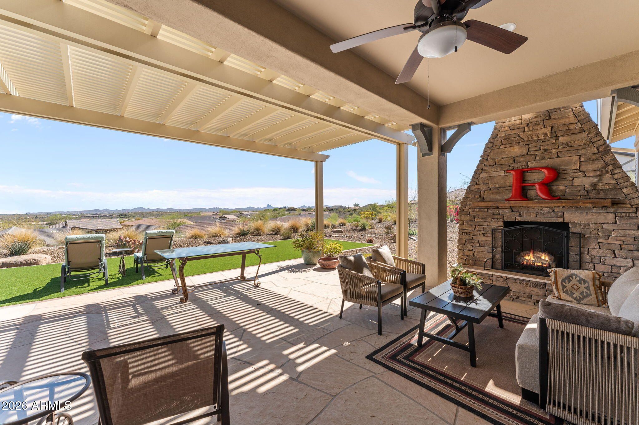 Set within the desirable Outlaw neighborhood of Wickenburg Ranch, this Wild Horses model captures the essence of relaxed desert living with a refined, modern edge. From the moment you arrive, the home's inviting presence and thoughtful design set the tone for what's inside. Step into an open-concept floor plan where natural light pours in through expansive windows and large sliding glass doors, creating a seamless connection between indoor and outdoor living. The great room flows effortlessly into a well-appointed kitchen, offering generous counter space, quality finishes, and a layout ideal for both everyday living and entertaining. The primary suite provides a quiet retreat, complete with a spacious layout and a well-designed en-suite bath. Additional bedrooms, separated by a barn door, offer flexibility for guests, hobbies, or an additional home office. Out back is where this home truly shines. The extended patio and pergola frame sweeping views that capture Arizona's breathtaking sunrises, while the stone gas fireplace creates a warm, inviting space to gather year-round. Whether you're enjoying a quiet morning or hosting friends in the evening, this outdoor setting delivers an exceptional lifestyle experience. Blending comfort, style, and functionality, this Wild Horses model offers a rare opportunity to enjoy elevated living in one of Wickenburg Ranch's most sought-after neighborhoods.