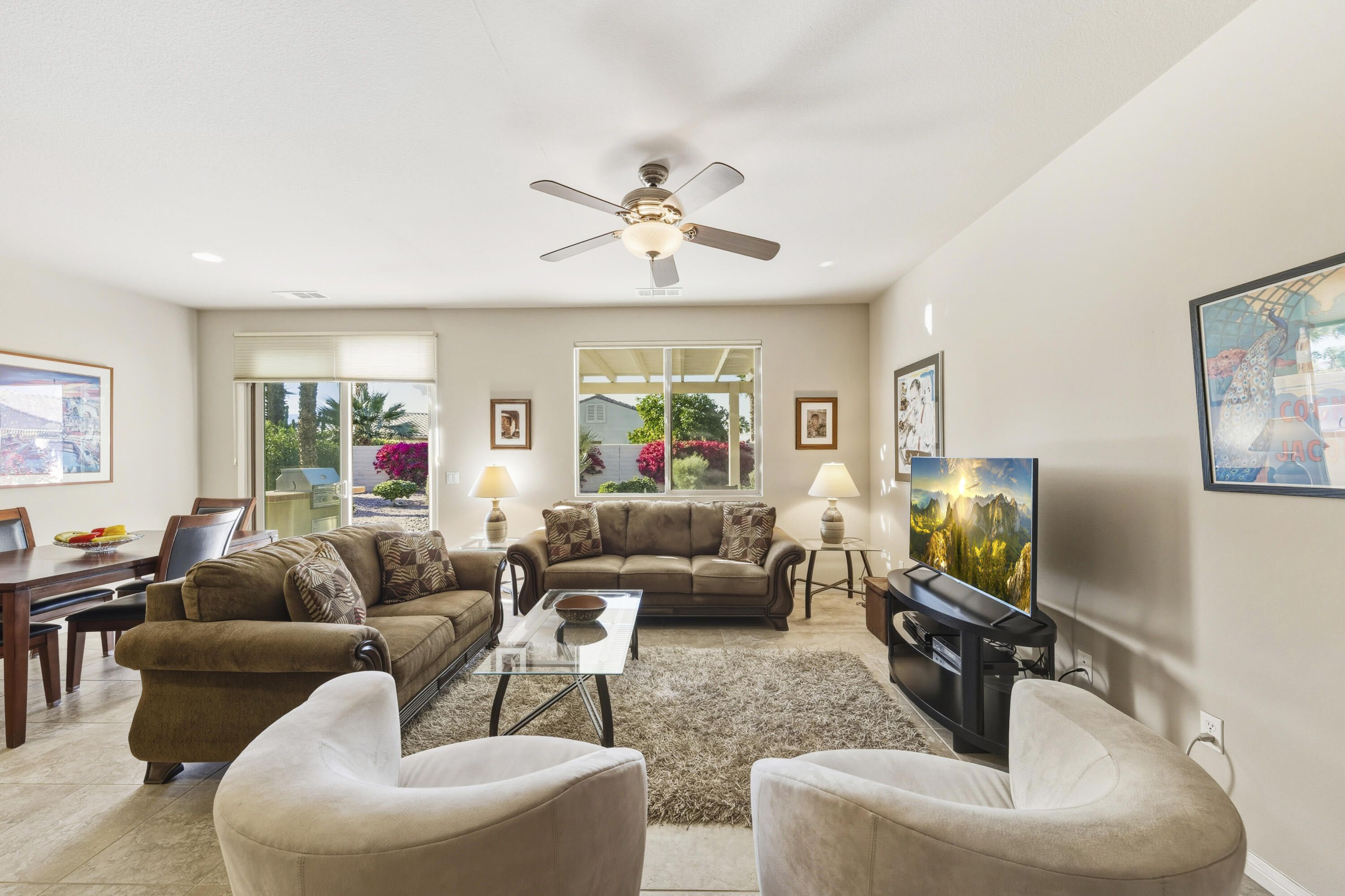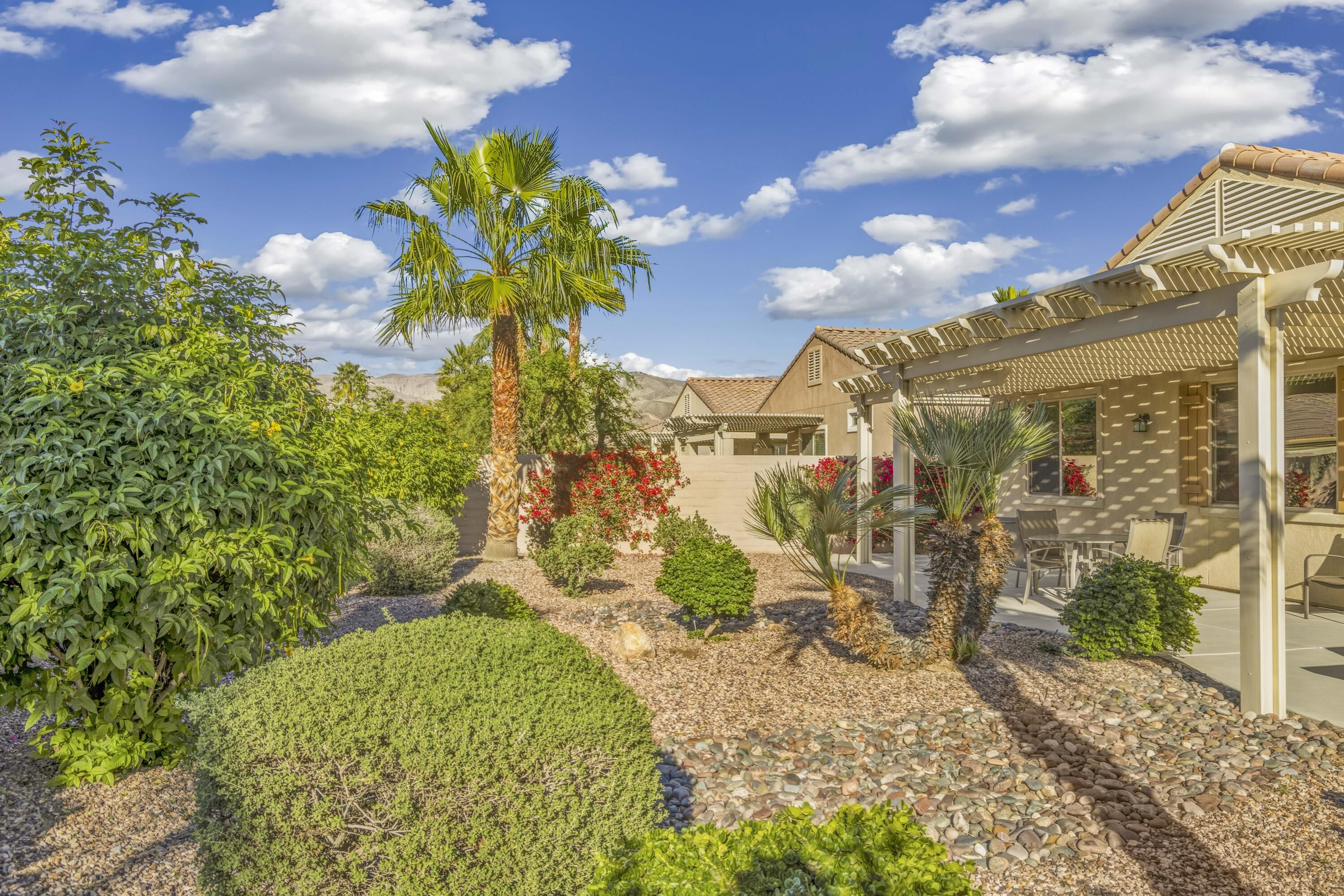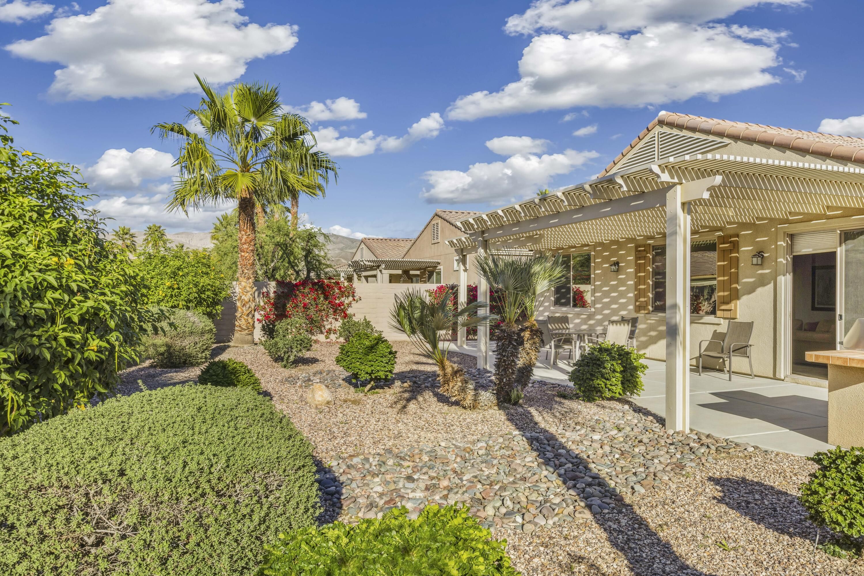 Don't miss this beautifully maintained ''Cordoba'' model located on a cul-de-sac in phase 3 of Sun City Shadow Hills. This contemporary 2 bedroom and 2 bathroom home features high ceilings with ceiling fans. It has an open kitchen with granite slab counters, pull-out shelving in cabinets, stainless steel appliances, 4 burner gas stove, newer refrigerator and microwave, under cabinet lighting and a pantry. There is tile flooring throughout most of the home with quality carpeting in the bedrooms. The great room and dining area, conveniently adjacent to the kitchen, look out to the rear yard. The large primary bedroom suite has a bathroom with granite counters, dual sinks, enclosed stall shower and large walk-in closet. The guest bedroom with privacy is located away from the primary bedroom, and the guest bathroom has granite counters, tub/shower and a linen closet. There is a large laundry room with front loading washer & dryer, with stands, a deep sink and plenty of storage that lead out to the garage with a tankless water heater. Enjoy the desert lifestyle while entertaining under the custom, covered, expanded patio and built-in BBQ. The meticulously landscaped large rear yard with fruit trees has views and plenty of room for a pool too! Shadow Hills is an ''active 55+ lifestyle community'' featuring 2 golf courses, 2 fitness centers, 2 clubhouses, 2 outdoor pools/spas and one indoor pool/spa, pickleball courts, tennis courts, bocce ball courts, billiard room, a ballroom, restaurant and numerous clubs and activities! Internet is also included in the low HOA dues. Don't miss this Great opportunity!!! Furnishings available outside of escrow...