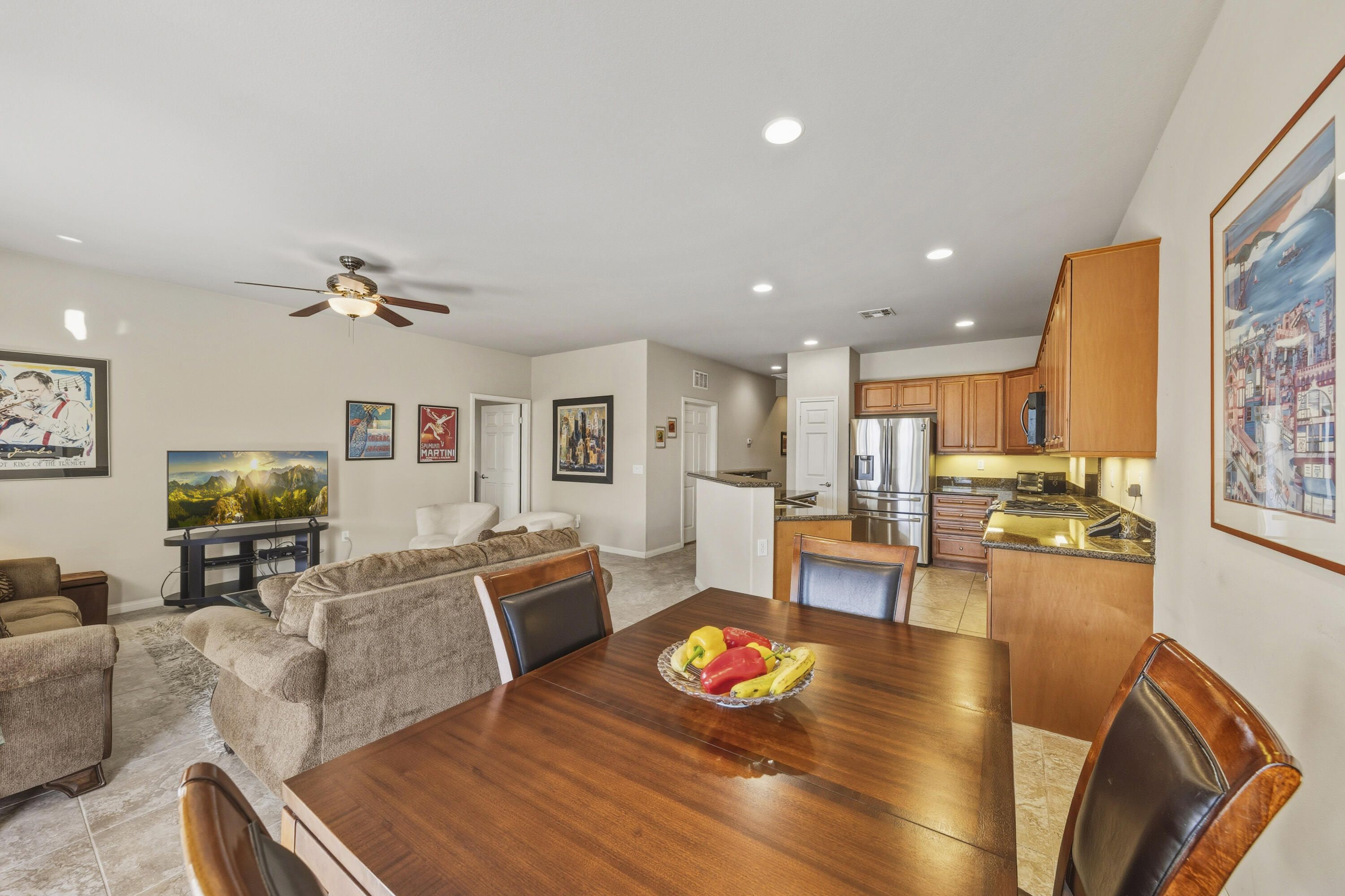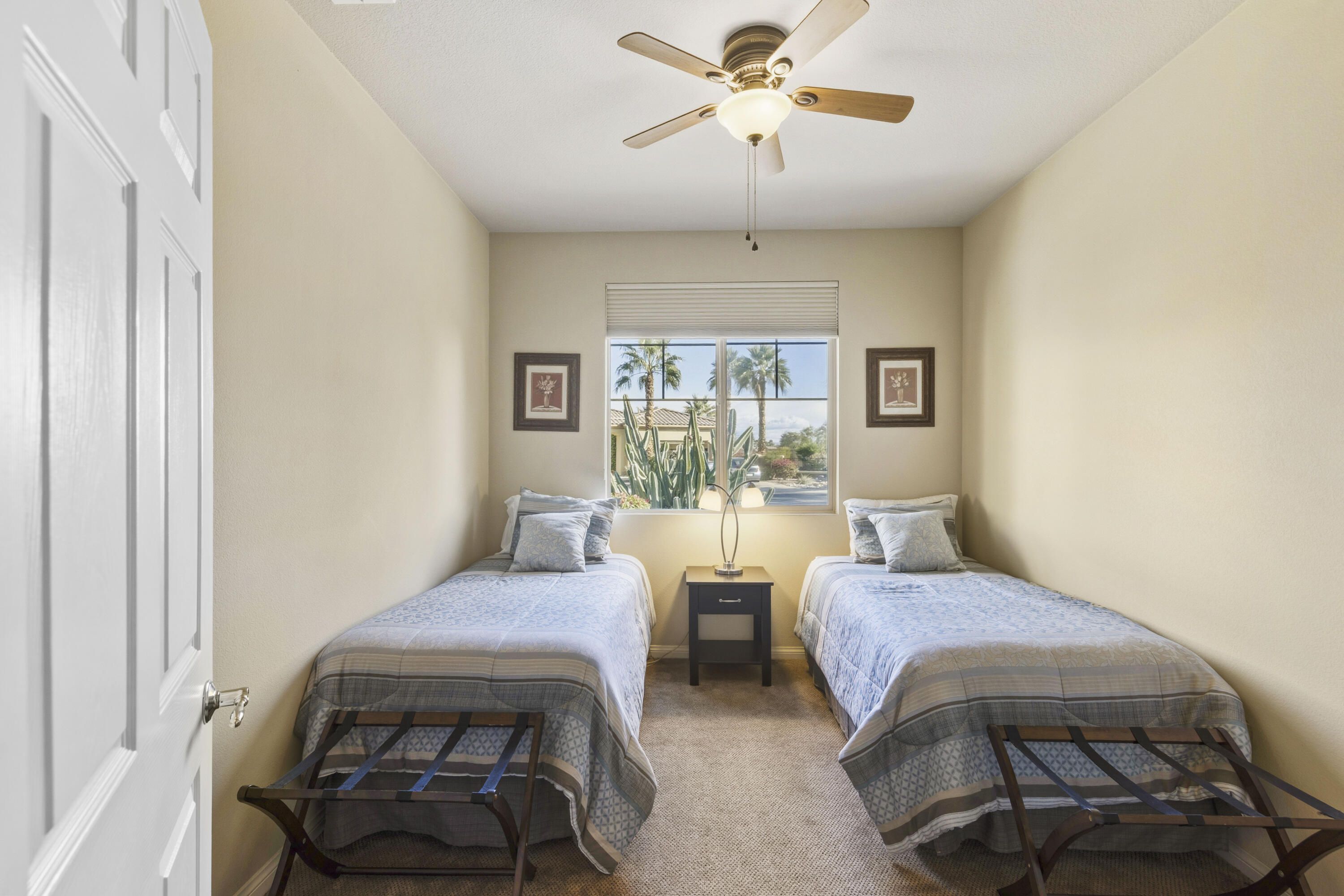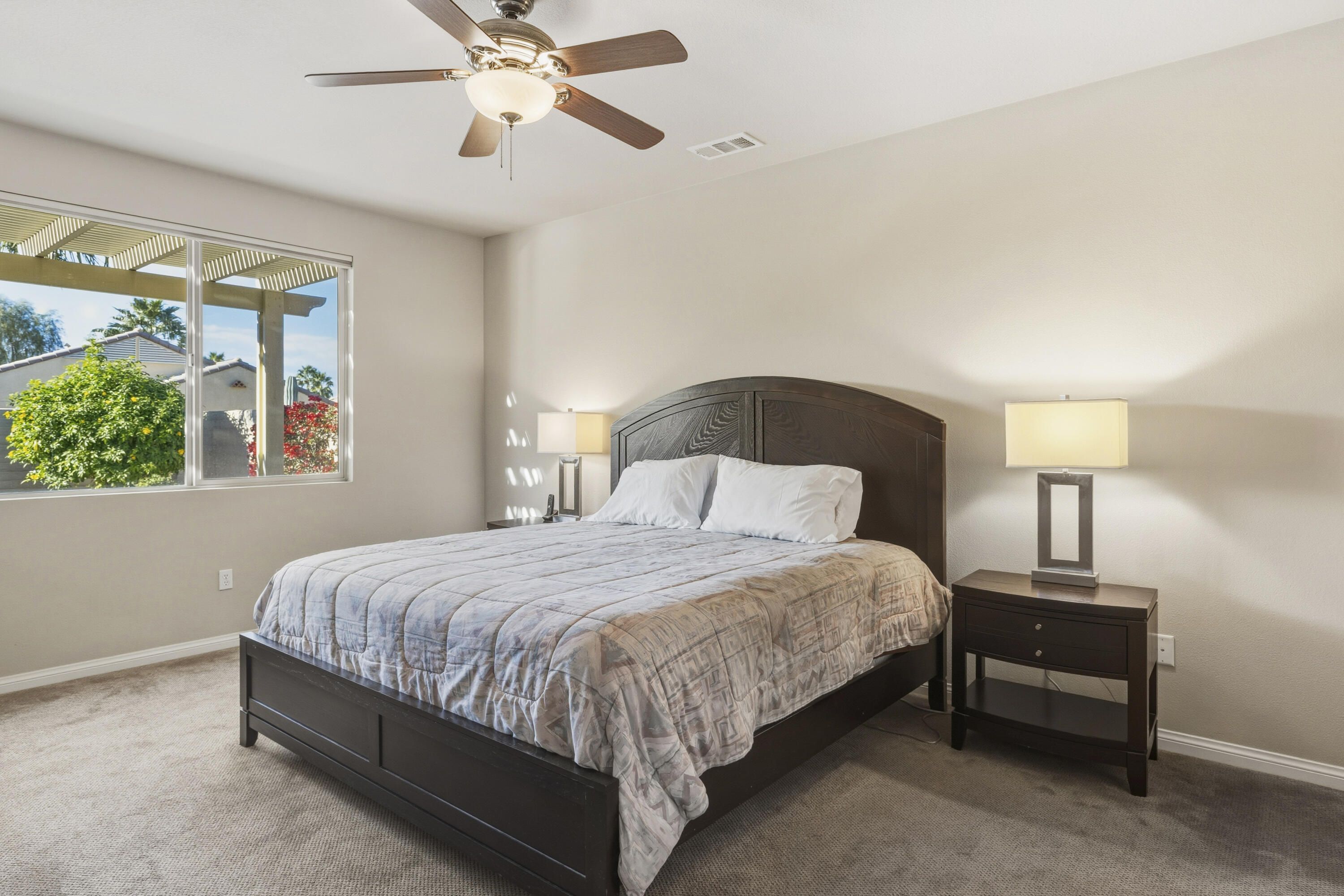 Don't miss this beautifully maintained ''Cordoba'' model located on a cul-de-sac in phase 3 of Sun City Shadow Hills. This contemporary 2 bedroom and 2 bathroom home features high ceilings with ceiling fans. It has an open kitchen with granite slab counters, pull-out shelving in cabinets, stainless steel appliances, 4 burner gas stove, newer refrigerator and microwave, under cabinet lighting and a pantry. There is tile flooring throughout most of the home with quality carpeting in the bedrooms. The great room and dining area, conveniently adjacent to the kitchen, look out to the rear yard. The large primary bedroom suite has a bathroom with granite counters, dual sinks, enclosed stall shower and large walk-in closet. The guest bedroom with privacy is located away from the primary bedroom, and the guest bathroom has granite counters, tub/shower and a linen closet. There is a large laundry room with front loading washer & dryer, with stands, a deep sink and plenty of storage that lead out to the garage with a tankless water heater. Enjoy the desert lifestyle while entertaining under the custom, covered, expanded patio and built-in BBQ. The meticulously landscaped large rear yard with fruit trees has views and plenty of room for a pool too! Shadow Hills is an ''active 55+ lifestyle community'' featuring 2 golf courses, 2 fitness centers, 2 clubhouses, 2 outdoor pools/spas and one indoor pool/spa, pickleball courts, tennis courts, bocce ball courts, billiard room, a ballroom, restaurant and numerous clubs and activities! Internet is also included in the low HOA dues. Don't miss this Great opportunity!!! Furnishings available outside of escrow...