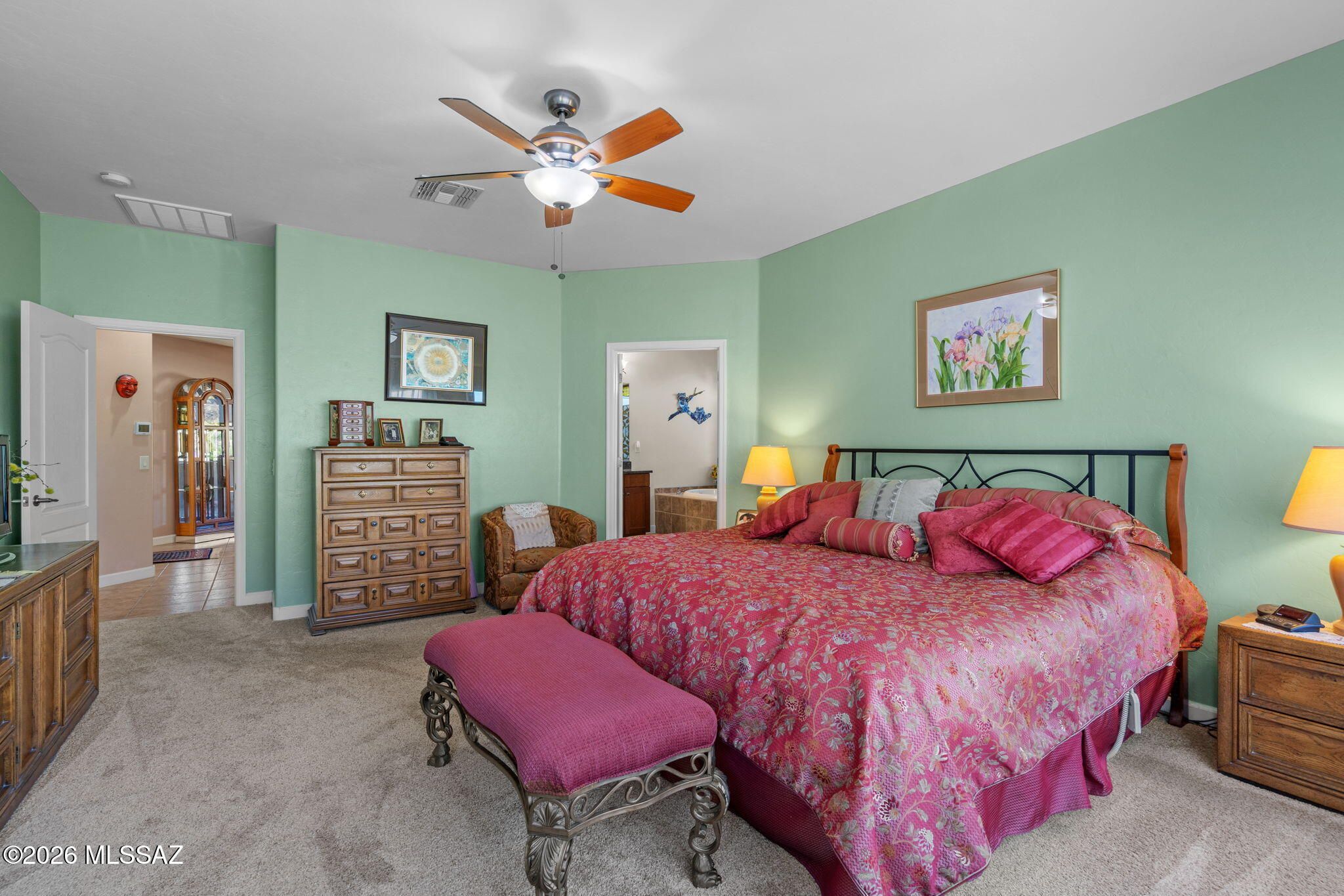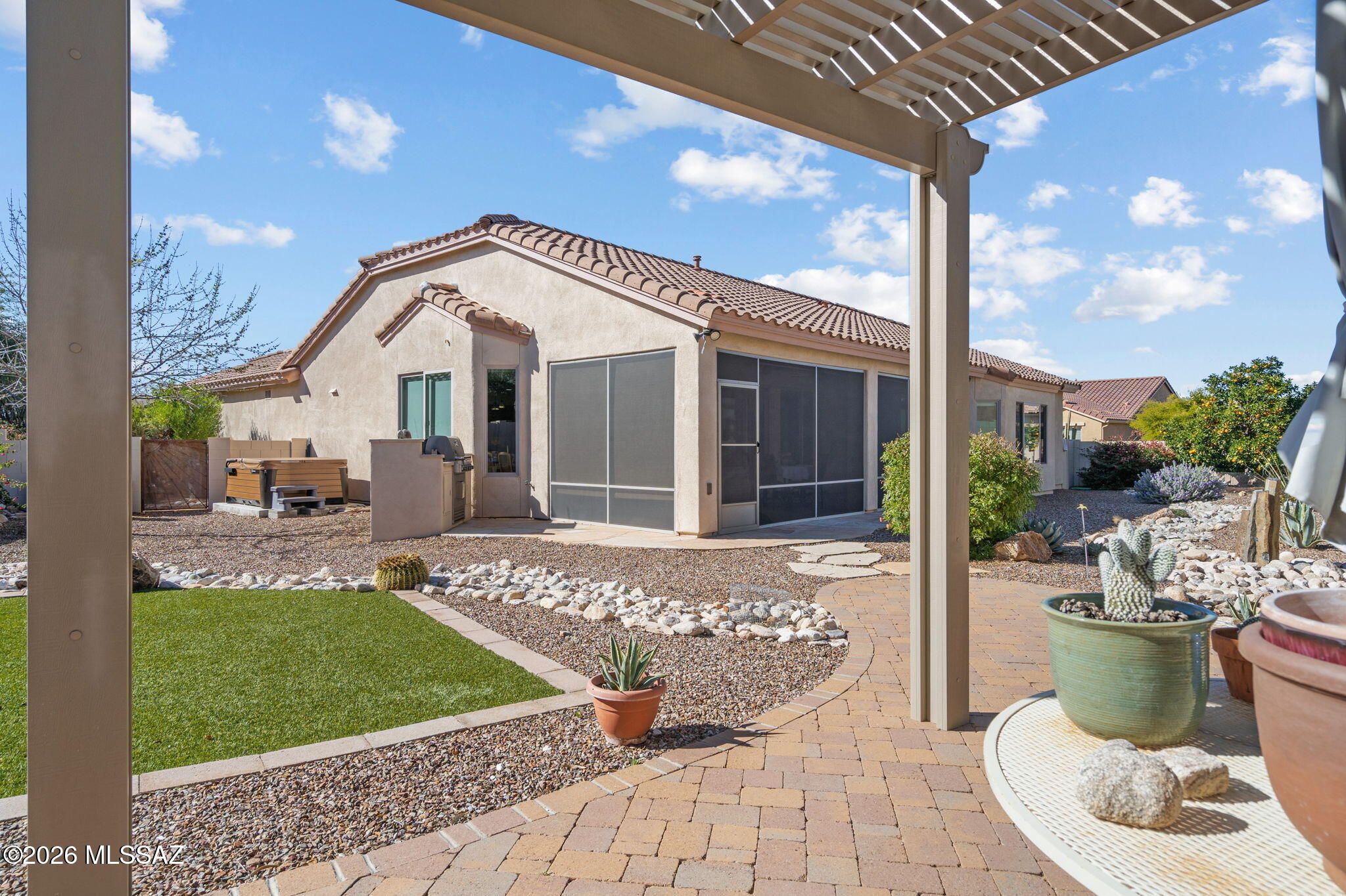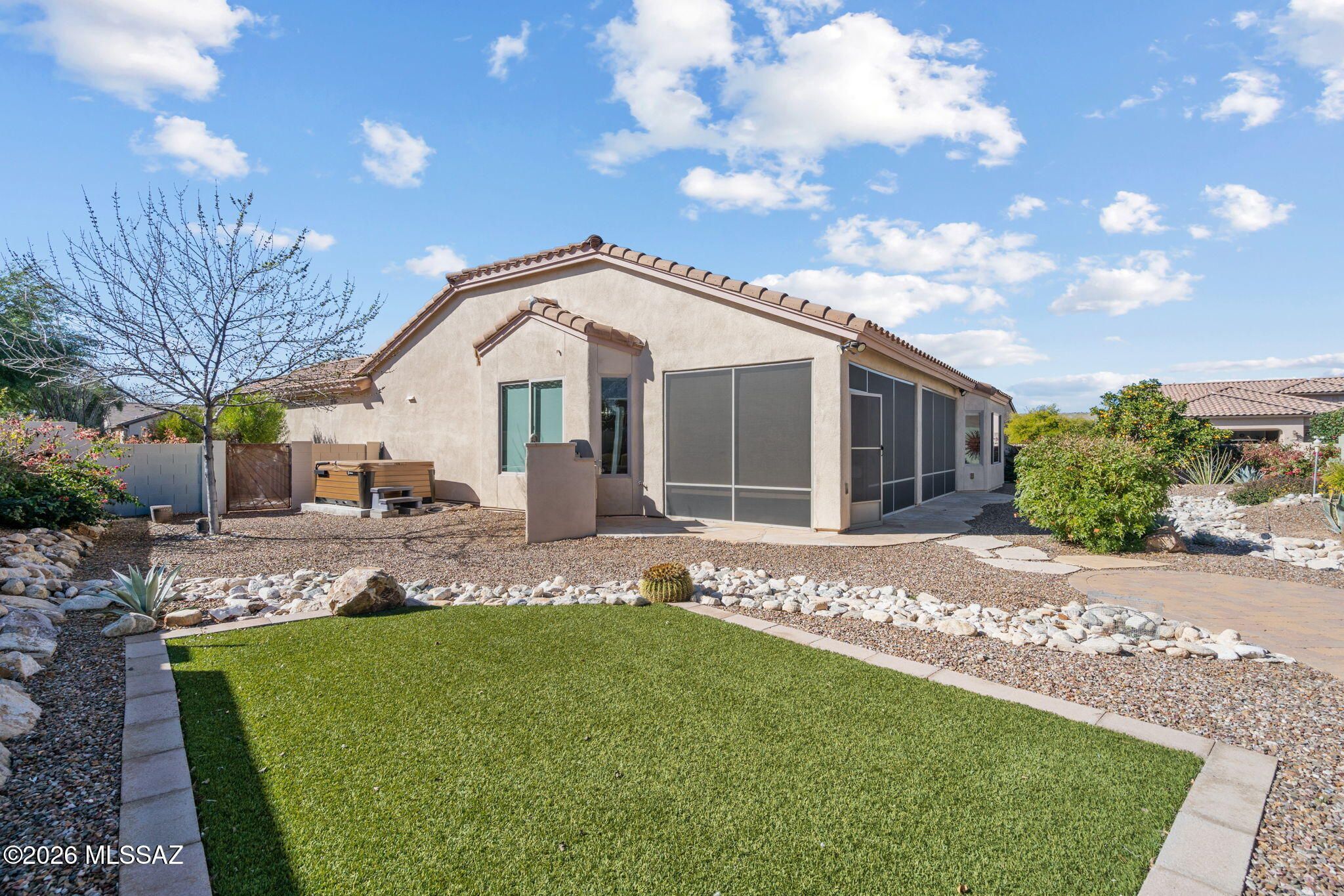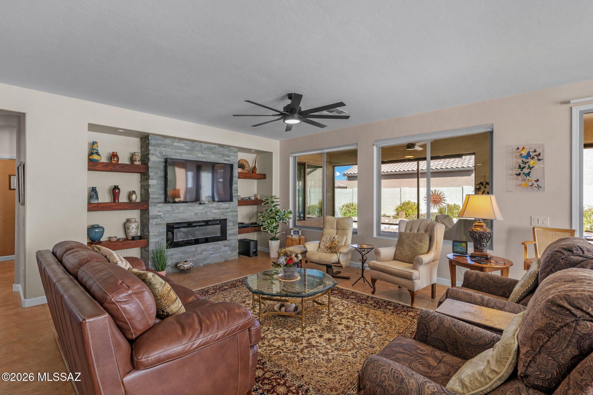 SELLER WILL ACCEPT OR COUNTER OFFERS $500,000 - $540,000. Pristine and beautifully cared for, this Talavera model with a private casita sits in one of SaddleBrooke's most desirable enclaves. The moment you step inside, the great room design opens up around you -- warm, inviting, and anchored by a stunning new stacked stone electric fireplace wall that instantly feels like home. The kitchen is designed for gathering, with a generous breakfast bar, rich Alderwood cabinetry, granite counters, stainless appliances, & a gas range that makes cooking a pleasure. The spacious primary suite offers a peaceful retreat w a soaking tub, separate shower, and dual vanities.Tile flooring throughout the main areas, plantation shutters, and thoughtful upgrades add comfort and style. The added Arizona room e