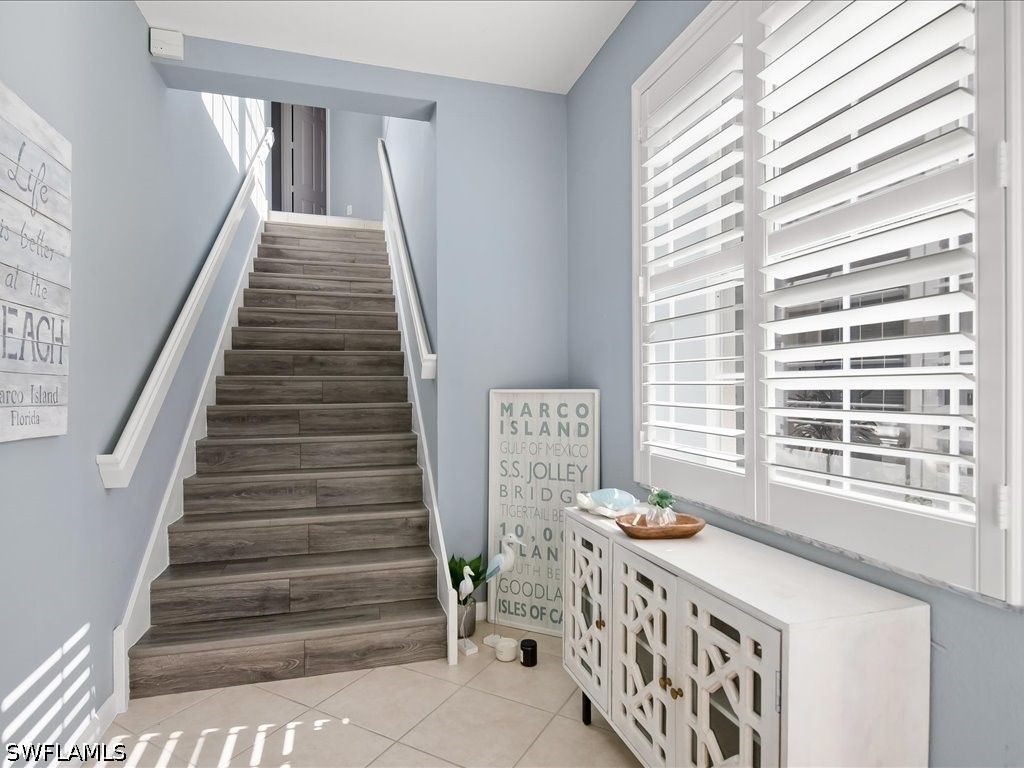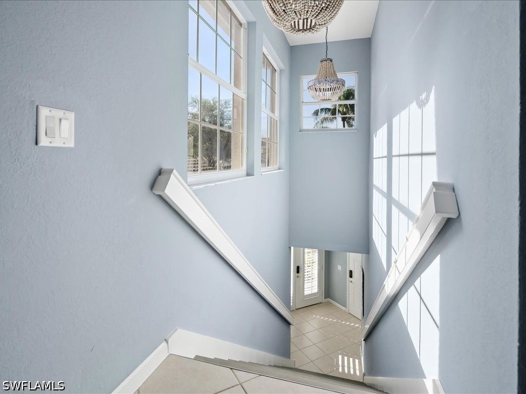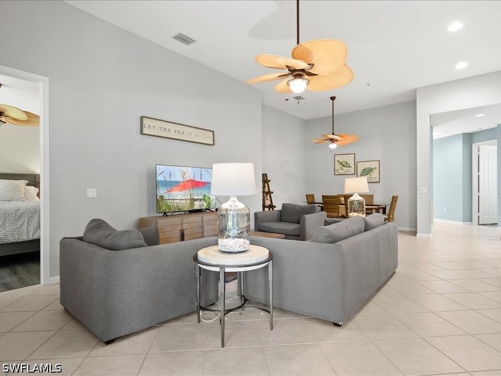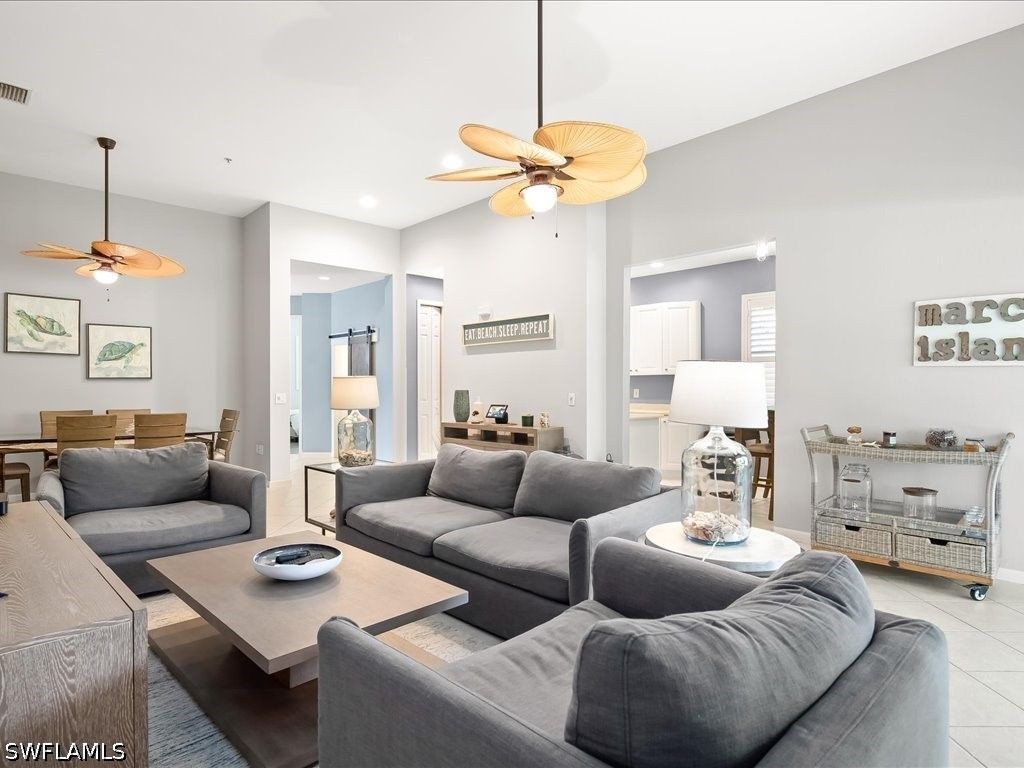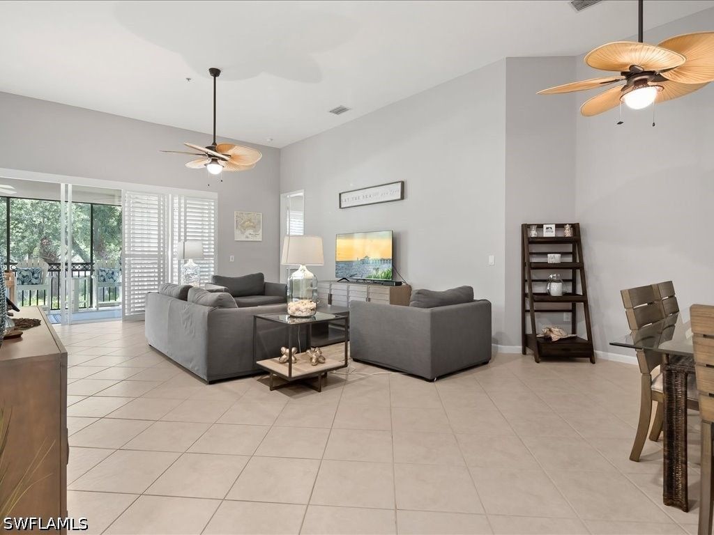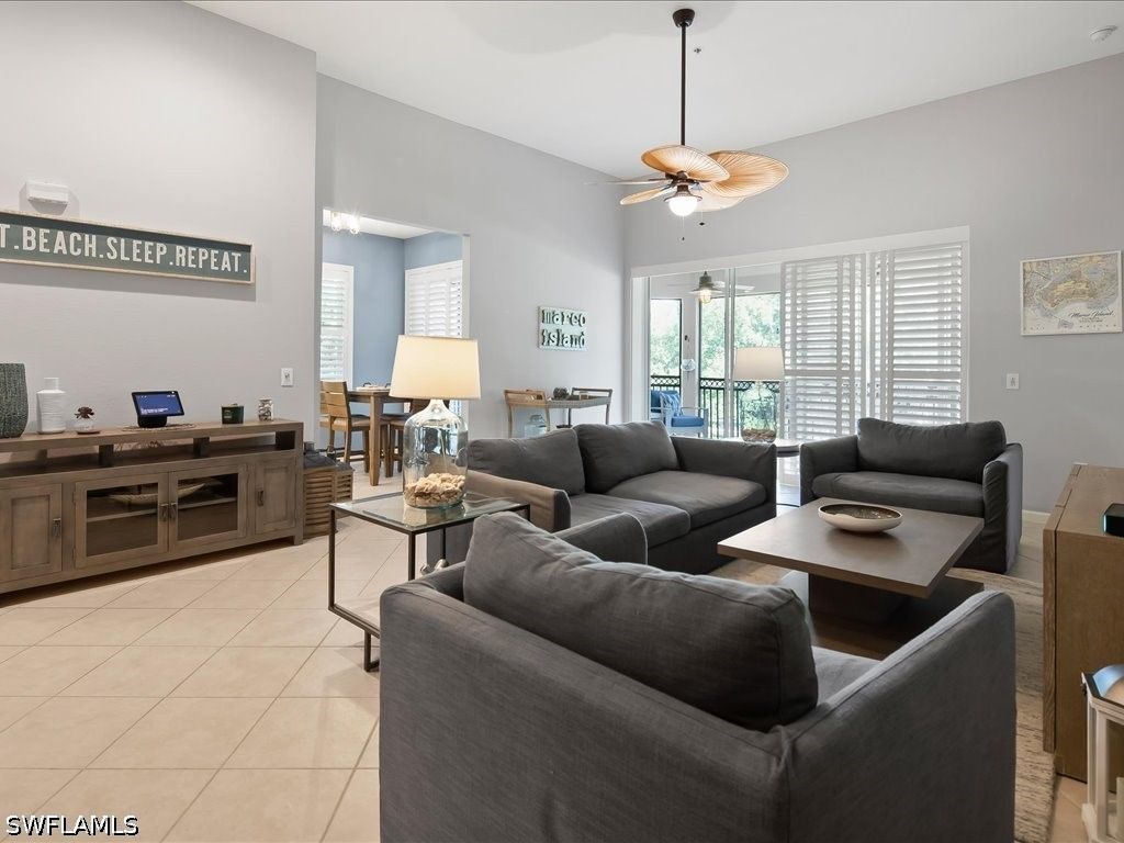 Located in the peaceful Deer Crossing village within the award-winning gated community of Fiddler's Creek, this beautifully maintained three-bedroom, two-bath Ironwood floor plan coach home offers the best of Southwest Florida living—ideal as a full-time residence or seasonal retreat. This move-in ready second-floor end-unit residence enjoys added natural light, privacy, and landscaped views. The spacious open-concept layout is designed for comfortable everyday living and effortless entertaining. Large sliding glass pocket doors open to the screened and tiled lanai, creating seamless indoor-outdoor living. Interior features include diagonal tile flooring in the main living areas, plantation shutters throughout, separate dining area, breakfast nook, and a well-appointed kitchen with quartz countertops, stainless steel appliances, pantry storage, and rare natural gas cooking. The private owner’s suite offers a walk-in closet, dual vanities, and a spacious bath layout. Additional highlights include a two-car garage with epoxy-coated floor, upgraded exterior lighting, refrigerator (2025), microwave (2020), exterior painting including lanai (2022), screened lanai replacement (2022), refreshed landscaping (2025), and A/C professionally serviced twice annually. Residents enjoy exceptional lifestyle amenities including a resort-style pool, clubhouse, fitness center, spa services, tennis, pickleball, dining, scenic walking and biking paths, and an active social calendar. Optional memberships are available for championship golf, marina, and private beach club access. Ideally located between downtown Naples and Marco Island, close to beaches, shopping, dining, and boating.