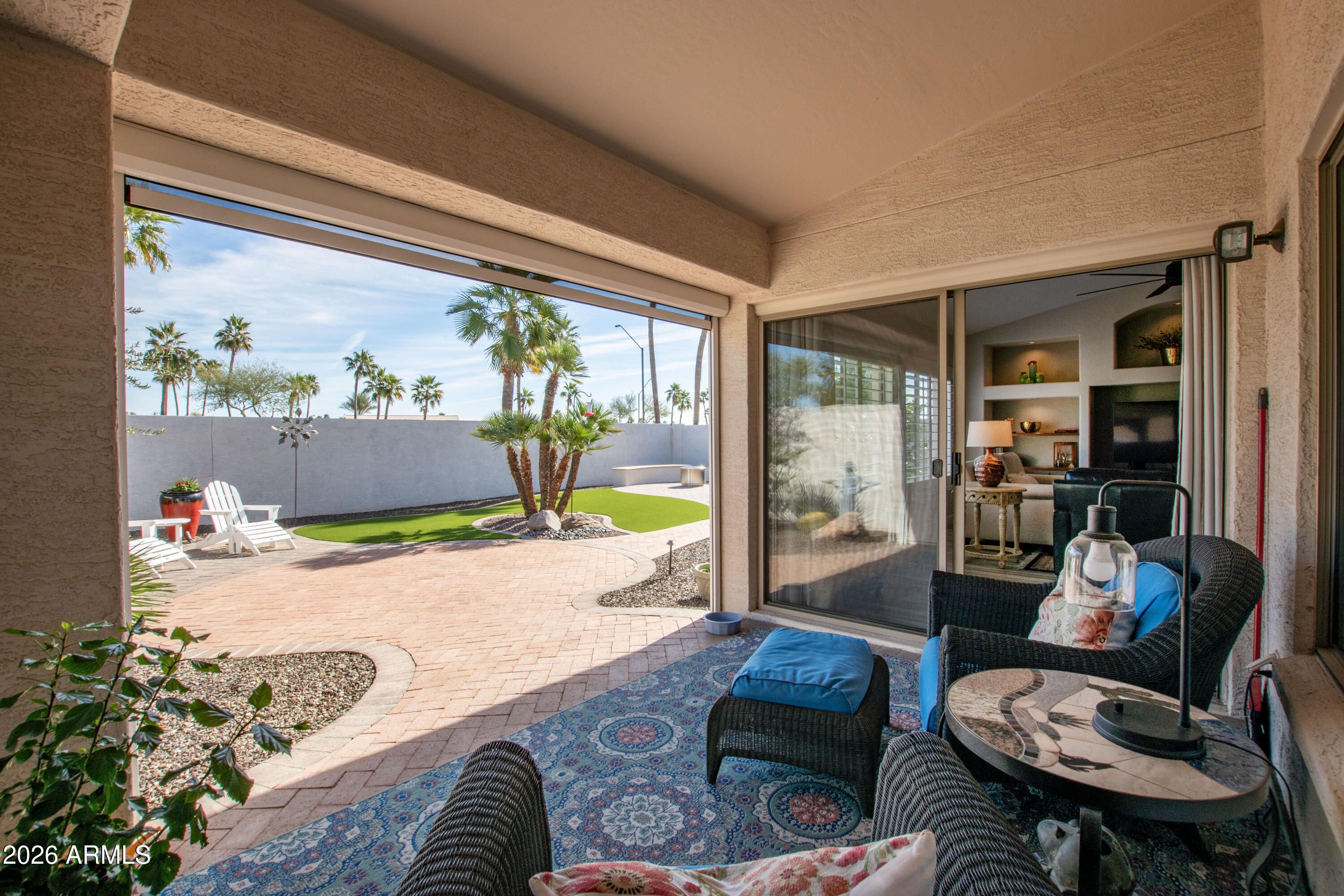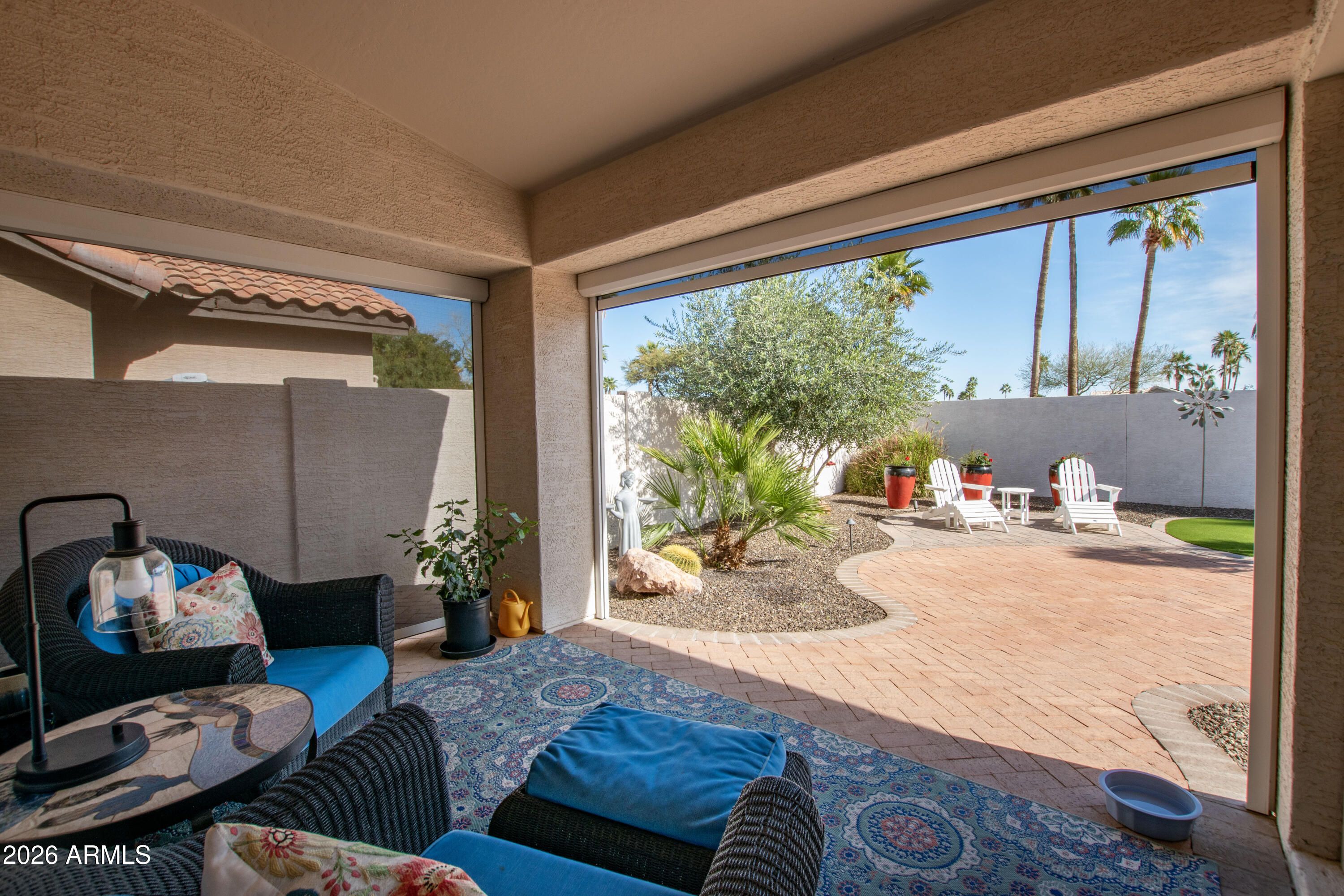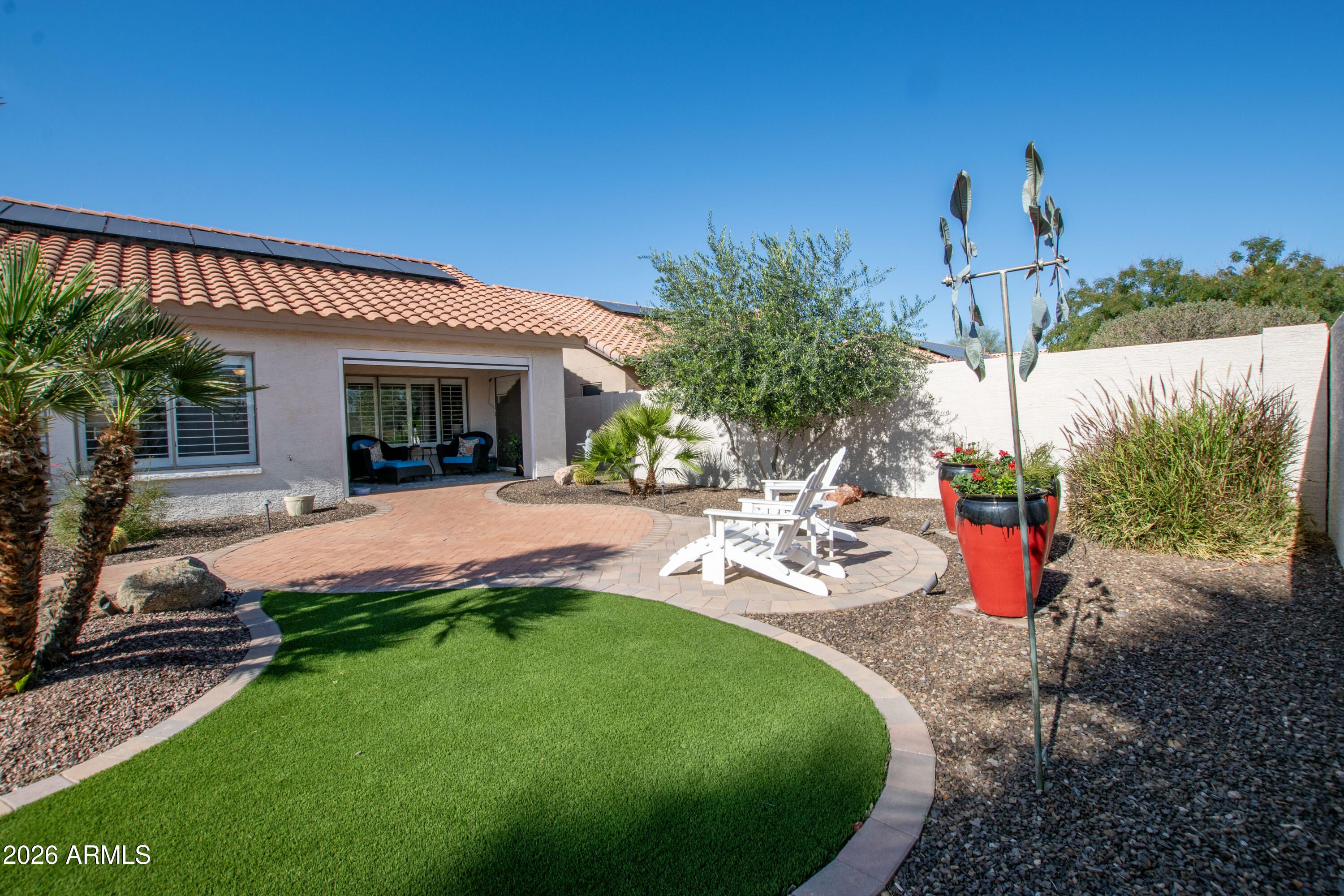 This beautifully updated 2-bedroom, 2-bath home with a versatile den offers comfort, style, and exceptional upgrades throughout. The den features barn doors and a closet, making it ideal as an office or easily convertible third bedroom. Tile flooring runs through the main living areas with plush carpet in the bedrooms, complemented by newer oversized baseboards. The kitchen features quartz countertops, stainless steel appliances, an undermount sink, backsplash, breakfast bar, and a GE Café stove (2025). Additional upgrades include a refrigerator (2023), whole-house water filtration system, RO system for the sink and refrigerator, and owned solar installed in 2023. Major systems were updated in 2021, including the furnace, air handler, and hot water heater. The home also features an... epoxy-coated garage floor (2022), updated toilets, a living room ceiling fan (2025), and a striking main bedroom feature wall. Outdoor living shines with beautifully landscaped front and back yards, paver patios, faux grass, lighting, fire pit area, new irrigation and dripper systems, and automatic privacy screens on the covered back patioperfect for enjoying the PebbleCreek lifestyle.
