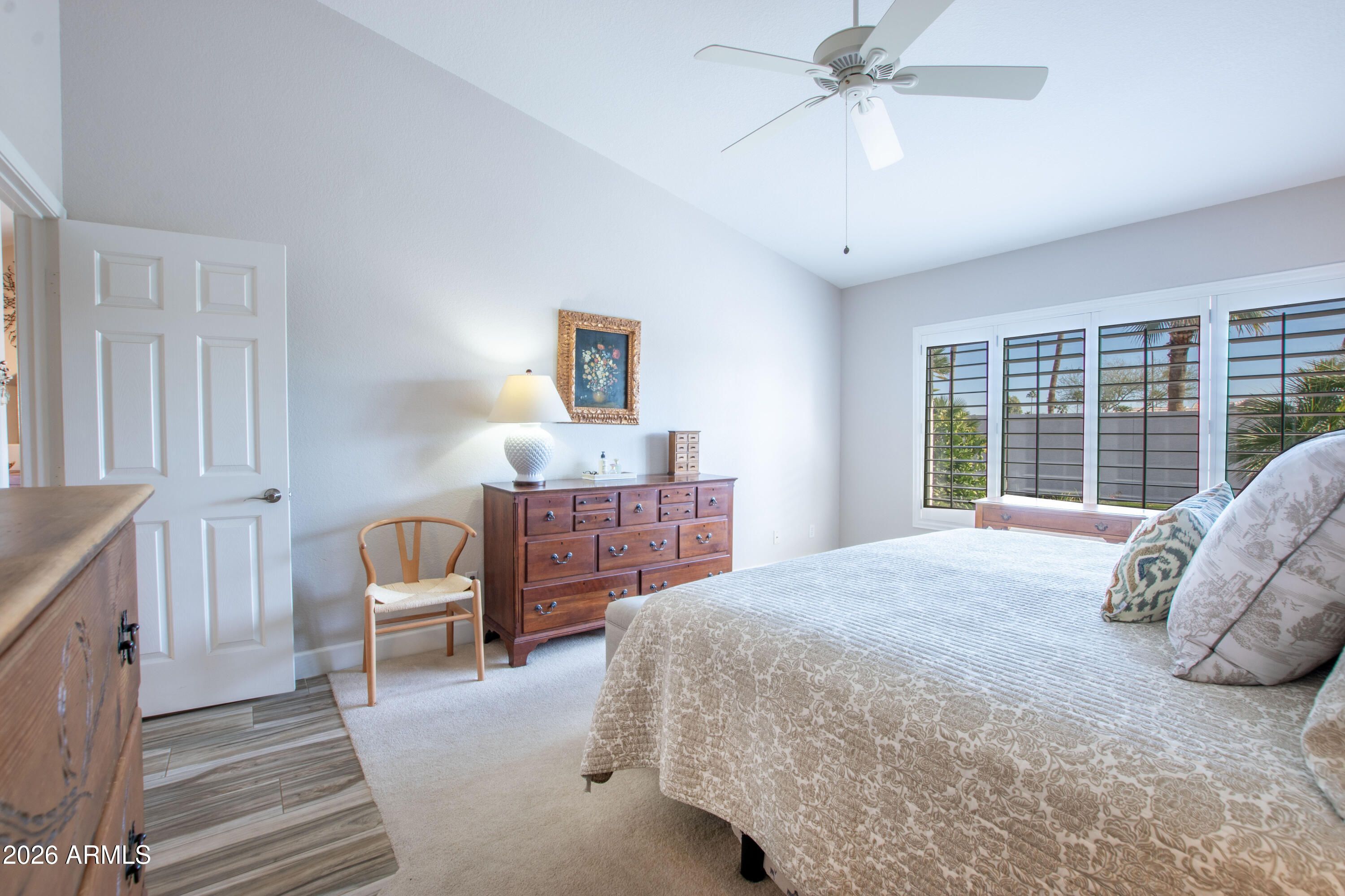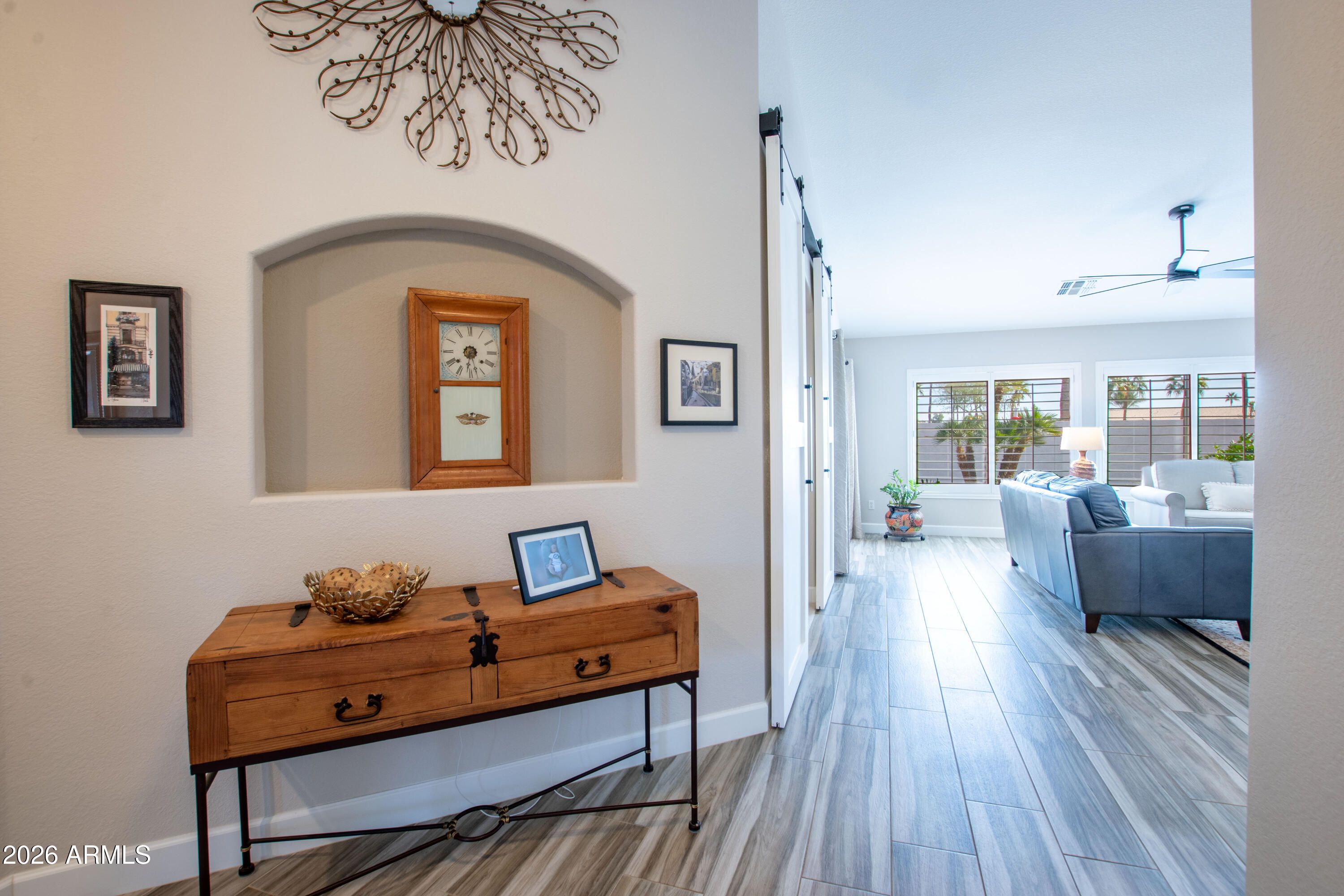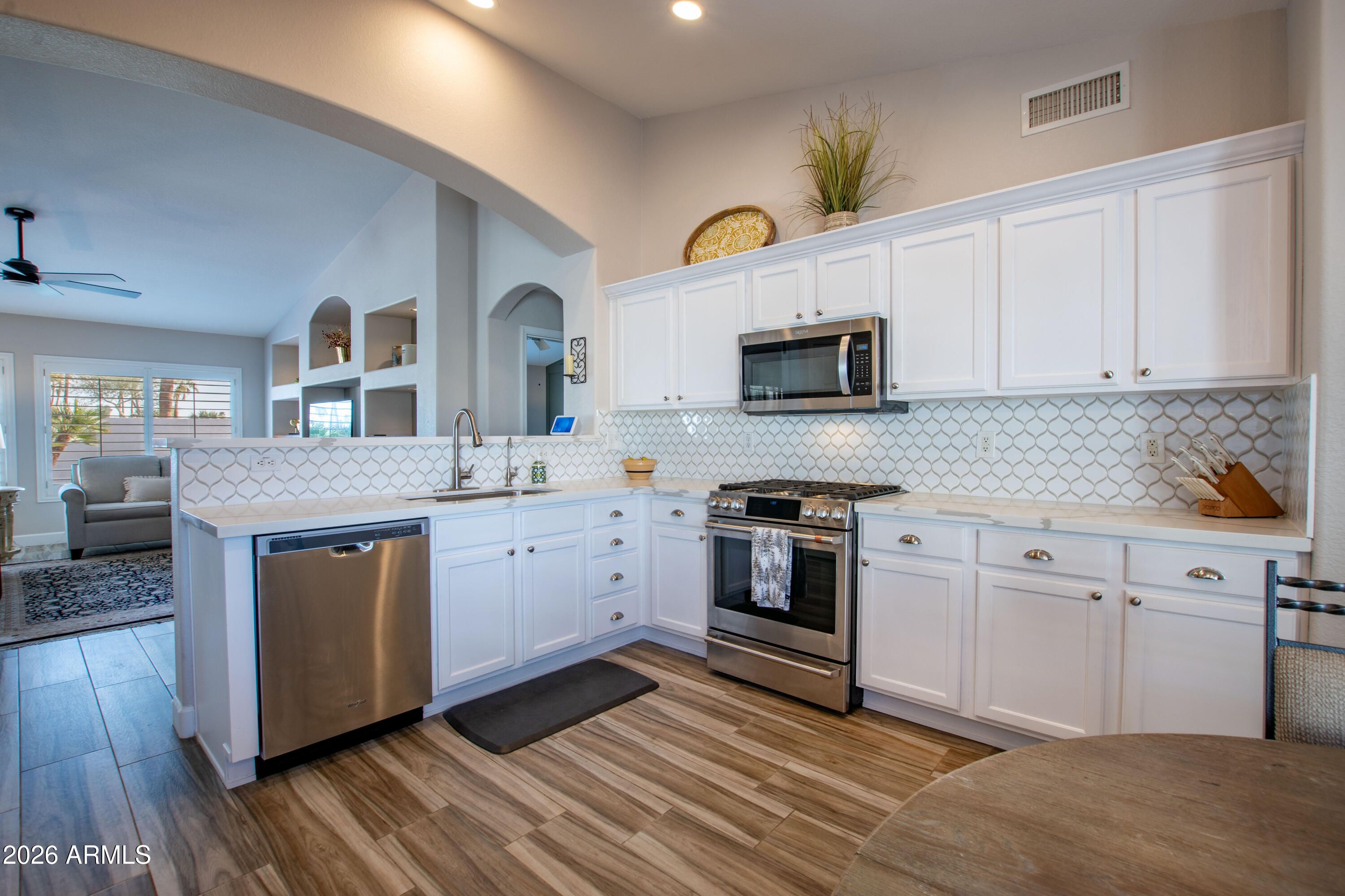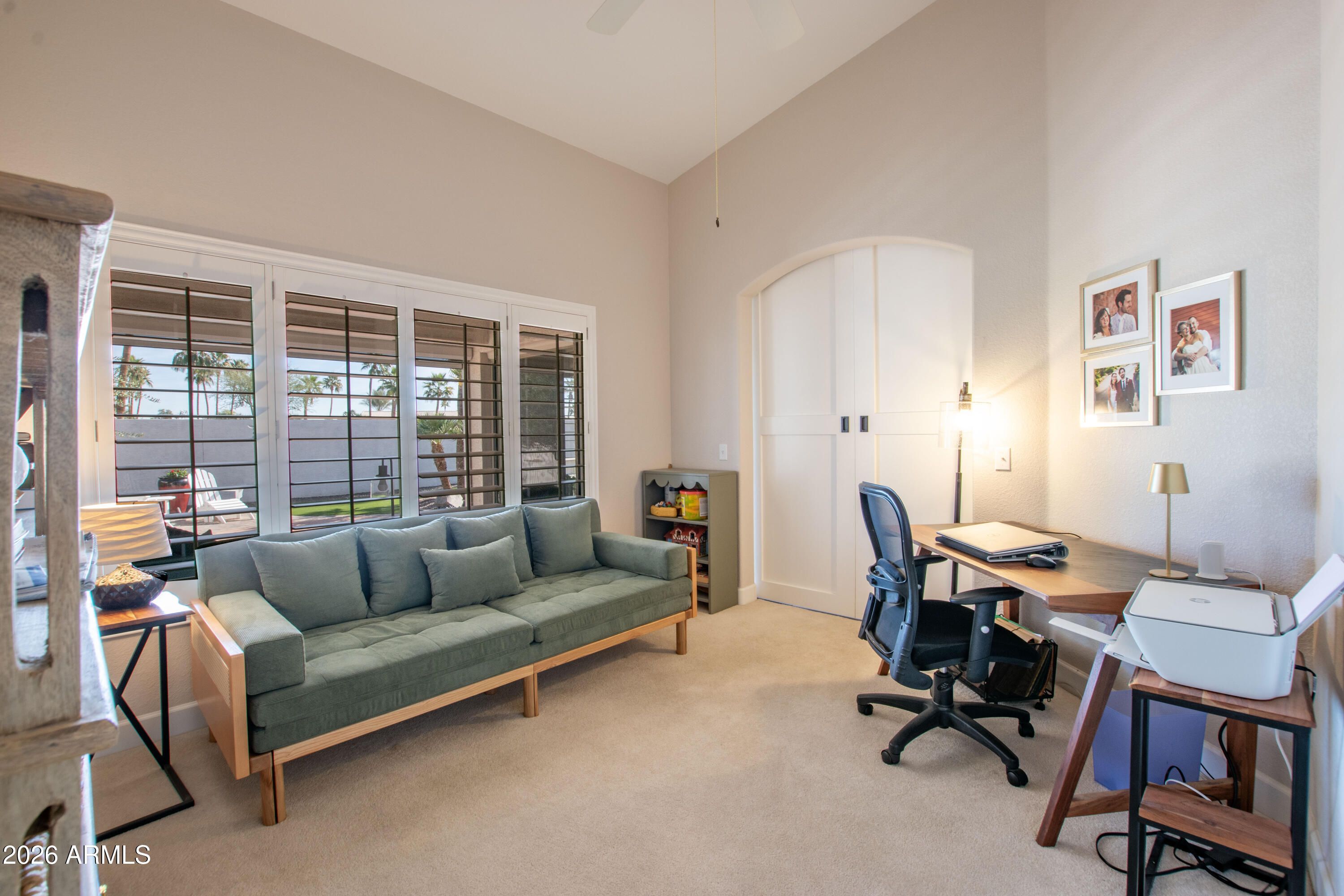 This beautifully updated 2-bedroom, 2-bath home with a versatile den offers comfort, style, and exceptional upgrades throughout. The den features barn doors and a closet, making it ideal as an office or easily convertible third bedroom. Tile flooring runs through the main living areas with plush carpet in the bedrooms, complemented by newer oversized baseboards. The kitchen features quartz countertops, stainless steel appliances, an undermount sink, backsplash, breakfast bar, and a GE Café stove (2025). Additional upgrades include a refrigerator (2023), whole-house water filtration system, RO system for the sink and refrigerator, and owned solar installed in 2023. Major systems were updated in 2021, including the furnace, air handler, and hot water heater. The home also features an... epoxy-coated garage floor (2022), updated toilets, a living room ceiling fan (2025), and a striking main bedroom feature wall. Outdoor living shines with beautifully landscaped front and back yards, paver patios, faux grass, lighting, fire pit area, new irrigation and dripper systems, and automatic privacy screens on the covered back patioperfect for enjoying the PebbleCreek lifestyle.