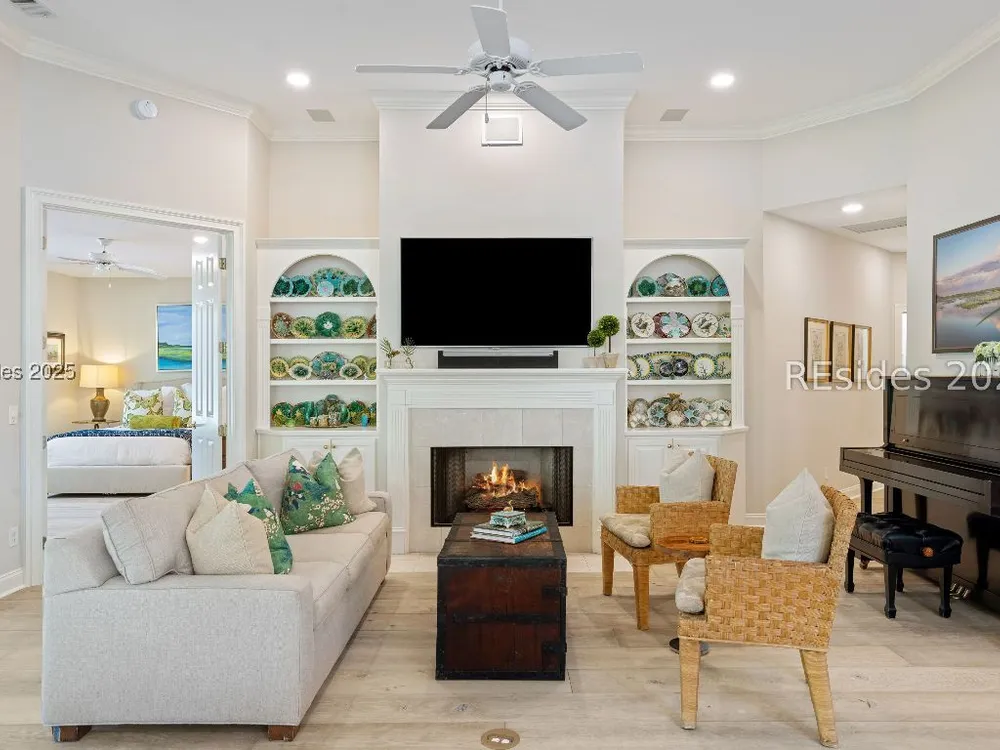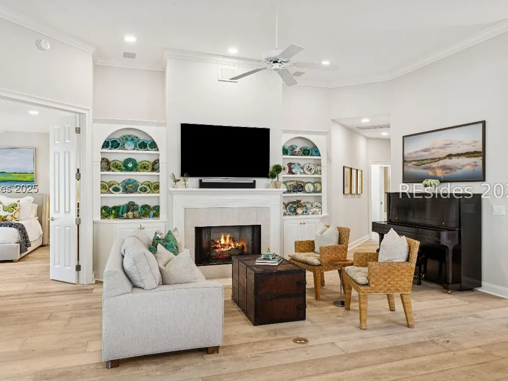 - Bookcases, Built-in Features, Ceiling Fan(s), Fireplace, Jetted Tub, Main Level Primary, Multiple Primary Bathrooms, Pull Down Attic Stairs, See Remarks, Smooth Ceilings, Separate Shower, Wired for Sound, Window Treatments, Entrance Foyer, New Paint