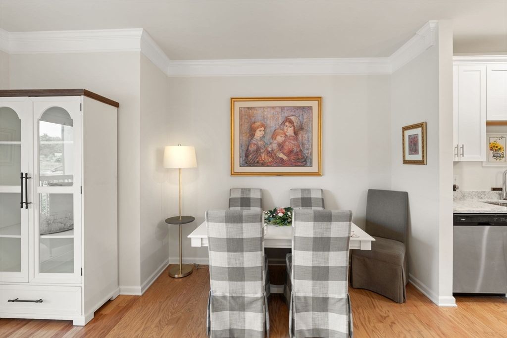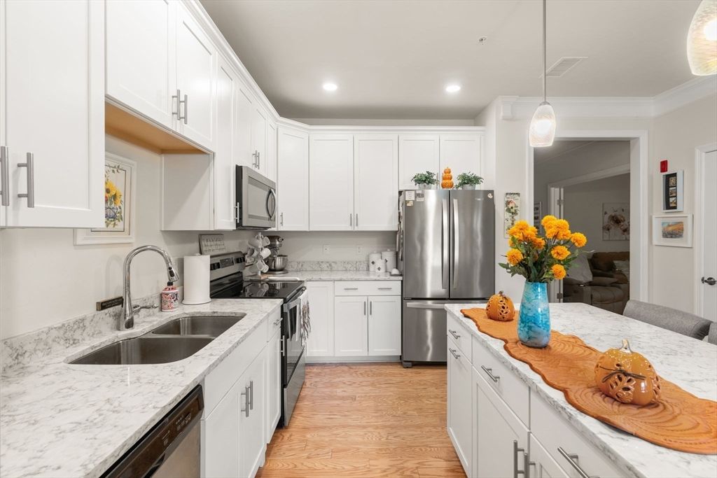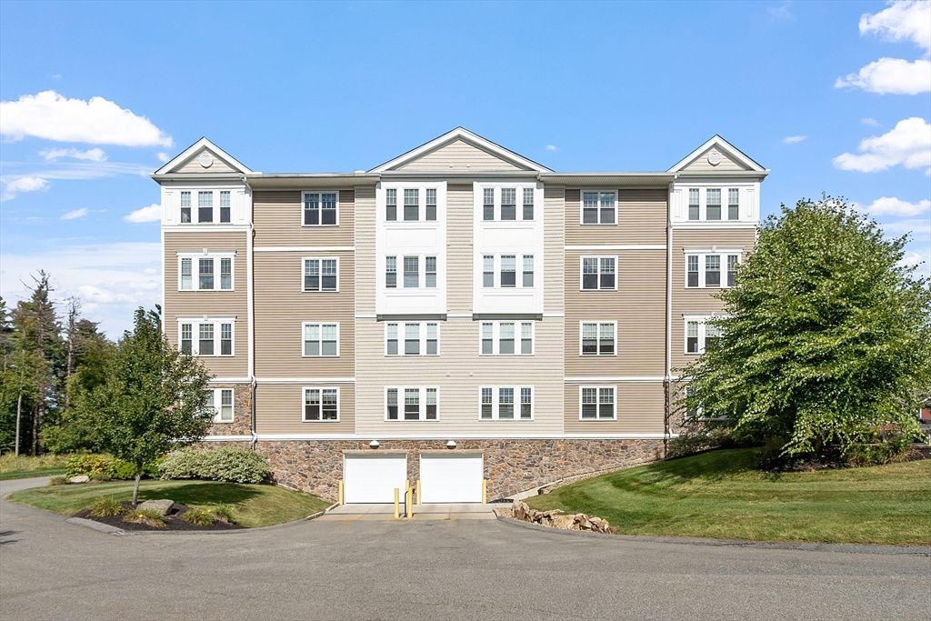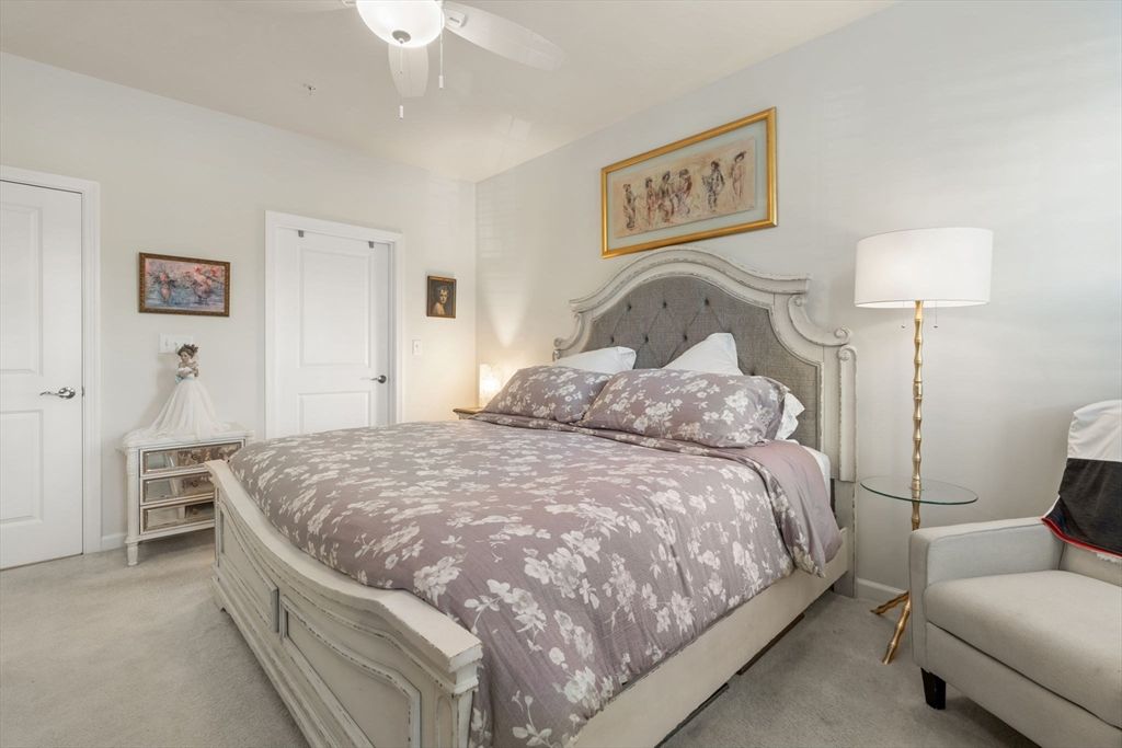 Welcome to Riverside Woods, a desirable 62+ community offering comfortable and convenient living. This beautifully appointed first-floor unit features 1 bedroom plus a versatile den—ideal for a guest room or home office. Thoughtful upgrades include quartz countertops, stainless steel appliances, a center island for casual dining, crown molding, custom closet organizers, and elegant plantation shutters in the bedroom. French doors lead to the den, while a slider opens to a private, south-facing patio perfect for morning coffee or quiet relaxation. Additional highlights include a garage parking space under the building, ample outdoor common parking, clubhouse with gym and direct access to scenic walking trails. A rare opportunity to enjoy low-maintenance, one-level living in a vibrant, well-maintained community.