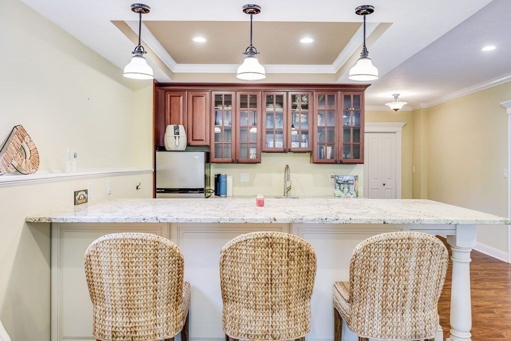 1 Year HOA Offered with this Dartmouth style floor plan in the 55+ Seton Highlands neighborhood in The Pinehills. The private outdoor setting sets this home apart from many others. Home features tasteful upgrades w beautiful decor throughout & has a room for all of your needs. The main level includes 2 ensuites, 2 1/2 baths, a kitchen w stainless appliances & granite counters: a cathedral living area w a gas fireplace & a sunny three season room w plantation shutters. Access the large deck from either the 3-season room or the kitchen dining area. Don't miss the beautiful crown molding & the gleaming hardwood floors. Prepare to be wowed by the walk-out LL which presents a 2nd family room w fireplace and a Murphy bed for additional overnight guests: an exercise room; a "game room" area; full bath & a wet bar area featuring refrigerator, granite counters & center island. You'll see crown molding throughout the finished areas. HOA includes Pool, club house, exercise room.