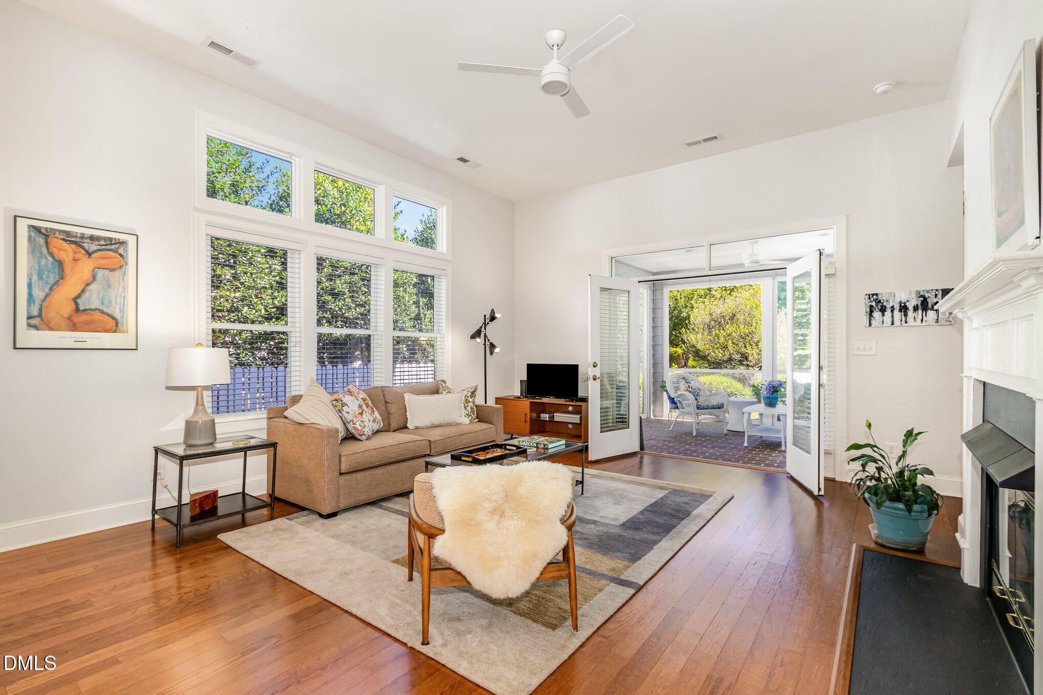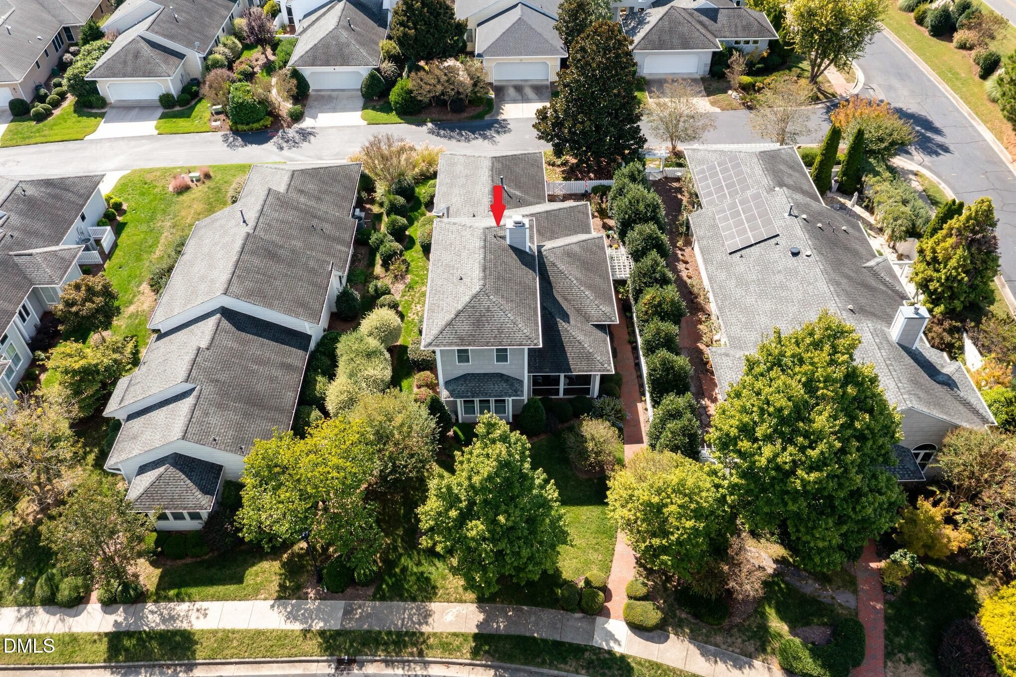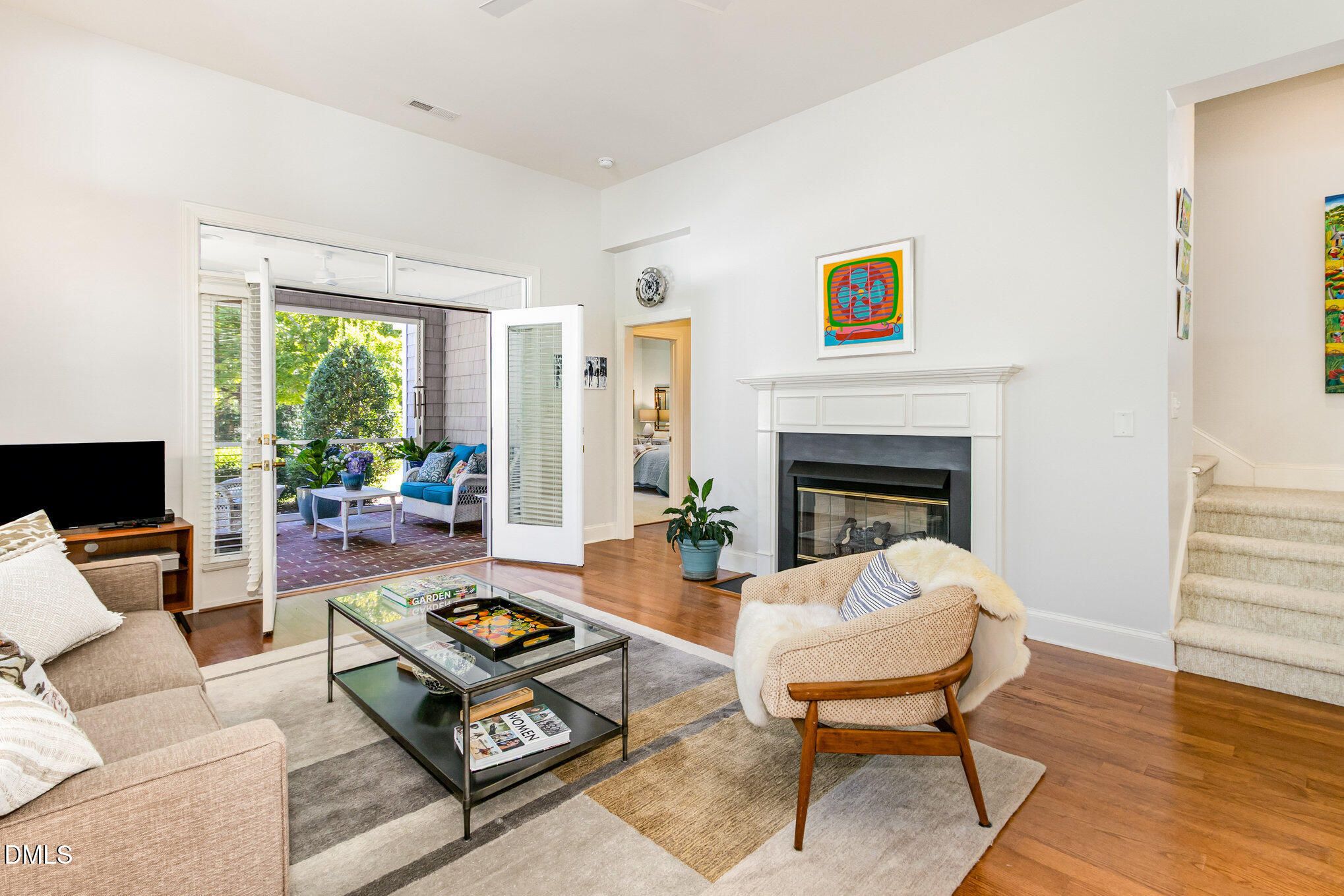 Nestled in Camden South, one of Fearrington Village's most desirable neighborhoods, you will find this charming home with privacy, views, and convenience! For 20 years, there have only been two owners who meticulously maintained this property. Flooded with sunlight from South, East, North, and West facing windows. The larger than usual Camden lot is a gardener's delight with lovely flowering trees; songbirds, hummingbirds, and butterflies abound. Living room with fireplace and high ceiling has French doors that open to a screened porch with a view of the manicured yard that is maintained by the HOA, and there is a peaceful view of the protected woods. Separate dining area. Hardwood flooring in living room, dining room, and kitchen. Kitchen with island has updated (2020-2024) dishwasher, refrigerator, and Thermador range. Glass doors open from the kitchen to a courtyard garden with a water feature and garden with many perennials and other unique plantings. Separate laundry room with premium LG washer and dryer, both on back-saving pedestals (new in 2020). Main-level primary suite with built-in shelving and desk. Primary bath features a tile shower with Kohler Purist plumbing fixtures and knobs/pulls. Upstairs there are two spacious bedrooms and a full bathroom. Two-car garage with built-ins. Rainbird irrigation system. Recent updates include new roof, new Berber carpet in primary bedroom and upstairs, newer water heater (2019), new toilets, Hunter Douglas Powerview electric blinds in the primary suite and kitchen, and new HVAC systems for first and second floors. Camden South is an easy walk to the Fearrington Village center featuring a gourmet café and market, a luxury inn, boutique shops, a nationally known bookstore, a bank, a beauty salon, and a spa. The excellent Farmer's Market draws shoppers from throughout the community. The friendly, close-knit community of Camden South has monthly gatherings.