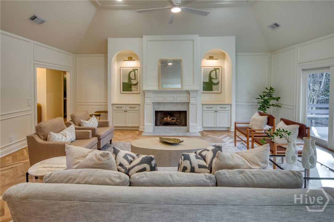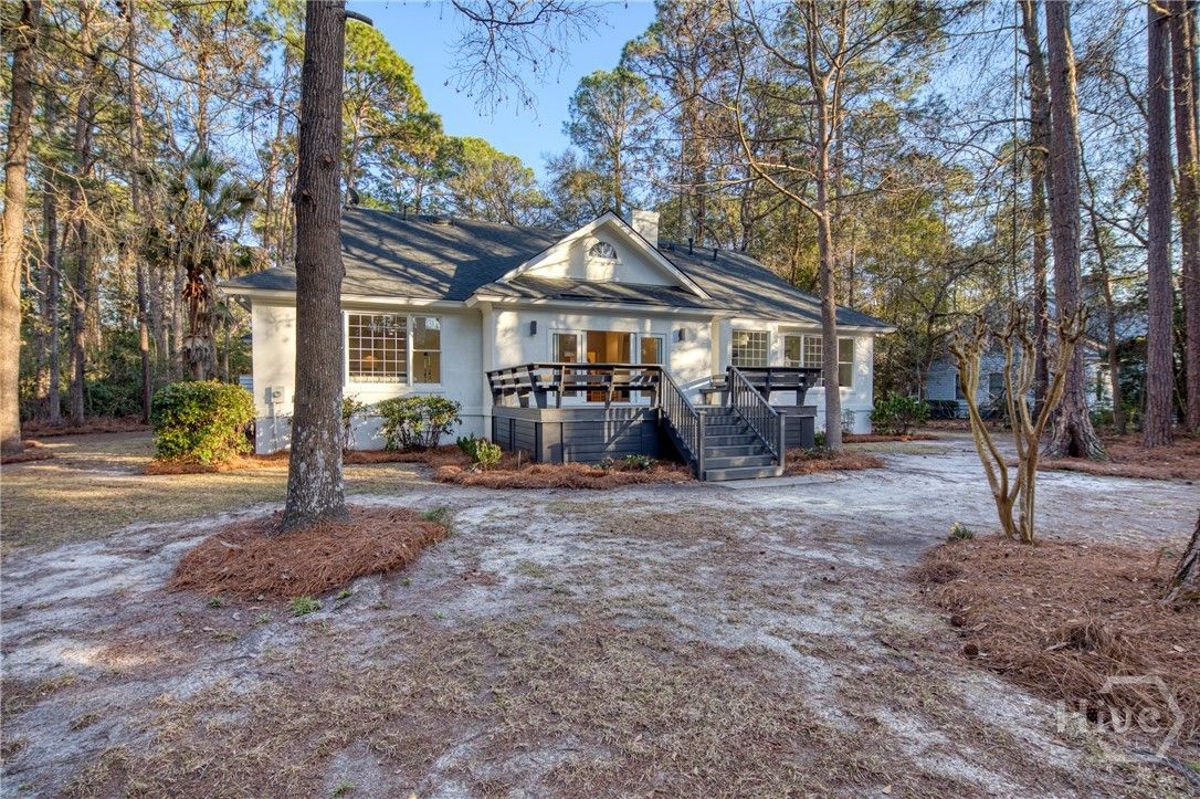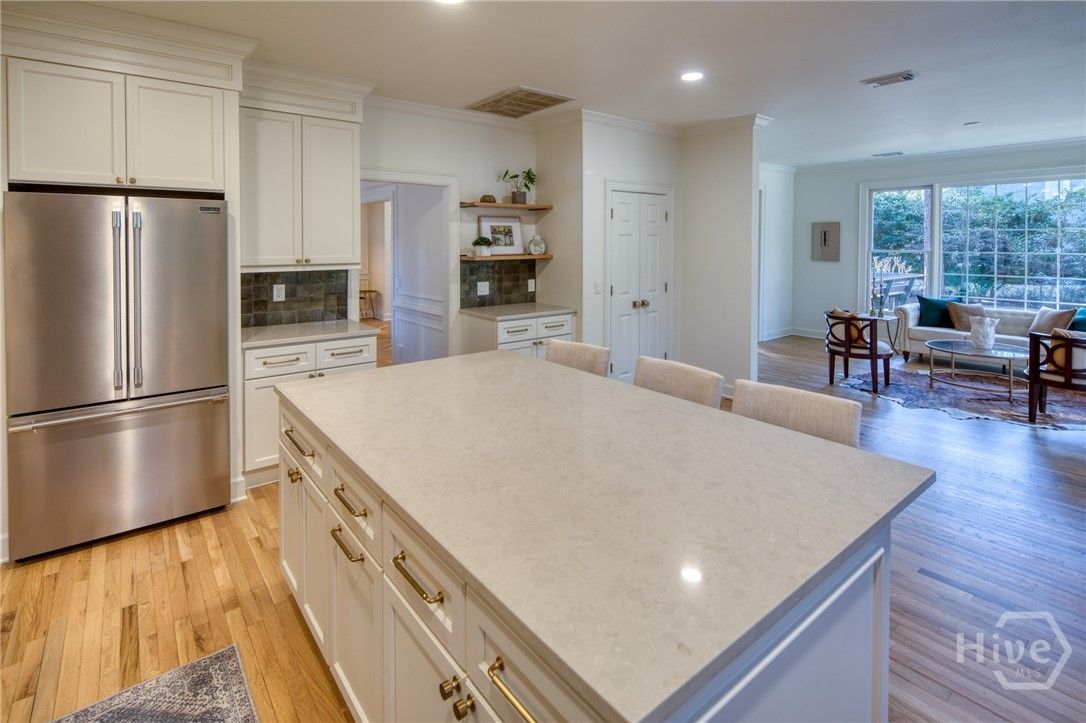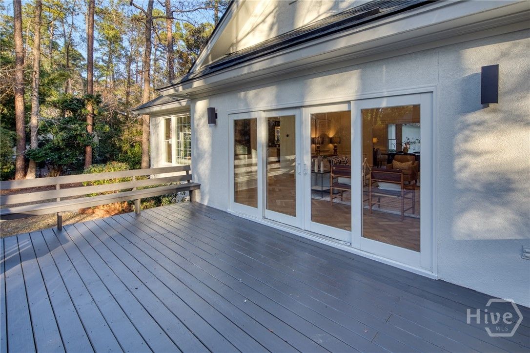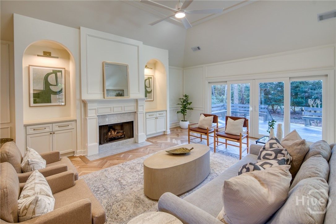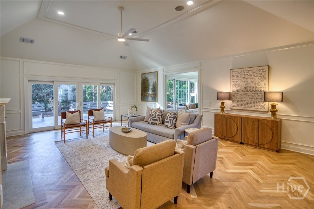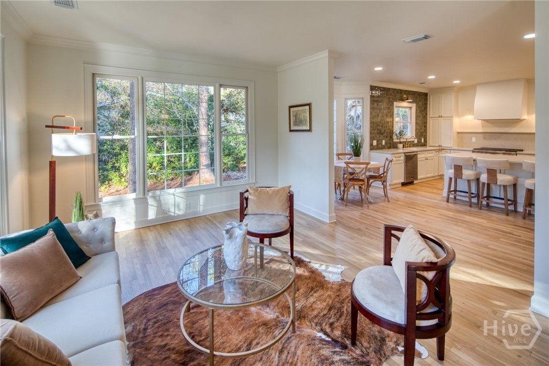 Completely reimagined from top to bottom, 4 Planters Lane offers beautifully renovated living in the highly coveted Landings community. This 4 bedroom, 3.5 bath home blends timeless design with thoughtful modern upgrades throughout. A welcoming entry anchored by a solid mahogany front door opens to elegant interiors featuring custom wall treatments, abundant natural light, and stunning herringbone white oak hardwood flooring in the living room, complemented by refinished solid hardwoods throughout the remainder of the home. The chef’s kitchen is anchored by quartz countertops, custom cabinetry, and generous prep space, while a combined laundry room and secondary wet kitchen adds everyday convenience. The primary suite serves as a private retreat with a freestanding soaking tub, walk-in shower, double vanity, arched linen storage, and custom-designed closet. Additional improvements include new insulated glass window sashes, crawlspace encapsulation with dehumidifier, copper exterior lighting, and a two-car garage with a dedicated golf cart bay—perfect for Landings living.