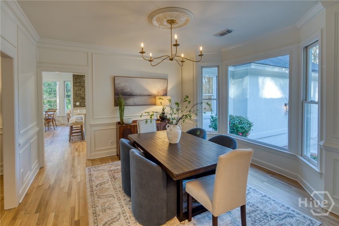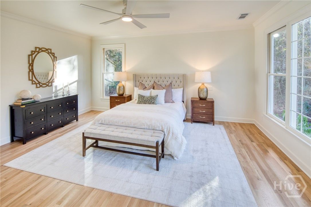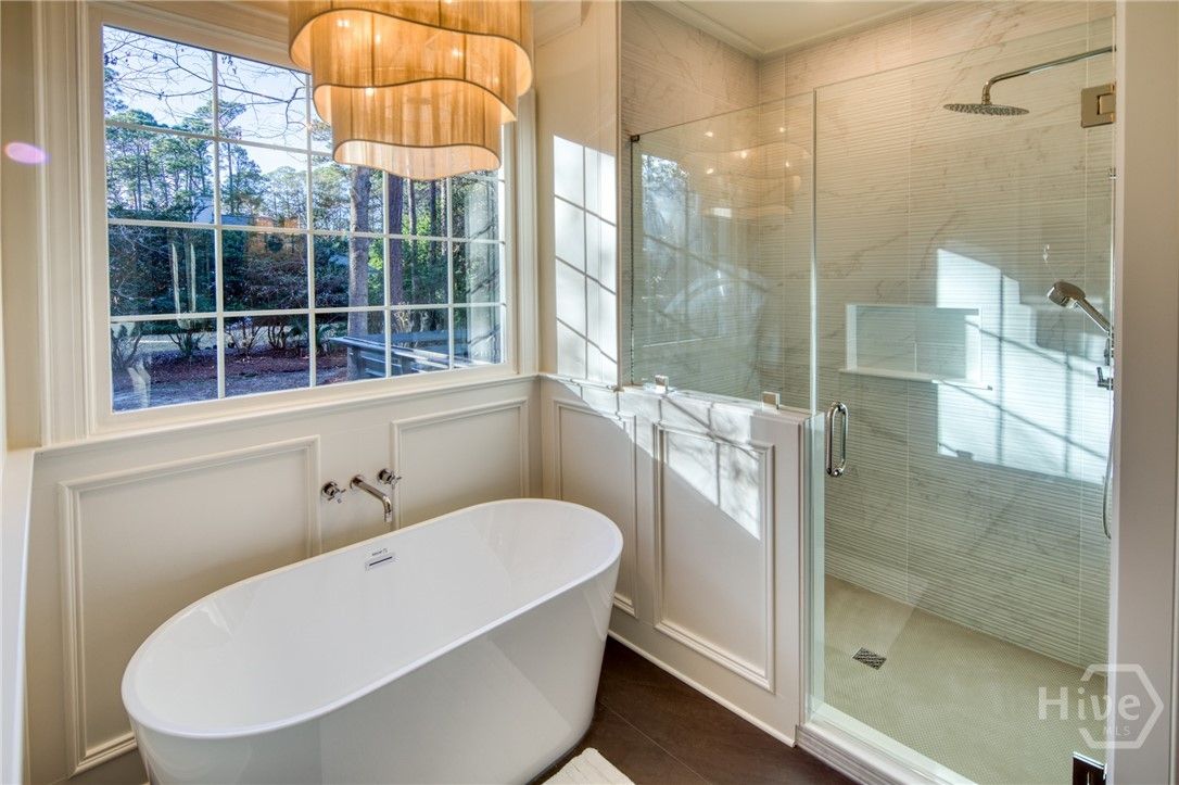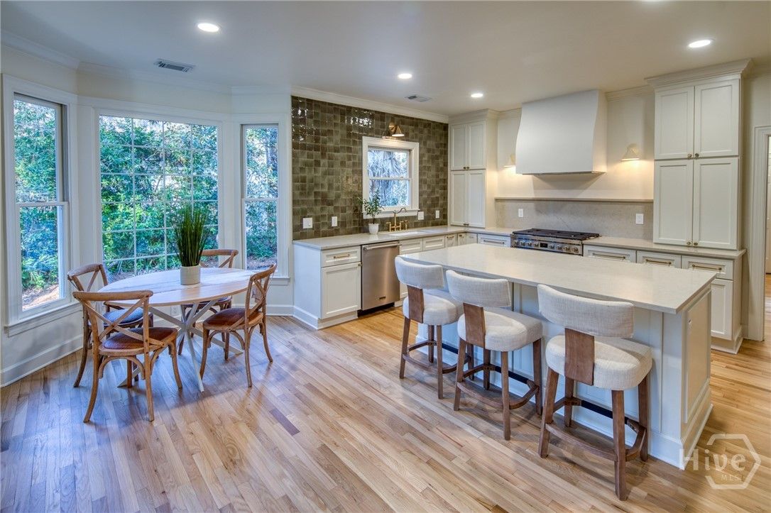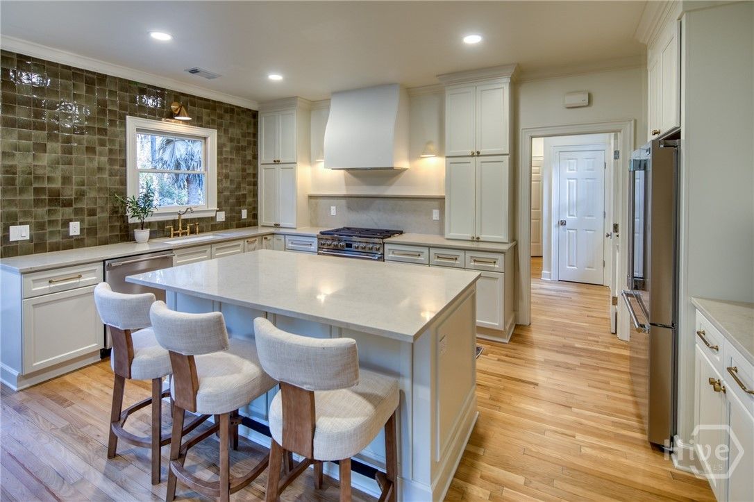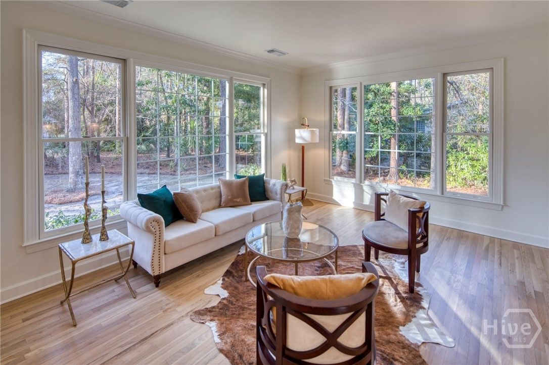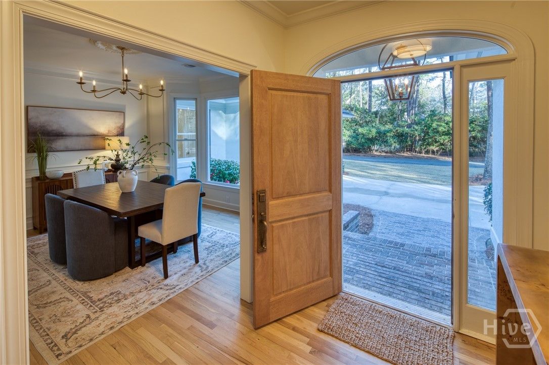 Completely reimagined from top to bottom, 4 Planters Lane offers beautifully renovated living in the highly coveted Landings community. This 4 bedroom, 3.5 bath home blends timeless design with thoughtful modern upgrades throughout. A welcoming entry anchored by a solid mahogany front door opens to elegant interiors featuring custom wall treatments, abundant natural light, and stunning herringbone white oak hardwood flooring in the living room, complemented by refinished solid hardwoods throughout the remainder of the home. The chef’s kitchen is anchored by quartz countertops, custom cabinetry, and generous prep space, while a combined laundry room and secondary wet kitchen adds everyday convenience. The primary suite serves as a private retreat with a freestanding soaking tub, walk-in shower, double vanity, arched linen storage, and custom-designed closet. Additional improvements include new insulated glass window sashes, crawlspace encapsulation with dehumidifier, copper exterior lighting, and a two-car garage with a dedicated golf cart bay—perfect for Landings living.