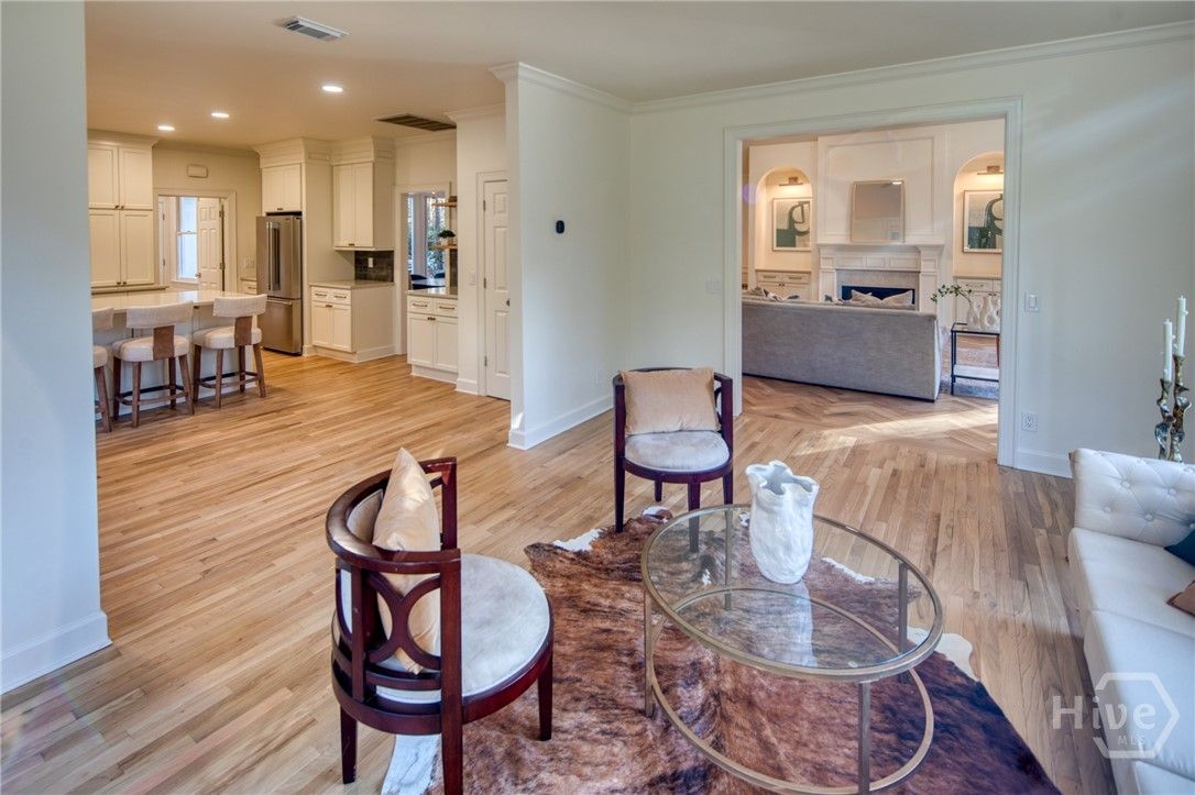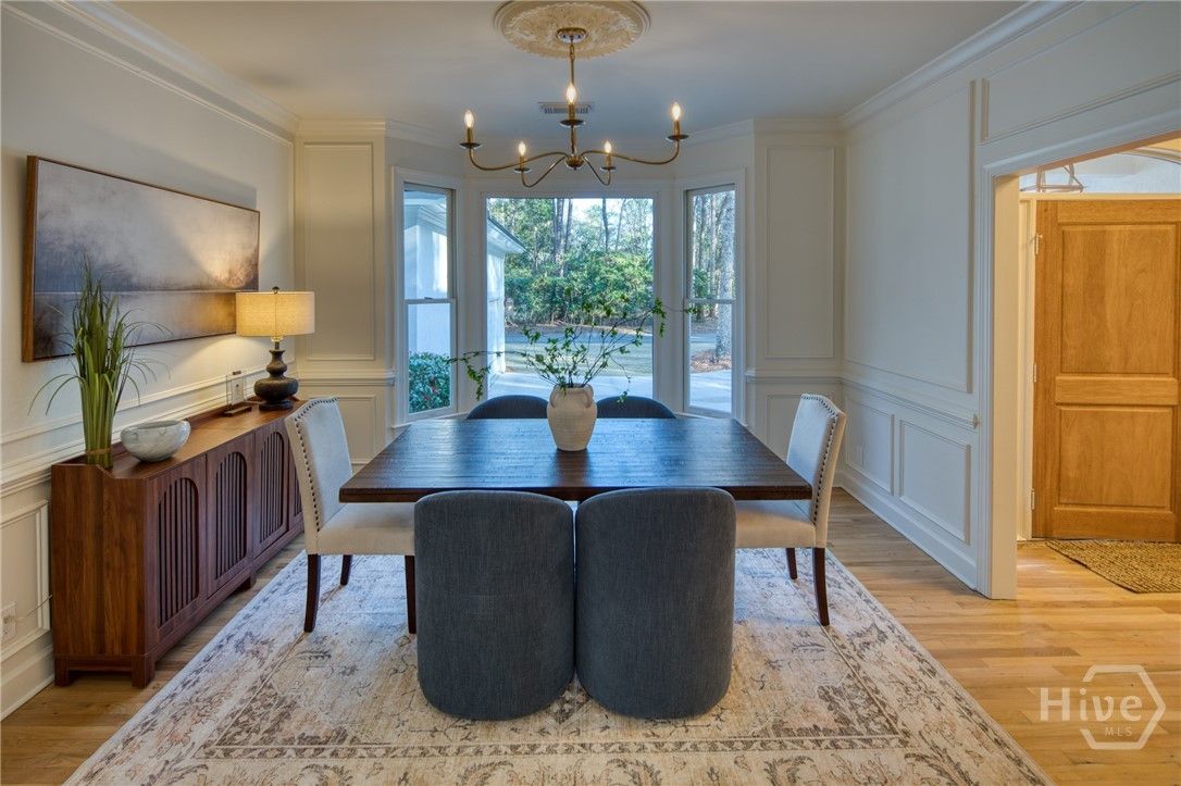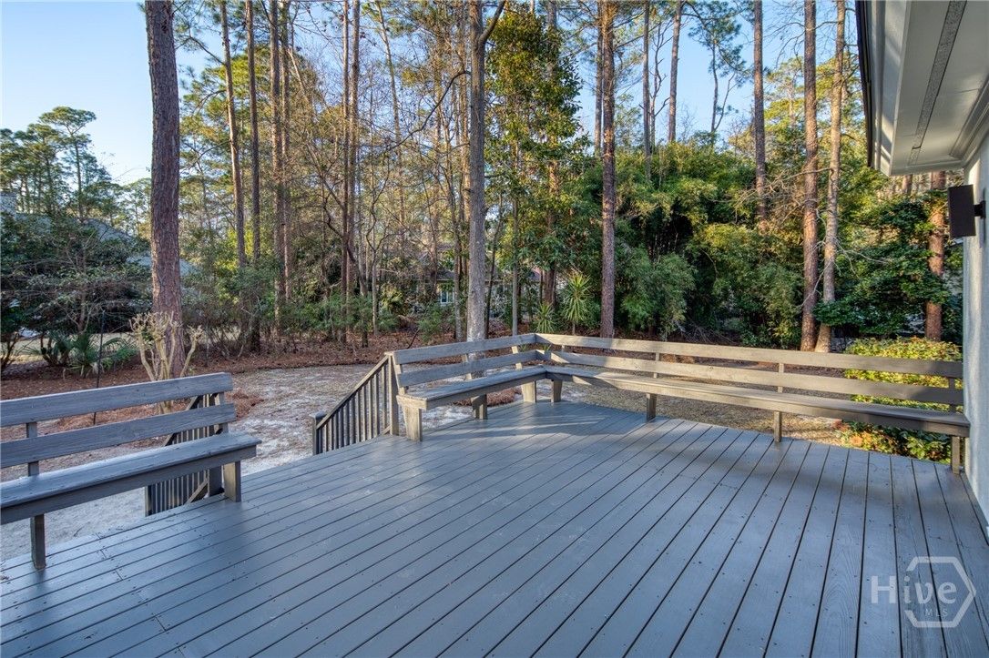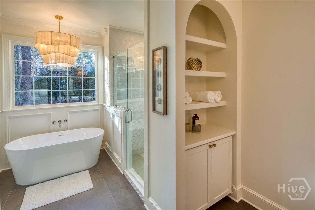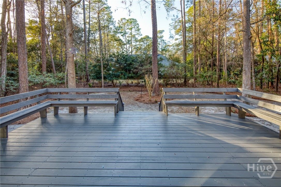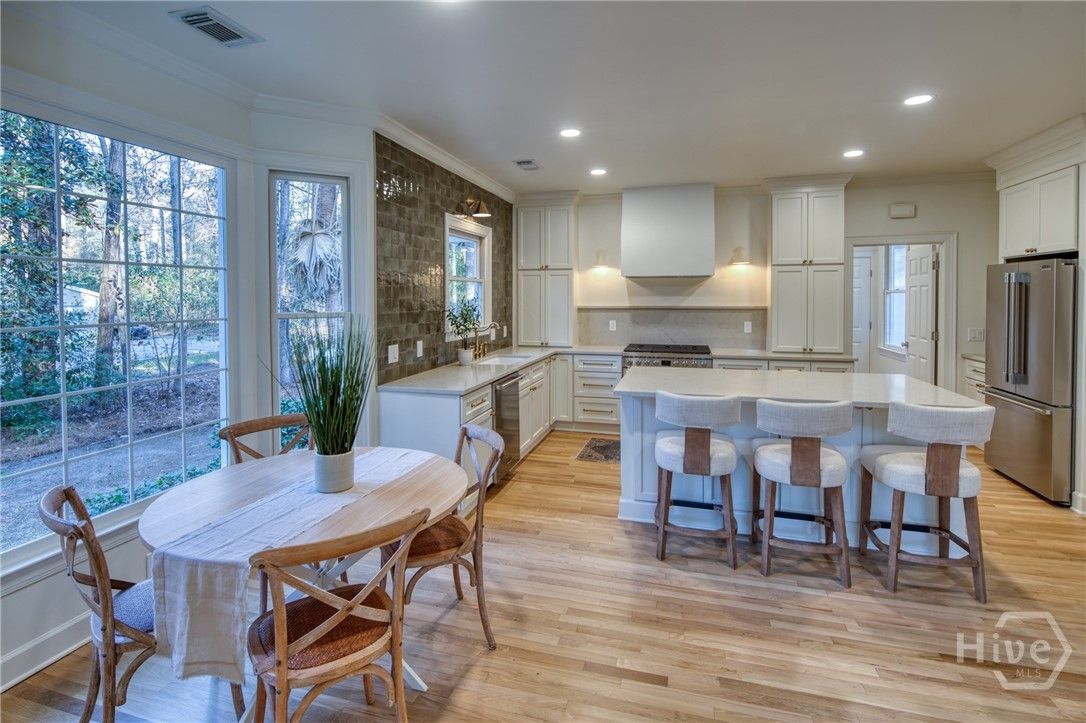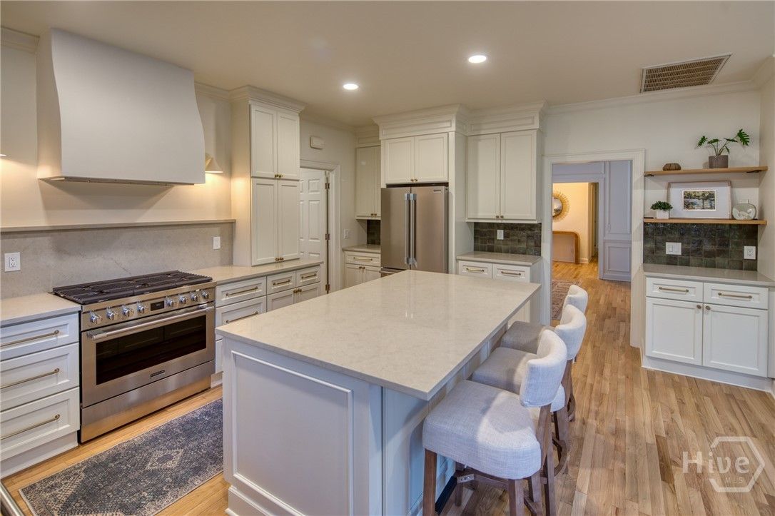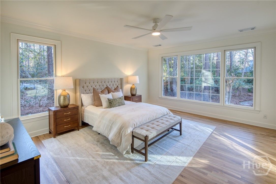 Completely reimagined from top to bottom, 4 Planters Lane offers beautifully renovated living in the highly coveted Landings community. This 4 bedroom, 3.5 bath home blends timeless design with thoughtful modern upgrades throughout. A welcoming entry anchored by a solid mahogany front door opens to elegant interiors featuring custom wall treatments, abundant natural light, and stunning herringbone white oak hardwood flooring in the living room, complemented by refinished solid hardwoods throughout the remainder of the home. The chef’s kitchen is anchored by quartz countertops, custom cabinetry, and generous prep space, while a combined laundry room and secondary wet kitchen adds everyday convenience. The primary suite serves as a private retreat with a freestanding soaking tub, walk-in shower, double vanity, arched linen storage, and custom-designed closet. Additional improvements include new insulated glass window sashes, crawlspace encapsulation with dehumidifier, copper exterior lighting, and a two-car garage with a dedicated golf cart bay—perfect for Landings living.