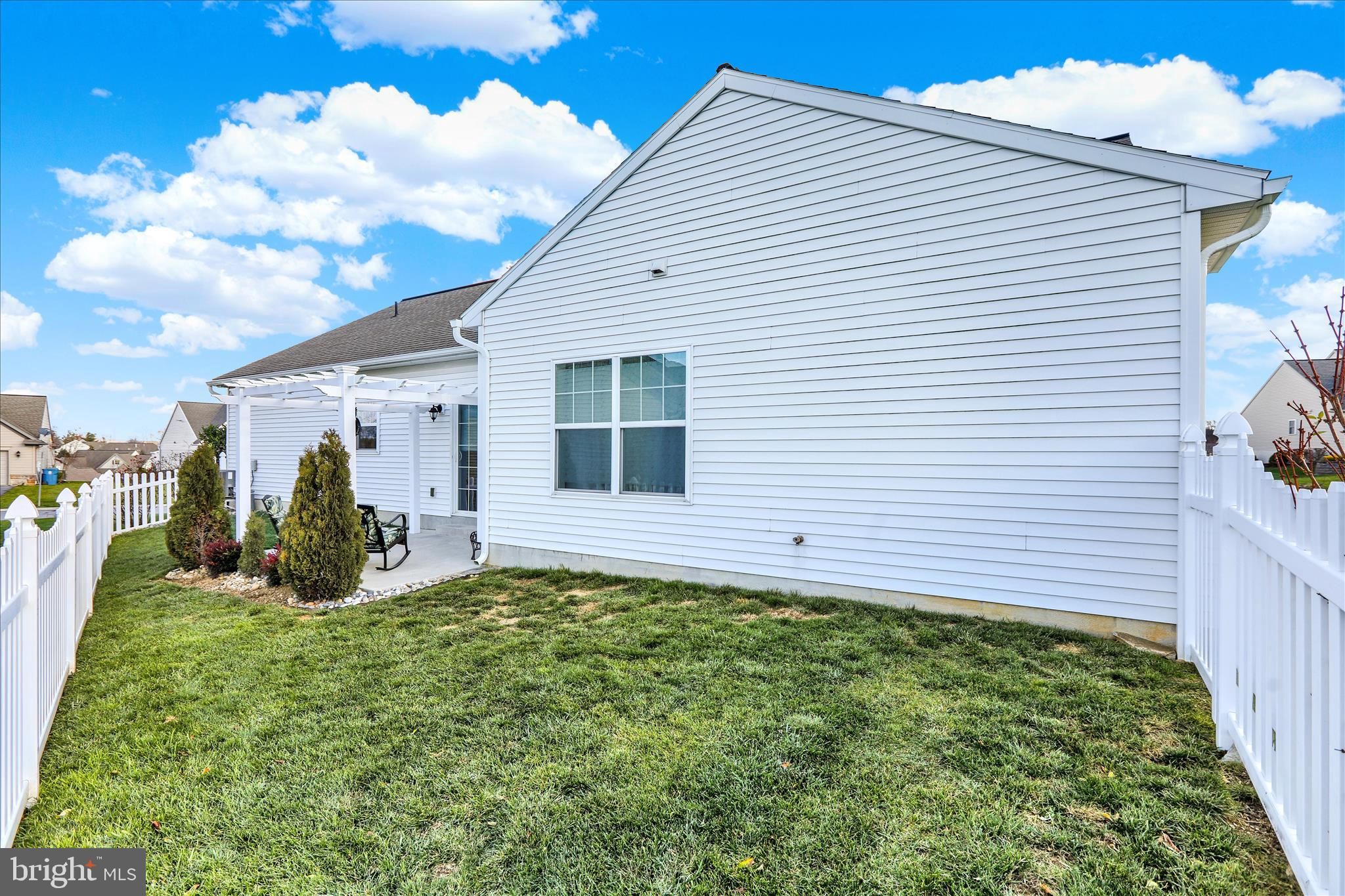 Stonecroft Village is a 55 and over community containing 214 homes. It was thoughtfully designed and built out by Landmark homes. The houses are high quality and nicely designed, with seniors in mind. The home was built in 2019 and it has handicap accessibility no steps at the front door entry, 40" hallway width and 36"bathroom doors for wheel chair access. The house offers a rear patio with pergola and a 21'front covered porch. There is a walk up attic with flooring and lights for all of your extra items, which could be completed as finished living space, if needed. The stylish kitchen has a sit up bar and huge corner pantry closet and is open to the living and dining areas. The master bedroom is separated by the living room from the other 2 bedrooms offering privacy to the master suite. Homeowners fees cover trash snow plowing of roads and club house care.