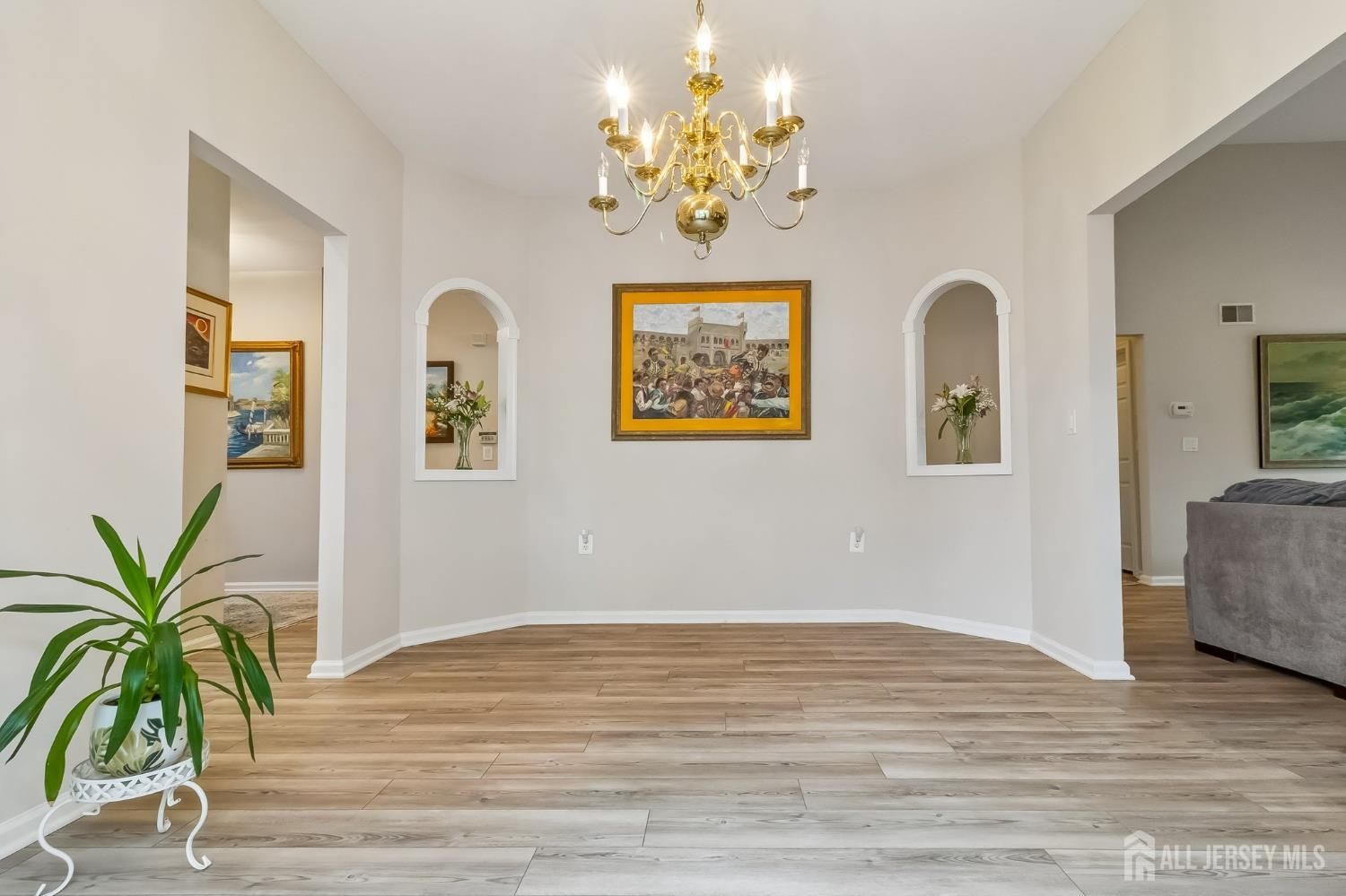 Welcome to this spacious ranch nestled in one of Monroe Township's most desirable 55+ communities! Greenbriar at Whittingham offers exceptional amenities including on-site management, an active social calendar, indoor and outdoor pools, tennis and pickleball courts, a clubhouse, fitness center, community garden and 24-hour security. This turnkey Danbury model features an easy flowing main living area including a welcoming foyer, gourmet kitchen with a center island, separate eating area, Corian countertops, newer cabinetry and stainless steel appliances. The formal dining room and living room boast vaulted ceilings while the bright bonus den is complete with a dual sided gas fireplace and sliders to the deck overlooking manicured woods. Finishing this level is a convenient garage entrance, laundry room, hall bath, a guest bedroom and a primary bedroom with an ensuite bath and a walk in closet.