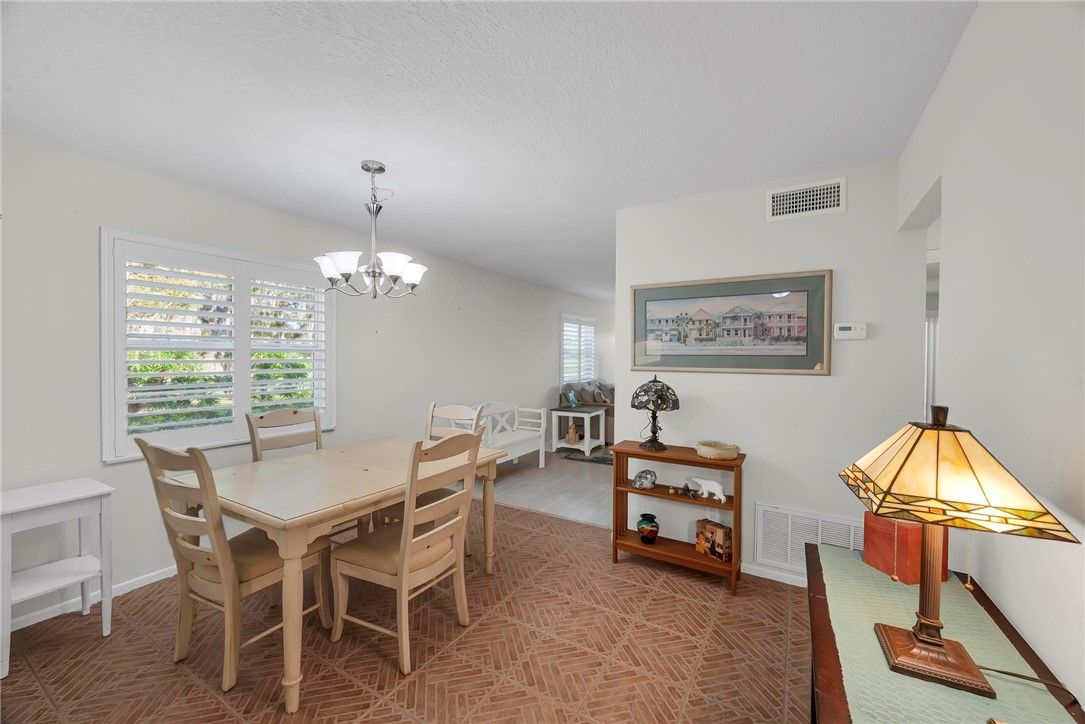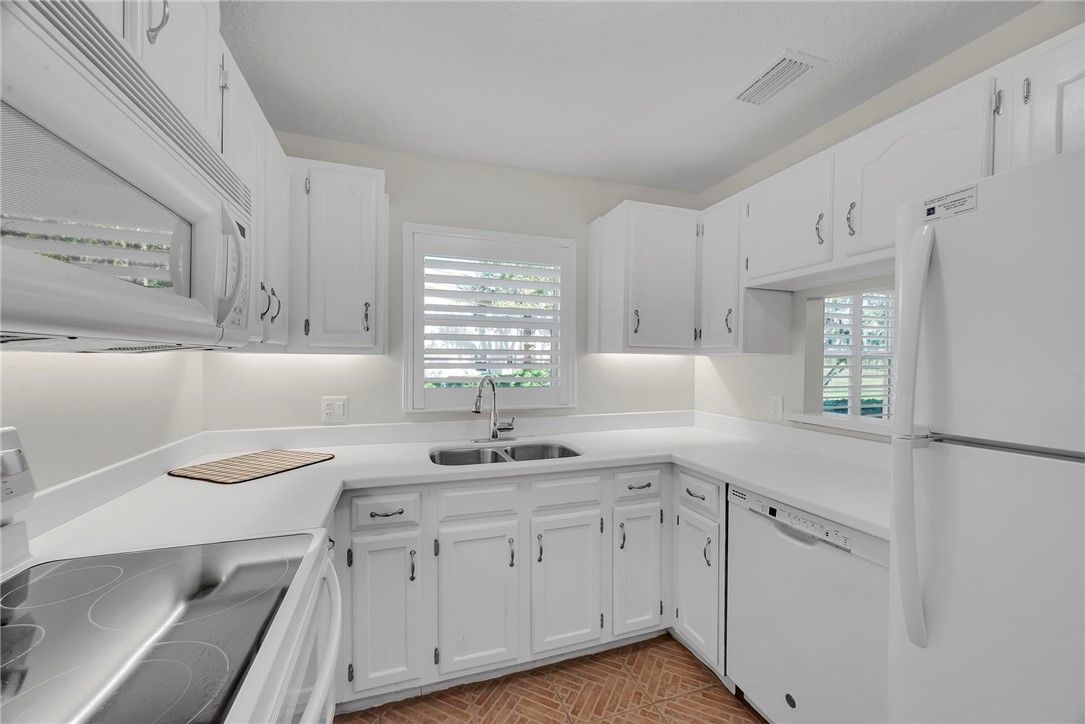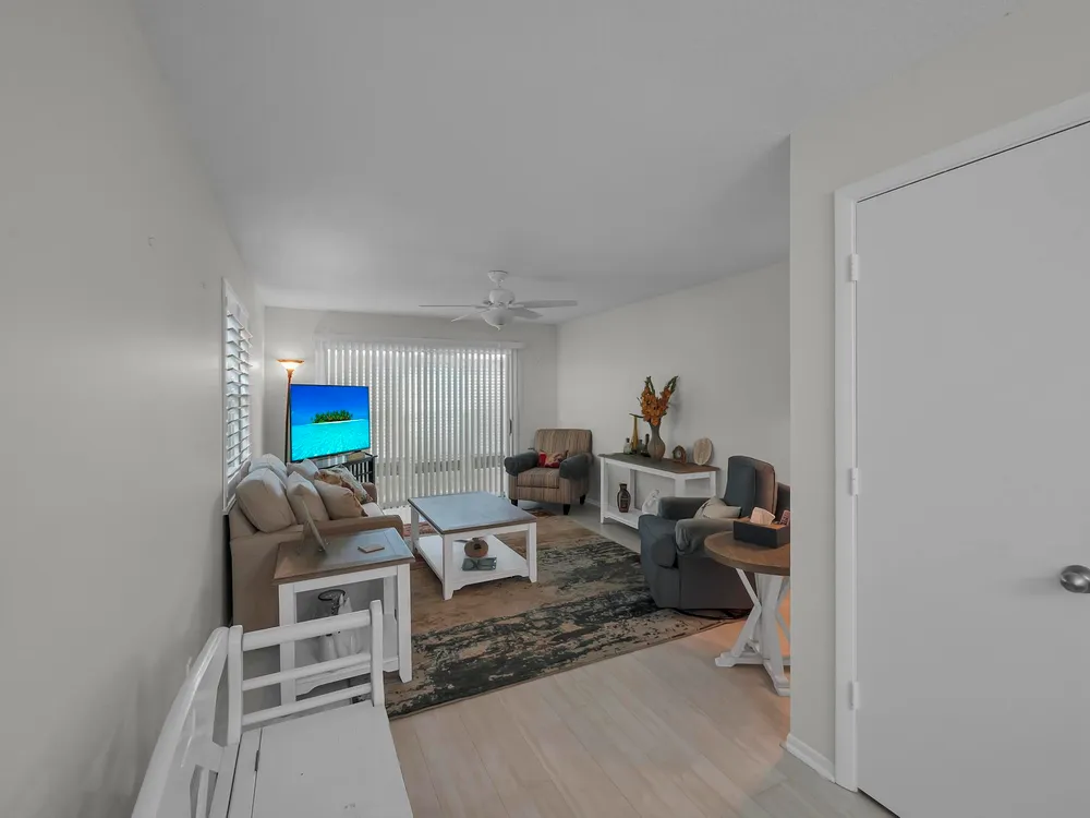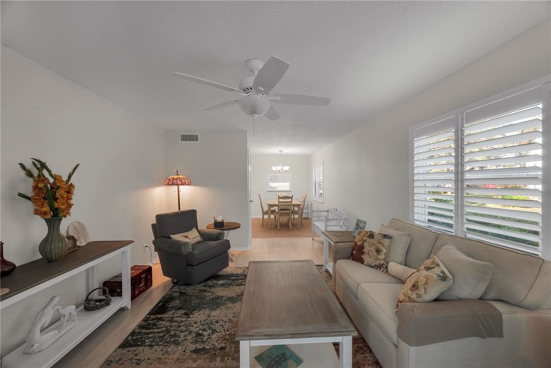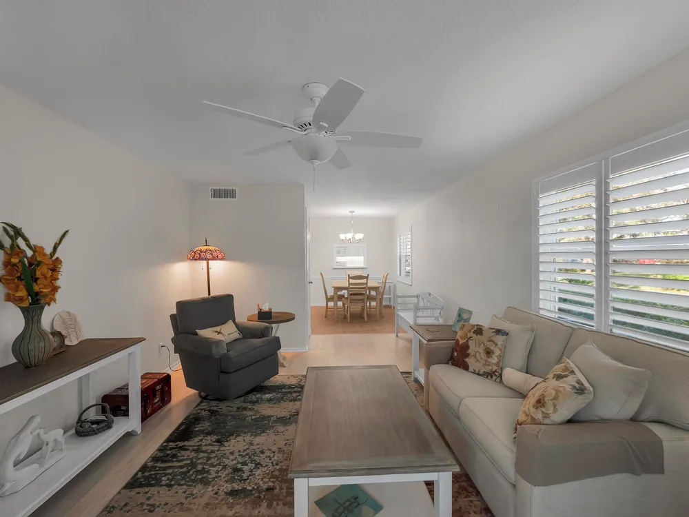 Move-in ready 2-bedroom, 2-bathroom condo featuring the popular Split Model Plan B for added privacy and comfort. This first-floor unit boasts durable tile and laminate flooring with some recent updates. There is plenty of natural light and privacy with stylish plantation shutters. Enjoy the peace of mind provided by impact windows throughout. The condo includes a washer and dryer for your convenience and is ideally located close to the entrance/exit on Indian River Blvd, just minutes from the beach and shopping. A perfect blend of comfort, convenience, and location!