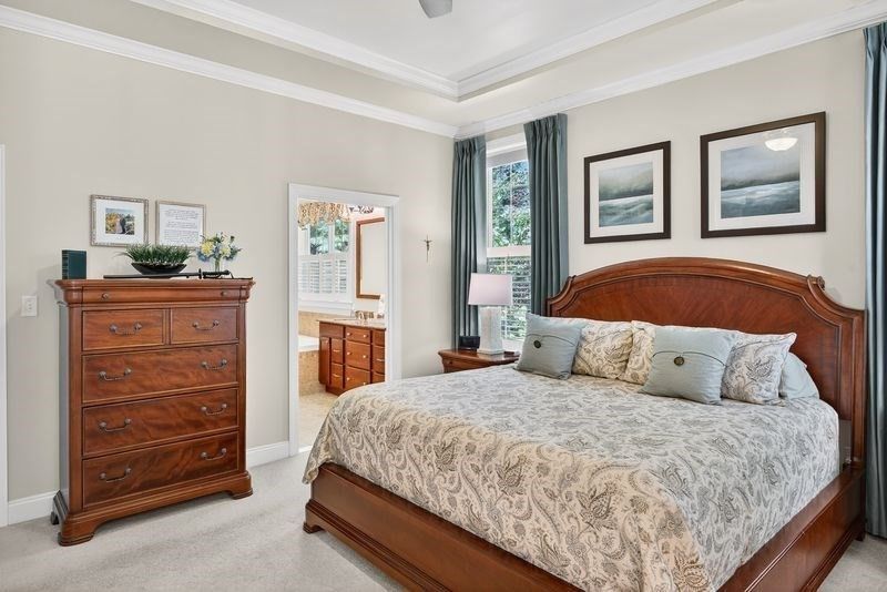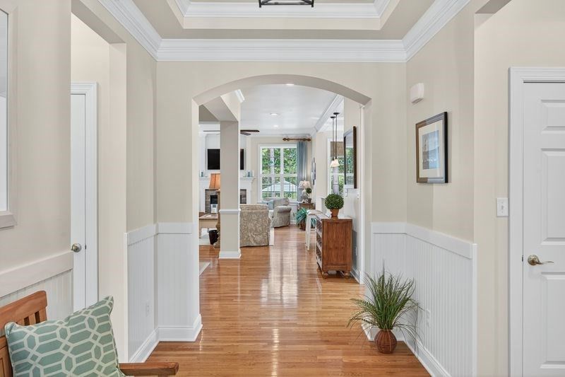 Stunning Bayhill style home built by Toll Brothers is sure to wow as soon as the door opens. Situated on a corner lot on a quiet lane at The Pinehills. This home is beautifully landscaped with irrigation system and is surrounded by woodlands and tranquility. Every attention to detail is included in the open floor plan consisting of gleaming hardwood floors, custom wainscoting and crown molding. Large gourmet kitchen with breakfast bar, pantry, stainless appliances, gas cooktop, wall ovens and premium granite countertops. Spacious primary suite with tray ceiling, crown molding, large walk-in closet, and a large primary bathroom with glass door and tile walk-in shower, soaking tub, double vanity. Gas fireplace with custom stone surround in great room. Single floor living. Designer lighting fixtures and recessed lighting throughout. Two covered porches that walk out to out to paved patio. This home looks like a model home. HOA includes Tennis courts, Pools, exercise facility and clubs.