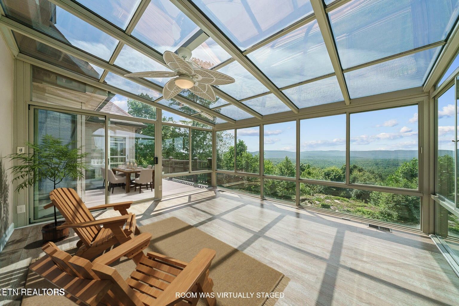 Step into this one-of-a-kind home to the awe-inspiring, sprawling mountain views of the Cumberland Plateau. The densely forested landscape also features rocky outcrops, bluffs, gorges and waterfalls. The home features a fully glassed sunroom including the ceiling for views beyond compare. Open the windows for cool evening breezes. A second sunroom is very spacious with beautiful views as well with a Trex deck that connects the two sunrooms. The spacious living room has an entertainment center with a media room behind (off the master bedroom). The home was built with a fireplace flue where the entertainment center and media room is located in case the owners wanted a fireplace in the future. The living room features cathedral ceilings and scraped hardwood flooring. The formal dining room and front bedroom/office feature soaring ceilings with plantation shutters. The spacious kitchen features custom cabinets, beautiful granite countertops, stainless steel appliances and a casual dining space. The master suite has two huge closets with custom organizers, master bath has beautiful marble countertops, twin vanities and oversized walk-in, tile shower. There are two guest bedrooms and the guest bath includes a walk-in tub with shower. The extra large, 2-car garage has room for a workbench and there is a staircase to a 7x25' floored storage area! Other features include an encapsulated, stand-up crawl space with room for storage, full-house generator and 2-year old heat pump with duel fuel. This is a home you won't want to leave. Make your appointment today! HOA is $137.00/month for FFG; $399/year for The Bluffs. There is an amenities reserve fee of $6,000 to buy in Fairfield Glade.