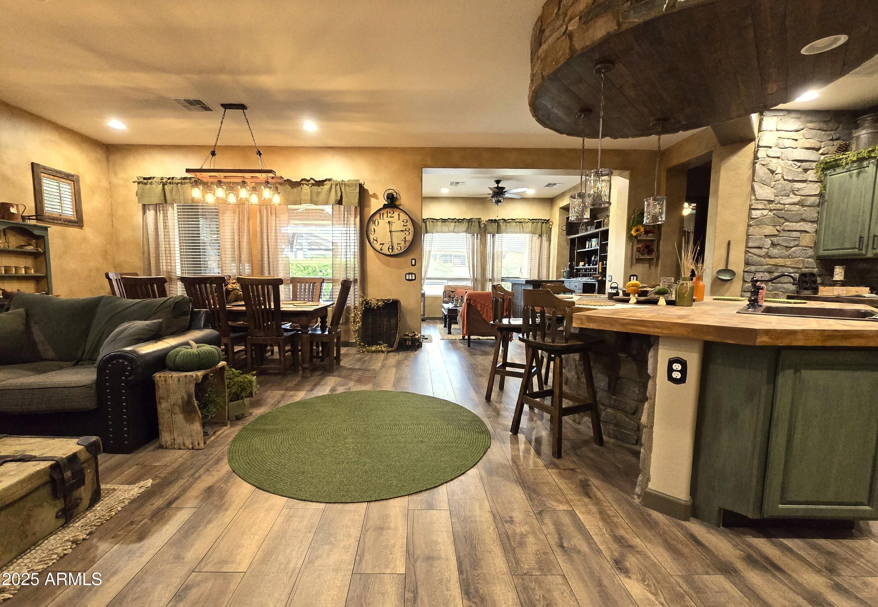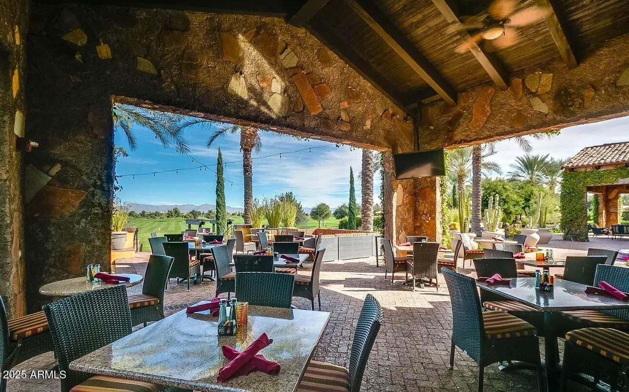 Welcome to this beautifully crafted Genova home on a desirable corner lot in the non-55+ section of Encanterra. A professionally landscaped front and side yard, with low-maintenance desert plants leads to a striking circular stone foyer that introduces the home's warm, rustic charm. A cozy den with a custom built-in bookcase offers a perfect space for work or relaxation. The open-concept living and dining area flows into a stunning kitchen featuring earth-toned green cabinetry, a stone backsplash, and an inviting circular island ideal for casual dining. Expansive windows and large sliding glass door fill the adjoining multi-use space with natural light and create a seamless indoor- outdoor connection. Step outside to a private backyard retreat with a lit covered patio with mister system Welcome to this beautifully crafted Genova home on a desirable corner lot in the non-55+ section of Encanterra. A professionally landscaped front and side yard, with low-maintenance desert plants leads to a striking circular stone foyer that introduces the home's warm, rustic charm. A cozy den with a custom built-in bookcase offers a perfect space for work or relaxation. The open-concept living and dining area flows into a stunning kitchen featuring earth-toned green cabinetry, a stone backsplash, and an inviting circular island ideal for casual dining. Expansive windows and large sliding glass door fill the adjoining multi-use space with natural light and create a seamless indoor-outdoor connection. Step outside to a private backyard retreat with a lit covered patio with mister system and an electric retractable awning, stone fireplace, tranquil water feature, hot tub, and putting greenframed by mature hedges for added privacy. The spacious primary suite includes a luxurious ensuite with dual vanities, a large walk-in shower, and a generous walk-in closet. The secondary bedroom is provided with its own full bath. Along with a guest-friendly half bath, a spacious laundry room with built-in desk complete the interior. A two-car garage and separate golf cart garage provide ample storage and flexibility. Residents enjoy world-class amenities including a private Tom Lehman designed 18 hole golf course, two clubhouses, indoor and outdoor pools, tennis and pickleball courts, spa retreat, luxurious locker rooms, fully remodeled fitness center, clubhouse dining, and a vibrant social calendarall within the gated, resort-style Encanterra community. Arrange for your private tour today and experience the lifestyle that awaits.