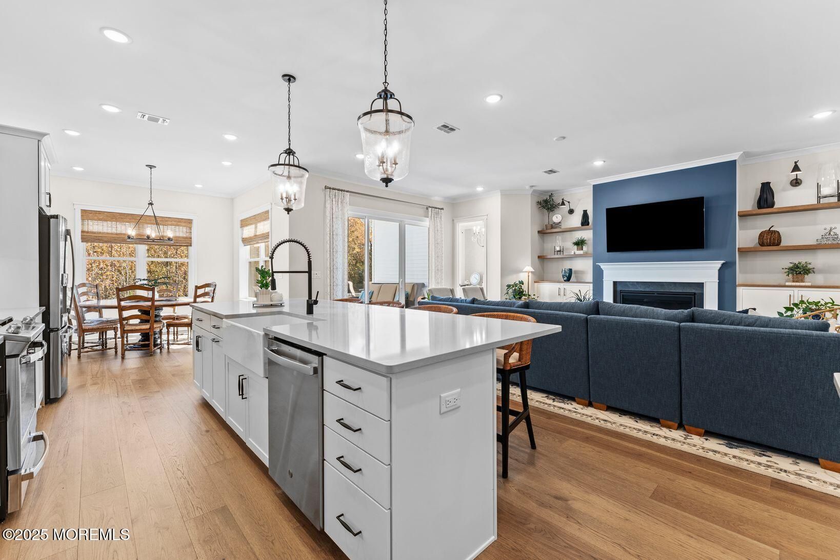 Welcome to modern farmhouse living at its finest in Four Seasons at Colts Farm, a premier 55+ community in Farmingdale. Just 2 years young, this stunning 3-bedrm, 3-bath home sits on a premium oversized lot backing to peaceful woods for ultimate privacy. Inside, you'll find wide-plank hdw floors, plantation shutters, and custom woven wood shades throughout. The open-concept layout flows seamlessly from the living room — featuring a gas fireplace framed by custom built-ins — to the chef's farmhouse kitchen with a huge center island, stainless steel appliances, and quartz counters. Enjoy your morning coffee in the sun-drenched breakfast nook, or work from home in the office/den just off the living room, enclosed by elegant glass French doors. The 1st-floor primary suite offers a tray ceiling, grasscloth wallpaper, and custom closets. Upstairs, a third bedroom, spacious loft and bonus room provide endless flexibility. Outside, relax on the custom paver patio with built-in "kitchen" and granite counters. Too many features to list this home is a must-see!