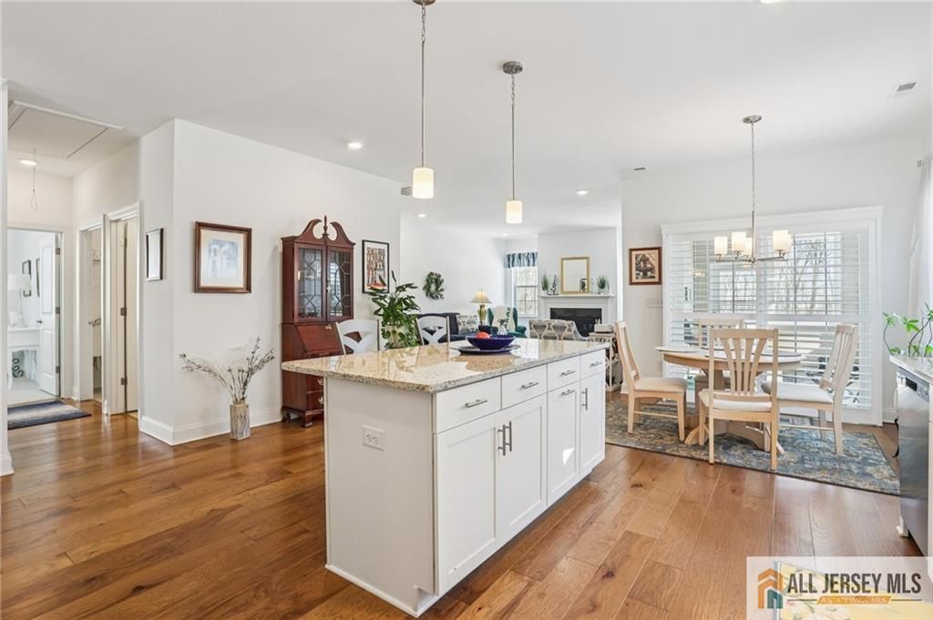 Perfectly positioned on one of the largest premium lots in the highly desirable Venue at Smithville Greene 55+ community, this beautifully maintained two-bedroom, two-bath residence offers exceptional spacing between homes, peaceful wooded surroundings, and tranquil water views that create a private, park-like setting. With the pond just beyond your backyard and nature as your backdrop, this home offers a rare sense of openness and calm that is seldom available within community living. The thoughtfully designed interior welcomes you with hardwood flooring, recessed lighting, and high-end blinds throughout, creating a refined and cohesive look. The open-concept living and dining areas are anchored by a cozy gas fireplace, offering a warm and inviting atmosphere ideal for both quiet evenings and entertaining. The eat-in kitchen blends elegance and functionality with granite countertops, a large center island, gas cooking, abundant cabinetry, a butler's pantry, and a walk-in pantry providing impressive storage and workspace for everyday living. The primary suite serves as a comfortable retreat, complete with a generous walk-in closet and an en-suite bath featuring a walk-in shower. A second bedroom and full bath accommodate guests with ease, while a dedicated office offers flexible space for working from home or pursuing hobbies. Additional highlights include a mudroom, laundry room, screened porch perfect for enjoying the natural setting, and a two-car attached garage with direct interior access. Above the garage, you'll find an expansive bonus space ideal for additional storage, a craft room or studio. Residents of Venue at Smithville Greene enjoy exceptional amenities including a clubhouse with activity rooms, fitness center, movie room, outdoor pool, tennis courts, and multiple gathering spaces designed for an active and social lifestyle. A premium lot. Water backdrop. Privacy. Comfort. Lifestyle. Opportunities like this do not come often.
