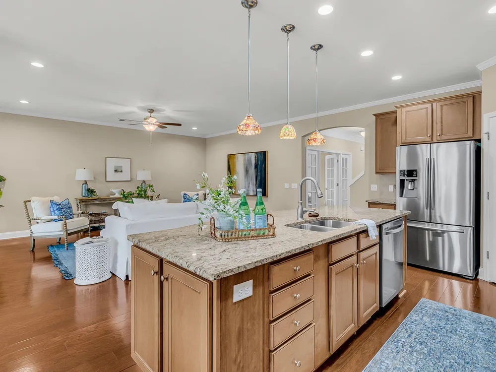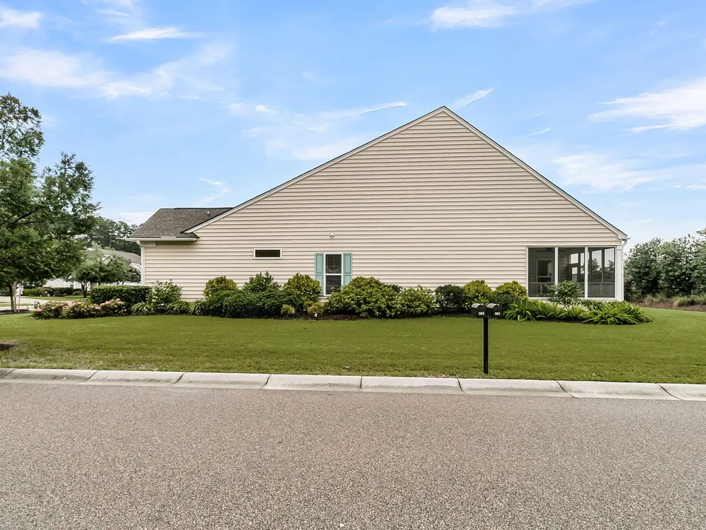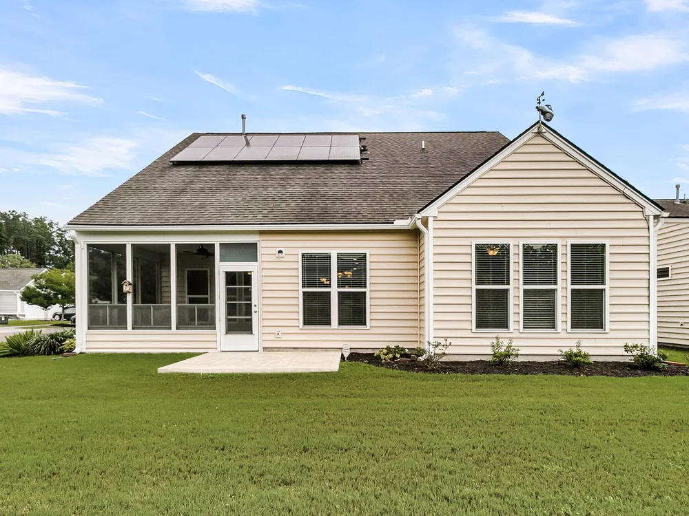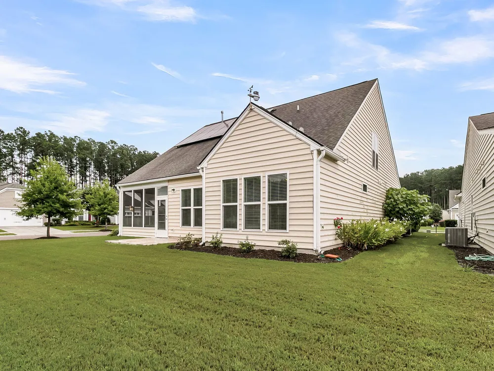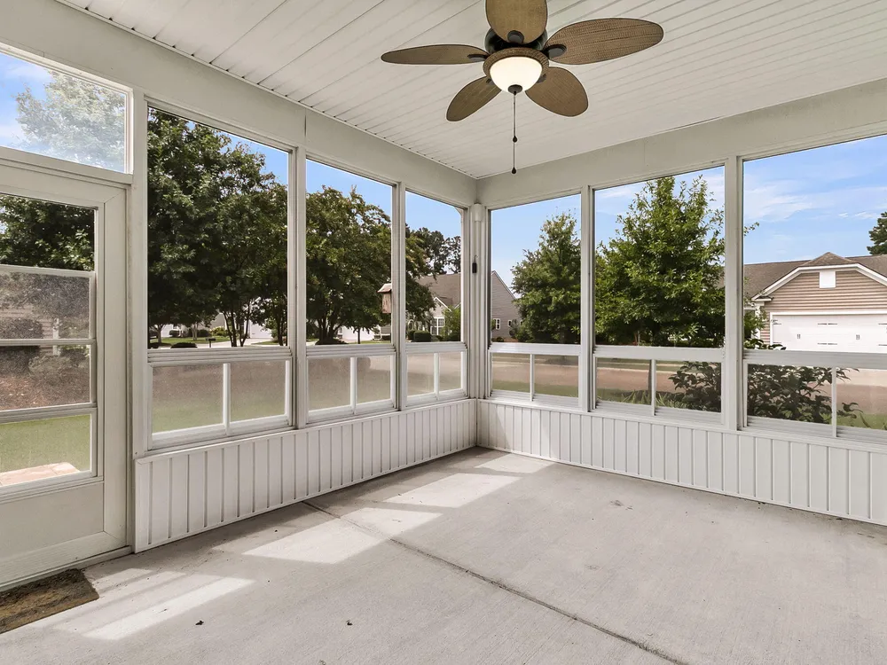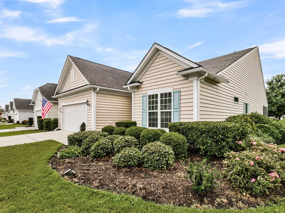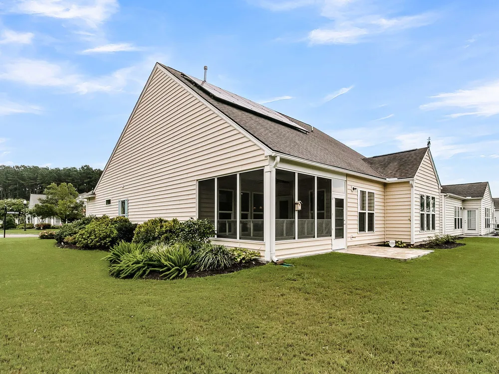 Impeccably kept home featuring 2 bedrooms, 2 baths and a French door office downstairs, an oversized upstairs loft space, and TONS of useful storage! This home is situated on a private corner homesite with backyard views of a private landscaped berm and community lagoon. Step inside to find five-inch hardwood floors extending throughout the living areas. The luxury island kitchen includes popular burlap colored cabinetry with double tray pull out storage, granite countertops, a five-burner gas cootkop, built-in wall oven & microwave, and included French door refrigerator, tile backsplash, pendant & under-cabinet lighting, and a corner pantry. The spacious living area and eat-in breakfast nook sit adjacent, a perfect layout for entertaining. The Owner's Suite offers new carpet, a trayceiling, and ensuite bath with double sink vanity, a separate built-in ladies vanity, walk-in shower, and walk-in closet. The downstairs guest bedroom has new carpet and is situated down its own private hallway with access to a full bath. A French door office and laundry room with built-in cabinetry complete the first floor. Head upstairs to find a large loft space and walk-in attic storage area. More storage opportunities are found in the garage - a 4' length extension and an extended third bay, perfect for woodworking, golf cart parking, or extra storage, plus a stairway leading up to even more attic storage space. You won't be missing your basement! Don't forget to check out the beautiful backyard space. A screened-in porch with retractable vinyl windows makes this a true Three-Season room, and an adjacent stamped concrete patio is the perfect place to enjoy the tranquil views. Solar panels have been installed, so you'll enjoy energy savings all year round! Don't miss out on this incredible home and incredible neighborhood! Del Webb Cane Bay is an award-winning, 55+ lifestyle community. With over 100 chartered clubs, a full-time lifestyle director, on-site HOA staff, and tons of community activities, you'll be living your very best life in your new home and neighborhood!