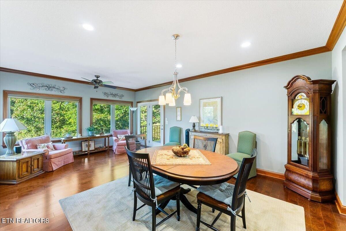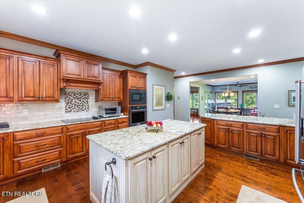 Discover relaxed, main-level living in this Sprawling Custom Tellico Village Ranch, designed for comfort, convenience, and the easy-going lifestyle so many buyers seek. Nearly 3,000 sq. ft. of thoughtfully planned space on the main floor creates an open, airy environment ideal for everyday living and effortless entertaining. The heart of this home is the exceptionally large great room, where an expansive living area flows seamlessly into an oversized dining space and a chef-inspired kitchen. Whether hosting family gatherings, game nights, or quiet evenings at home, this wide-open layout offers plenty of room to move, mingle, and relax. Tall ceilings, abundant natural light, and gleaming hardwood floors enhance the sense of space and sophistication. The gourmet kitchen stands out with its generous proportions: a substantial center island, abundant custom cabinetry, granite countertops, and a built-in oven—making meal prep and entertaining both easy and enjoyable. The dining area easily accommodates larger tables, perfect for holiday meals or entertaining friends, while the spacious living room features a dramatic stone Heat N Glo fireplace and custom built-ins. The private owner's suite is a peaceful retreat complete with dual walk-in closets and a spa-inspired ceramic shower designed for comfort. With four bedrooms and three-and-a-half baths, the layout offers both privacy and plenty of space for visiting family or guests. A 726 sq. ft. walkout lower level—provides exceptional flexibility for hobbies, storage, or future finished space. Step outside onto the patio to enjoy morning coffee or outdoor dining surrounded by East Tennessee's natural beauty. Additional features include a 2.5-car garage, dedicated laundry room, encapsulated crawlspace with dehumidifier, and abundant storage—all supporting a low-maintenance, comfortable lifestyle.