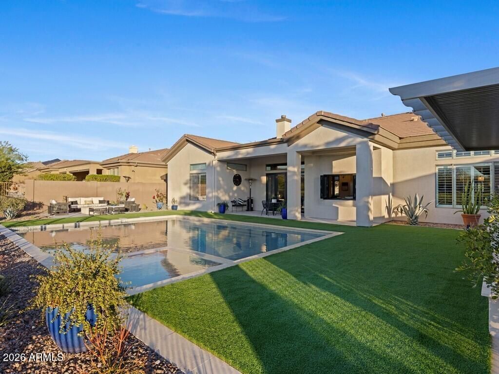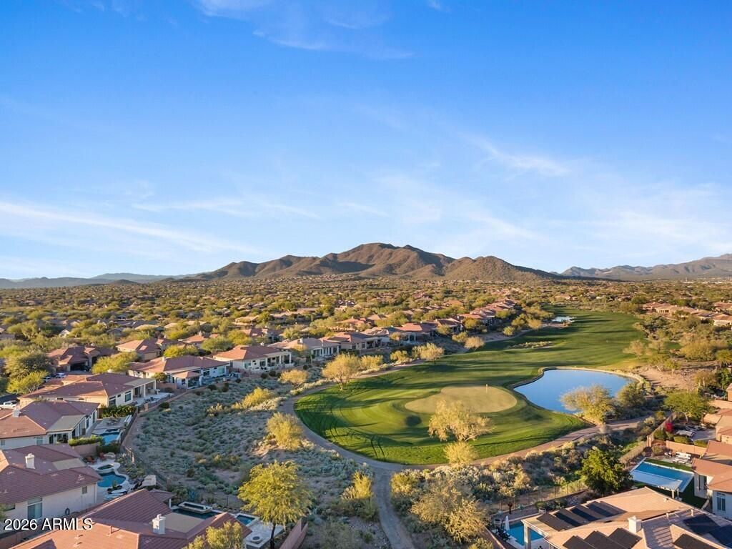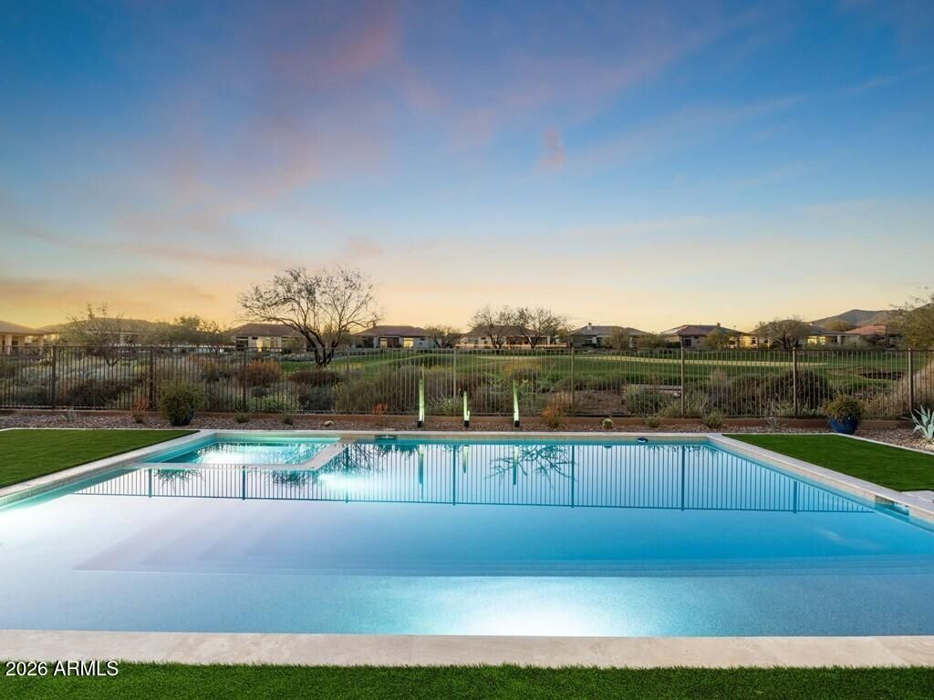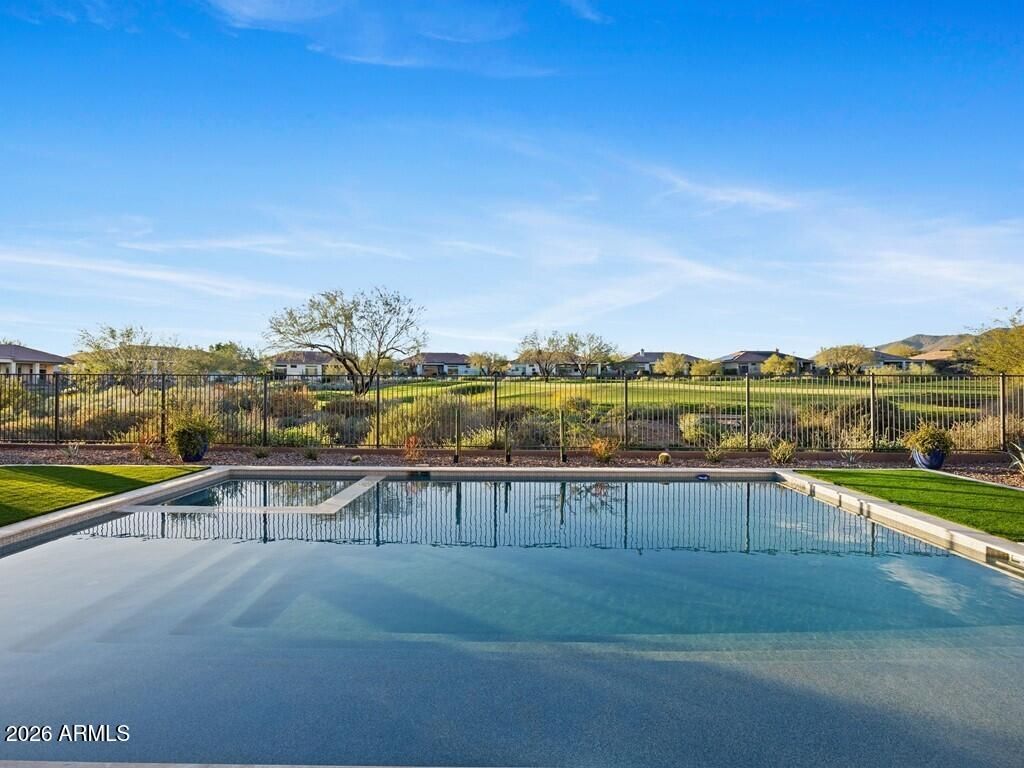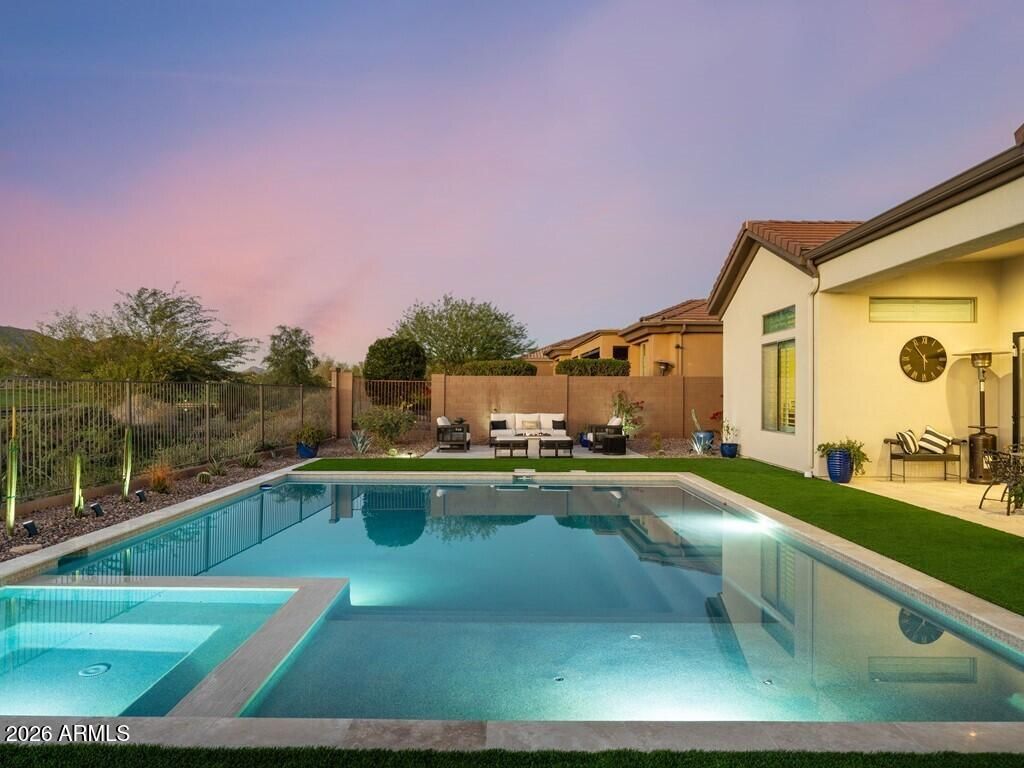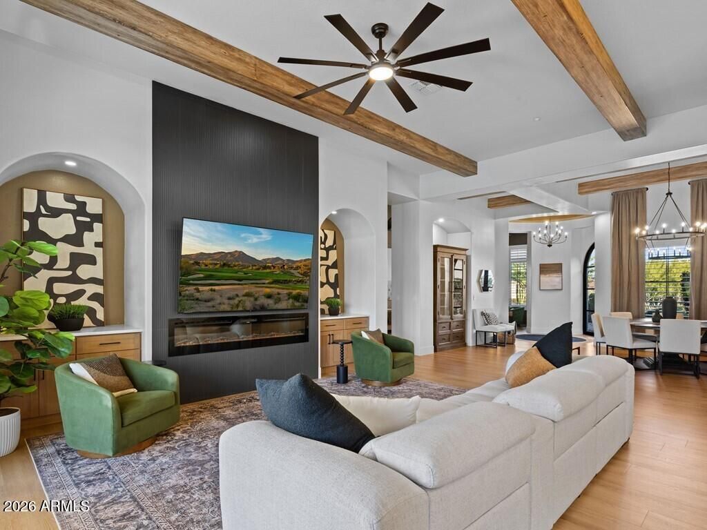 Welcome to this stunning 4-bedroom, 3.5-bathroom single-level residence with 12 ft ceilings that seamlessly blends sophisticated design with Arizona desert living at its finest. Situated on an expansive golf course view lot, this beautifully updated home offers refined finishes and exceptional attention to detail. New wide plank engineered oak flooring spans the interior, while custom lighting enhances each space with a welcoming, sophisticated glow. A formal living room area made for entertainment, with a full bar setup with dual beverage fridges and ice maker. A separate formal dining area for gatherings galore round out the front area of the home, flowing seamlessly into the great room and kitchen areas that are open and spacious with architectural ceiling beams that add charact throughout. Pocket doors open completely, creating effortless indoor-outdoor flow to the covered patio area. Built-in niches surround the electric built-in fireplace in the great room area. The open kitchen is nothing short of a culinary dream, featuring brand new custom cabinetry that hosts plenty of storage space! An oversized, striking quartz-top island with eat-up bar seating, and a professional-grade suite of Wolf appliances including a 6-burner gas cooktop with griddle, double wall ovens, and built-in coffee maker, all complemented by a Subzero refrigerator. A full buffet storage area with a pass-through window to the outdoor area. A split floor plan with the primary bedroom room and laundry area on one side. The primary bathroom showcases elegant waterfall edge vanities along with a soaking tub and separate shower. For wellness enthusiasts, an indoor sauna offers the perfect retreat after a long day. On the other side of the home are three additional guest rooms making plenty of space for family or friends. One bedroom with an en-suite bath and walk-in closet, while the other two bedrooms share a jack-n-jill bath. In addition, a powder bath rounds out this side of the home. But the magic truly happens outdoors. Your own private resort oasis features a sparkling pool with heated hot tubequipped with all-new equipment including dual variable speed pumps. A generous covered pergola with a Fire-Magic grill and Blackstone griddle sets the stage for unforgettable gatherings. Enjoy the incredible sunset and golf course views lounging in the extended patio area with built-in fire table. A mix of synthetic grass and desert landscaping with a view fence with some gorgeous views. The quality construction extends to recent mechanical updates including refreshed heating and cooling systems and an extra-depth garage for your convenience. Located near the prestigious Anthem Country Club and expansive Anthem Community Park, this community delivers exceptional amenities and a welcoming environment. Whether it's playing golf, tennis, basketball or sand volleyball, there is no shortage of activities for one. Tons of walking and biking trails for one's enjoyment, it is its own community like any other. Be prepared to fall in love!