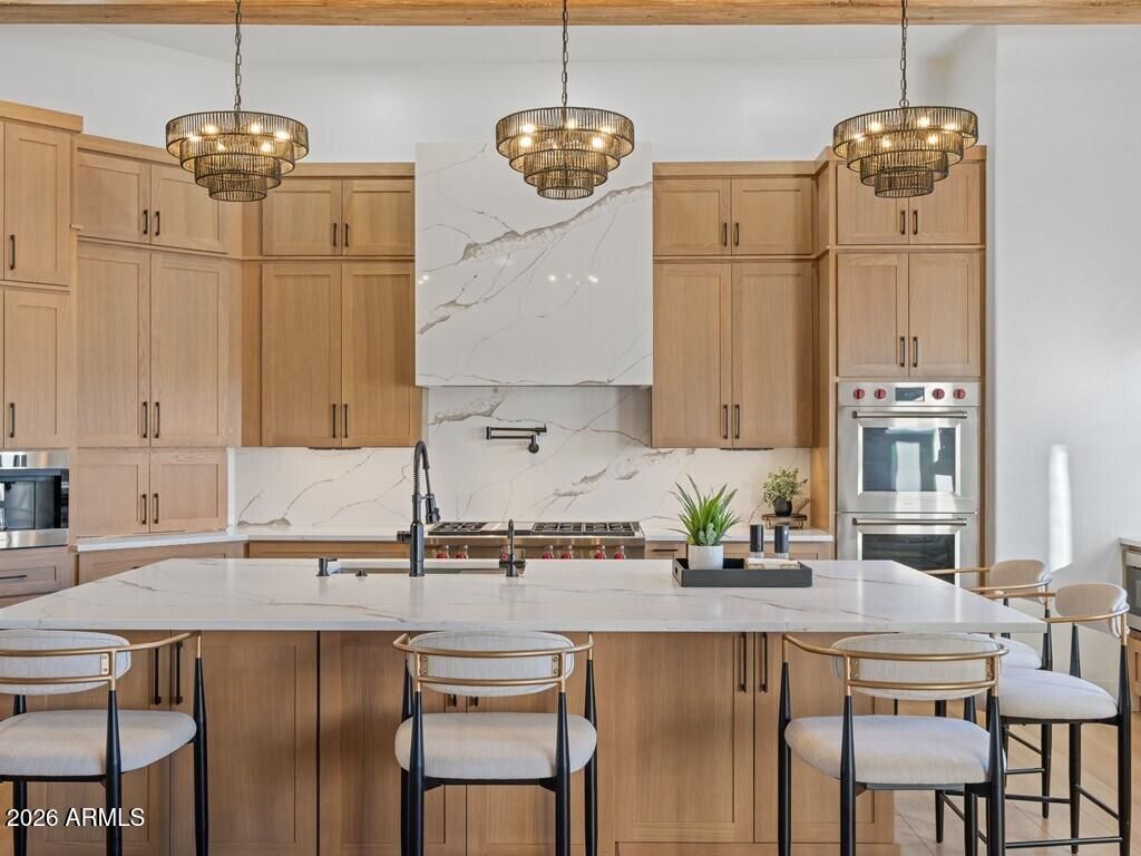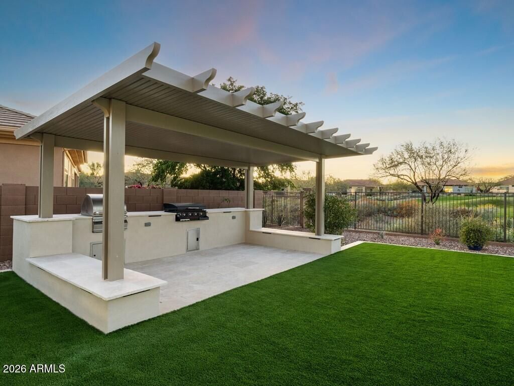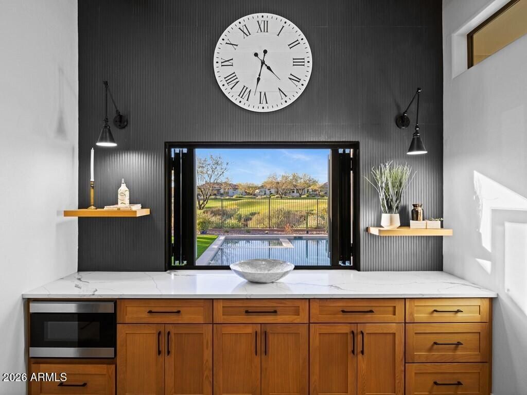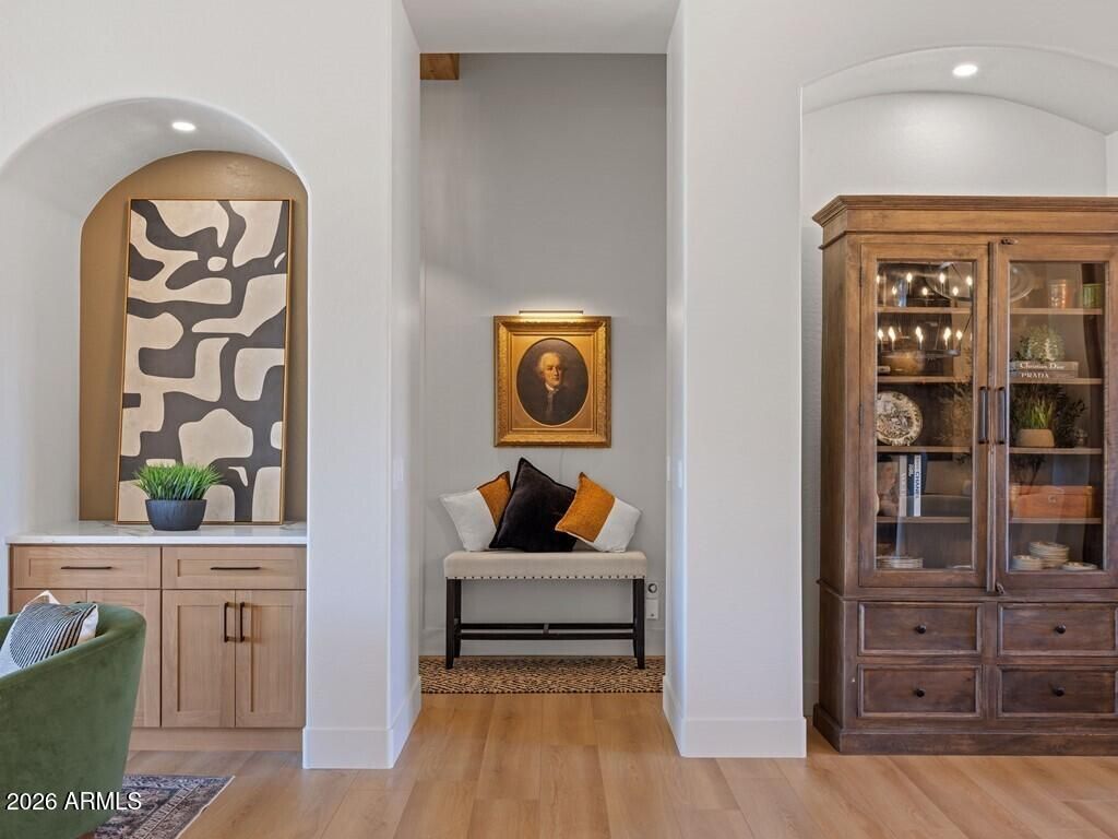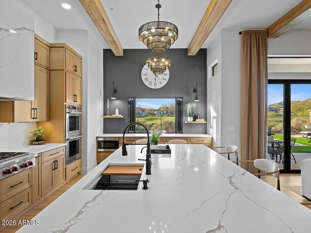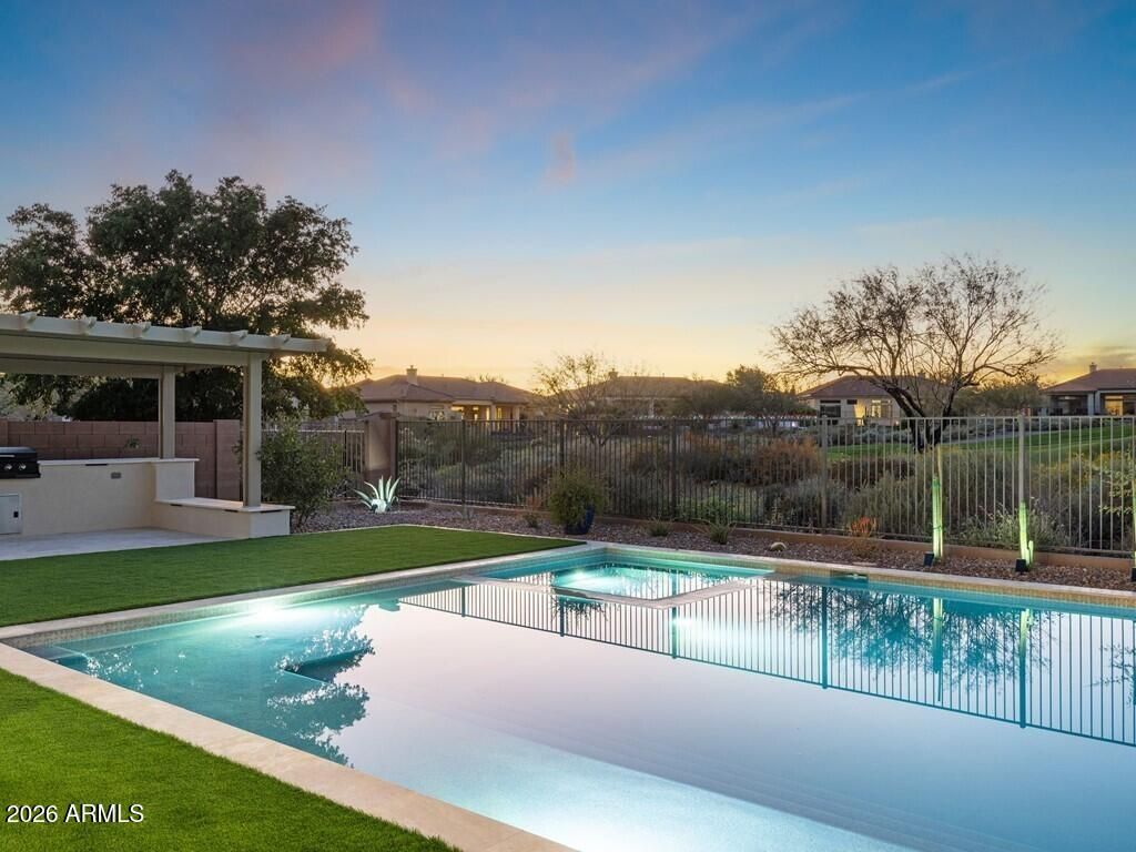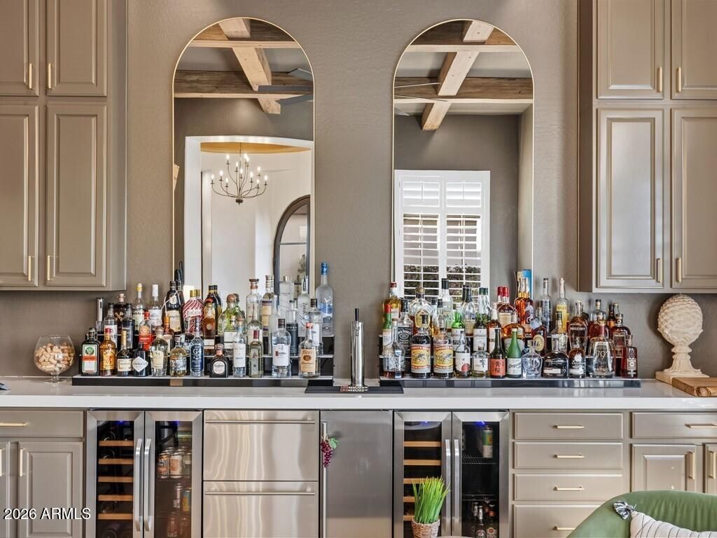 Welcome to this stunning 4-bedroom, 3.5-bathroom single-level residence with 12 ft ceilings that seamlessly blends sophisticated design with Arizona desert living at its finest. Situated on an expansive golf course view lot, this beautifully updated home offers refined finishes and exceptional attention to detail. New wide plank engineered oak flooring spans the interior, while custom lighting enhances each space with a welcoming, sophisticated glow. A formal living room area made for entertainment, with a full bar setup with dual beverage fridges and ice maker. A separate formal dining area for gatherings galore round out the front area of the home, flowing seamlessly into the great room and kitchen areas that are open and spacious with architectural ceiling beams that add charact throughout. Pocket doors open completely, creating effortless indoor-outdoor flow to the covered patio area. Built-in niches surround the electric built-in fireplace in the great room area. The open kitchen is nothing short of a culinary dream, featuring brand new custom cabinetry that hosts plenty of storage space! An oversized, striking quartz-top island with eat-up bar seating, and a professional-grade suite of Wolf appliances including a 6-burner gas cooktop with griddle, double wall ovens, and built-in coffee maker, all complemented by a Subzero refrigerator. A full buffet storage area with a pass-through window to the outdoor area. A split floor plan with the primary bedroom room and laundry area on one side. The primary bathroom showcases elegant waterfall edge vanities along with a soaking tub and separate shower. For wellness enthusiasts, an indoor sauna offers the perfect retreat after a long day. On the other side of the home are three additional guest rooms making plenty of space for family or friends. One bedroom with an en-suite bath and walk-in closet, while the other two bedrooms share a jack-n-jill bath. In addition, a powder bath rounds out this side of the home. But the magic truly happens outdoors. Your own private resort oasis features a sparkling pool with heated hot tubequipped with all-new equipment including dual variable speed pumps. A generous covered pergola with a Fire-Magic grill and Blackstone griddle sets the stage for unforgettable gatherings. Enjoy the incredible sunset and golf course views lounging in the extended patio area with built-in fire table. A mix of synthetic grass and desert landscaping with a view fence with some gorgeous views. The quality construction extends to recent mechanical updates including refreshed heating and cooling systems and an extra-depth garage for your convenience. Located near the prestigious Anthem Country Club and expansive Anthem Community Park, this community delivers exceptional amenities and a welcoming environment. Whether it's playing golf, tennis, basketball or sand volleyball, there is no shortage of activities for one. Tons of walking and biking trails for one's enjoyment, it is its own community like any other. Be prepared to fall in love!