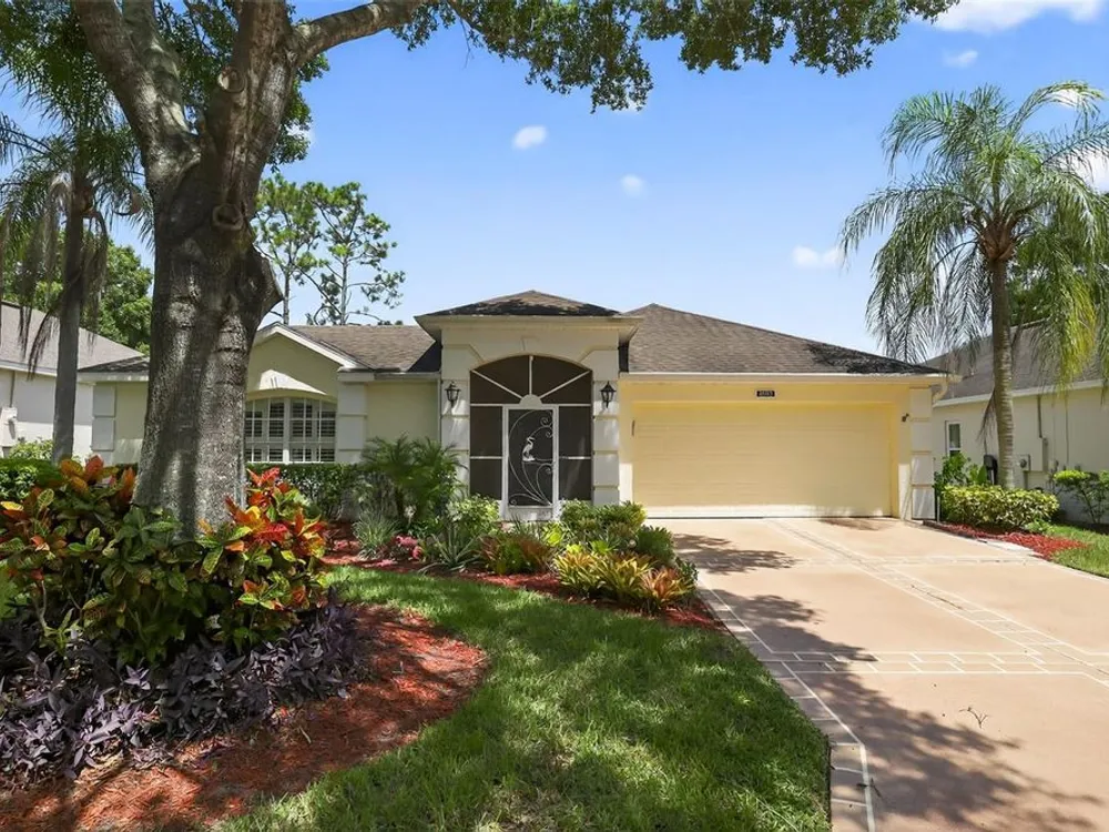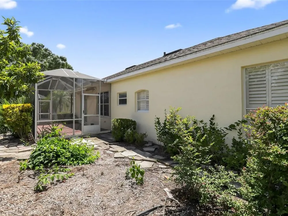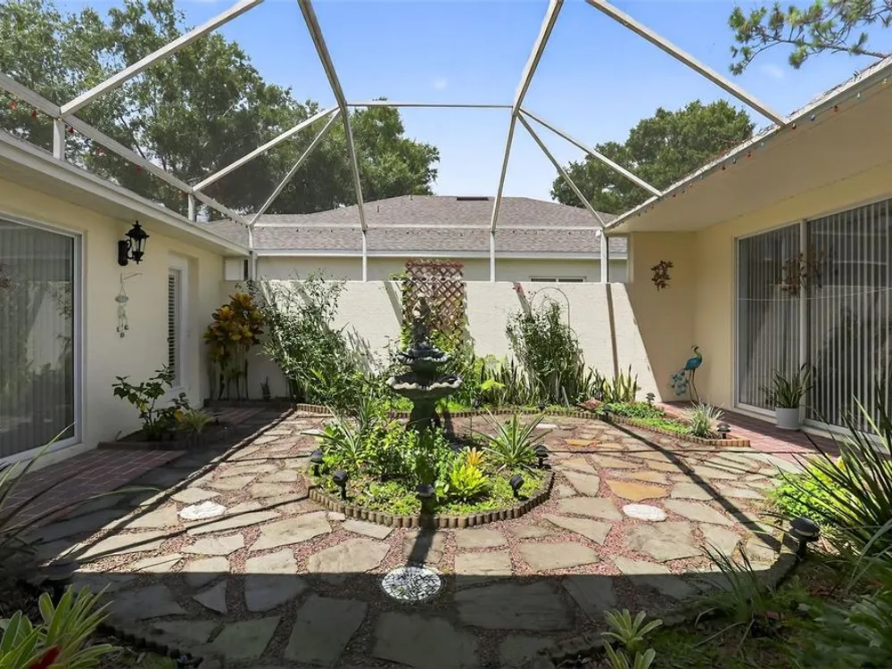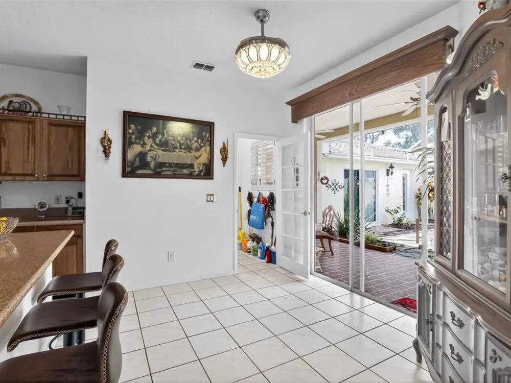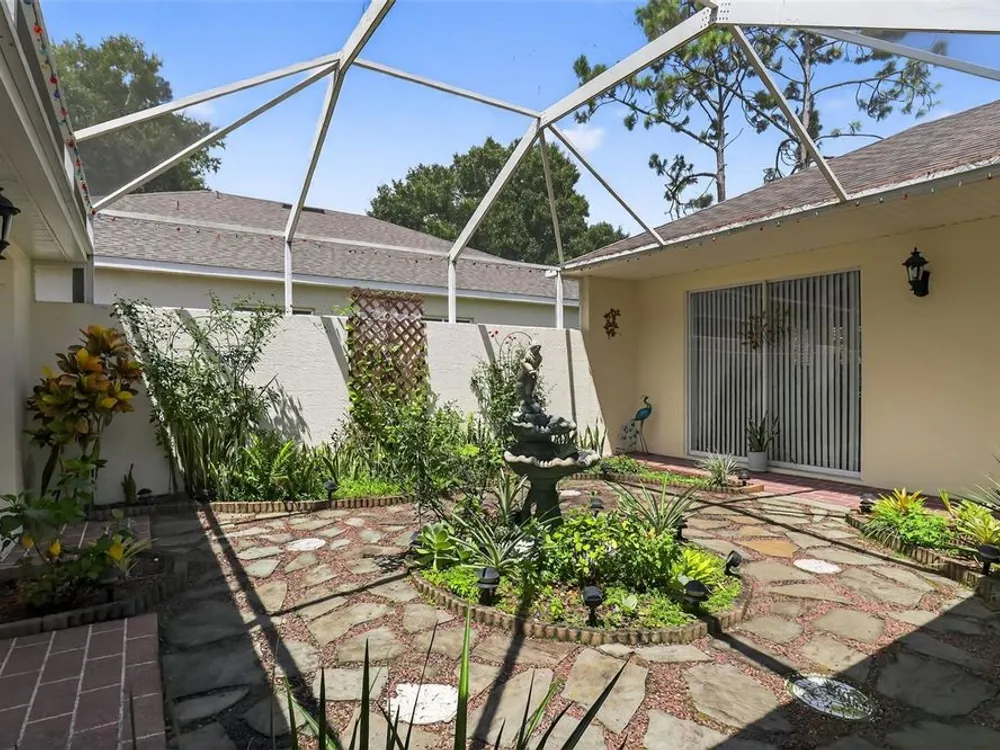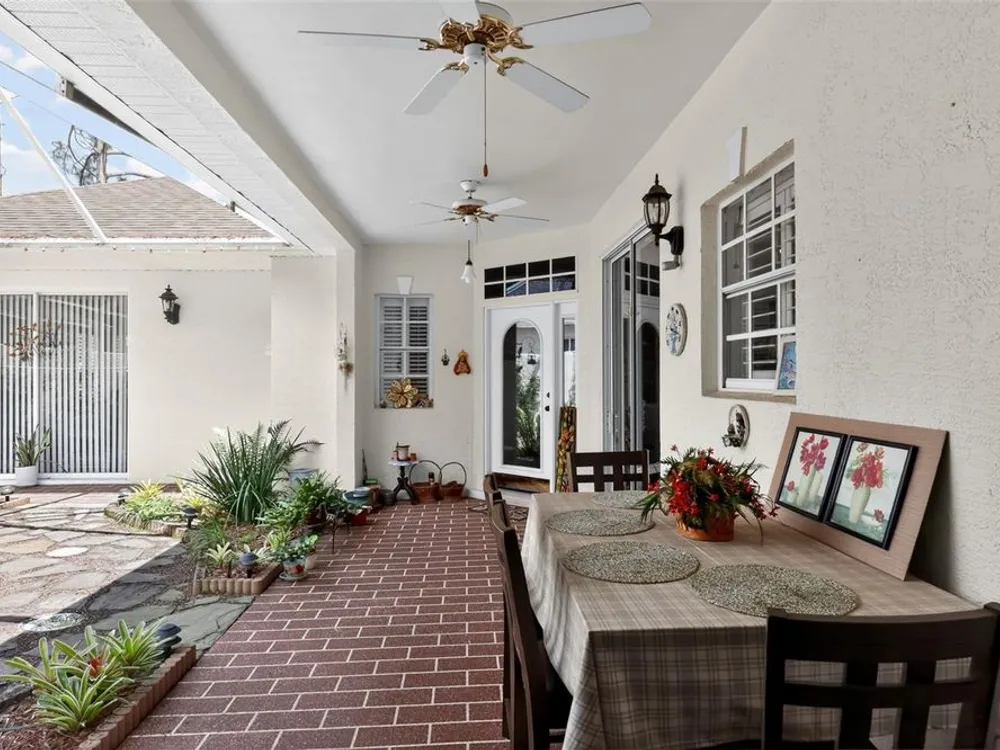 Welcome to 4003 Hammersmith Drive, a beautifully maintained St. Ives II courtyard home nestled in the serene, 55+ gated Kings Ridge community of Clermont. This residence offers a private enclosed courtyard, 3 bedrooms (including an ideal in-law suite), 2 full bathrooms, and a 2-car garage. At the heart of the property, a charming open-air courtyard separates the in-law suite from the main home, creating both privacy and a relaxing outdoor space. The kitchen features granite countertops, stainless steel appliances, and plantation shutters, complemented by tile and laminate flooring throughout. The spacious master suite includes a walk-in shower, garden tub, and plenty of room for comfort. A covered rear patio provides a tranquil retreat, ideal for gardening or simply enjoying quiet moments. Kings Ridge offers resort-style amenities, including heated swimming pools, a fitness center, clubhouse with planned activities, tennis and pickleball courts, and golf cart access to nearby shopping and dining. This home is turnkey and move-in ready, combining comfort, functionality, and lifestyle. Don’t miss this opportunity to live in one of Clermont’s most desirable 55+ communities—schedule your private showing today!
