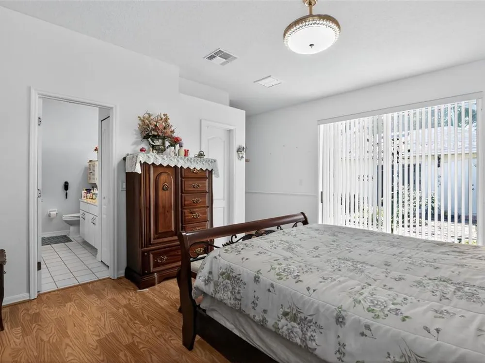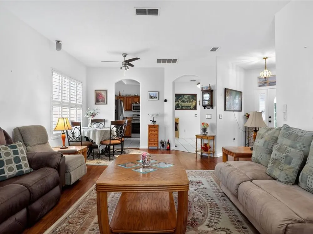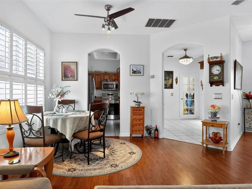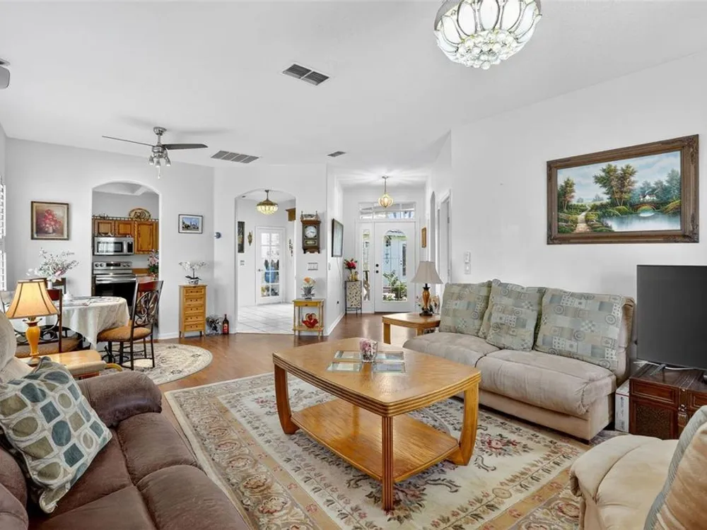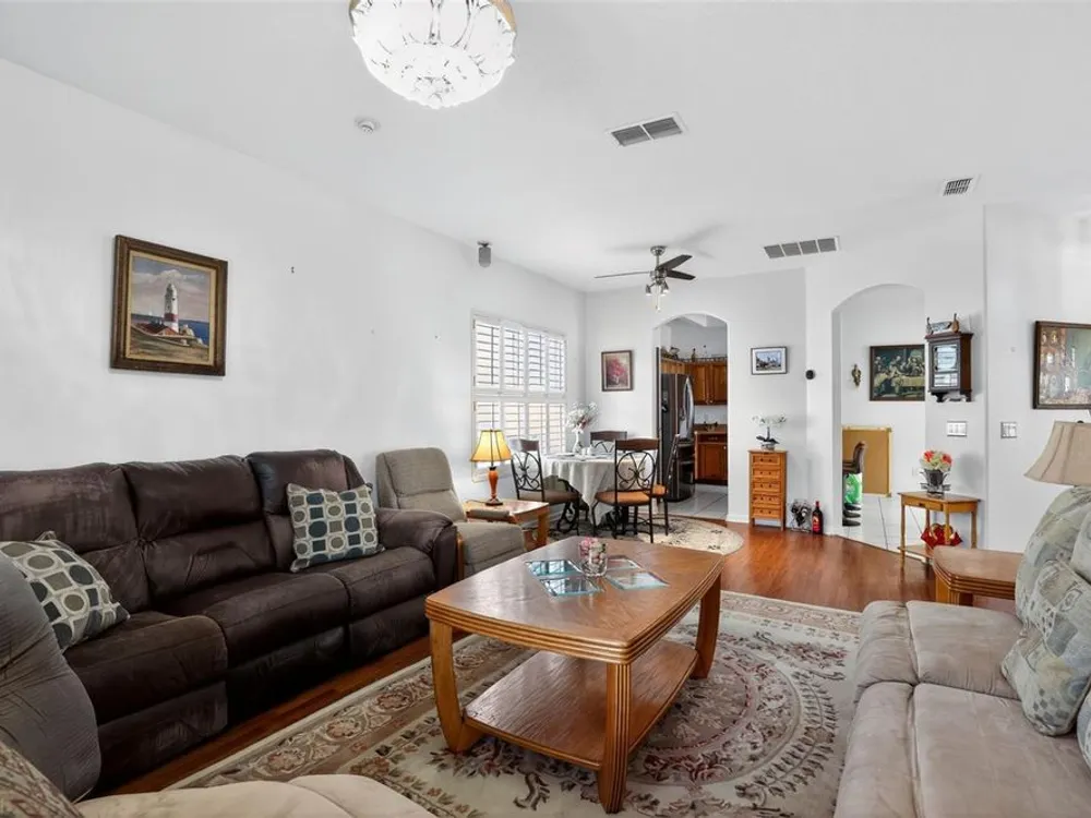 Welcome to 4003 Hammersmith Drive, a beautifully maintained St. Ives II courtyard home nestled in the serene, 55+ gated Kings Ridge community of Clermont. This residence offers a private enclosed courtyard, 3 bedrooms (including an ideal in-law suite), 2 full bathrooms, and a 2-car garage. At the heart of the property, a charming open-air courtyard separates the in-law suite from the main home, creating both privacy and a relaxing outdoor space. The kitchen features granite countertops, stainless steel appliances, and plantation shutters, complemented by tile and laminate flooring throughout. The spacious master suite includes a walk-in shower, garden tub, and plenty of room for comfort. A covered rear patio provides a tranquil retreat, ideal for gardening or simply enjoying quiet moments. Kings Ridge offers resort-style amenities, including heated swimming pools, a fitness center, clubhouse with planned activities, tennis and pickleball courts, and golf cart access to nearby shopping and dining. This home is turnkey and move-in ready, combining comfort, functionality, and lifestyle. Don’t miss this opportunity to live in one of Clermont’s most desirable 55+ communities—schedule your private showing today!