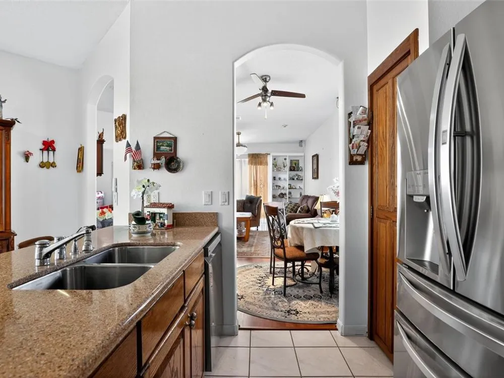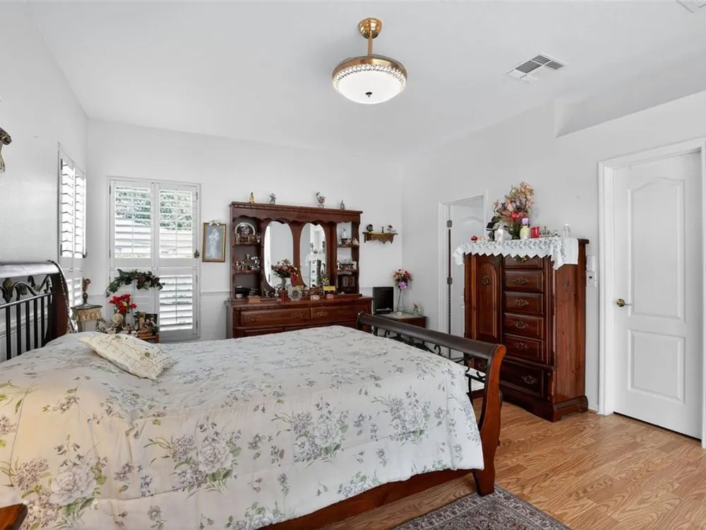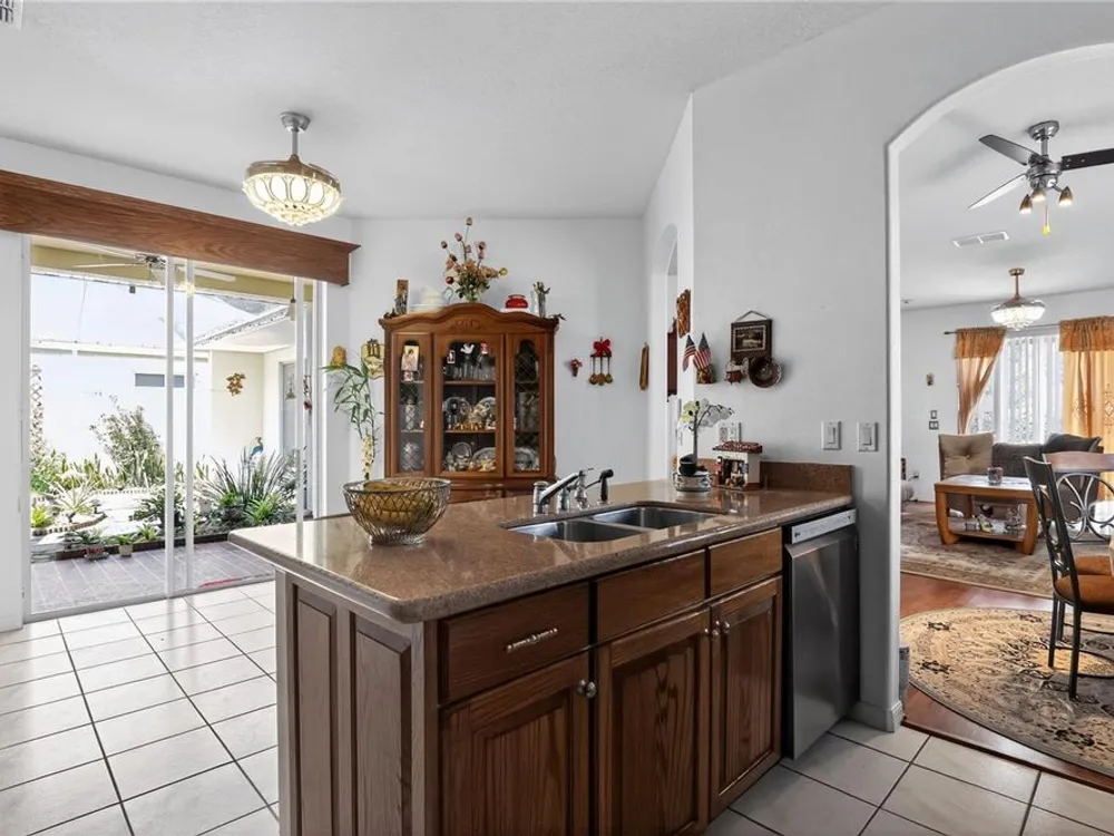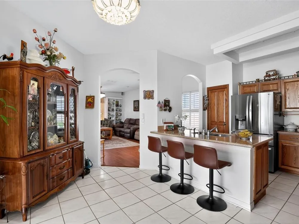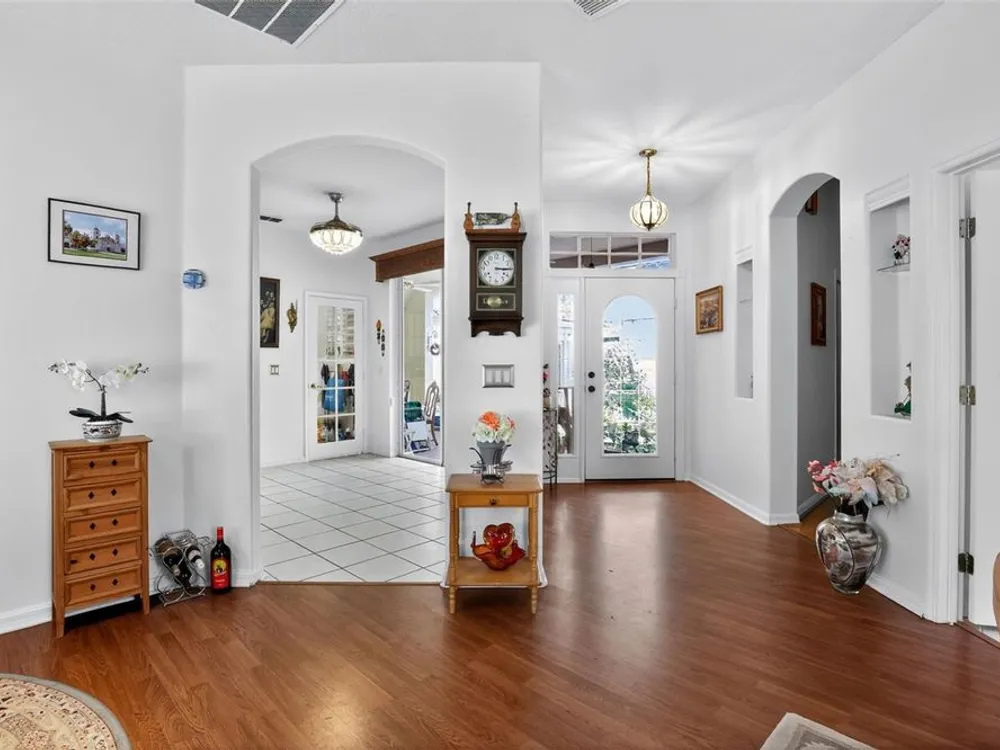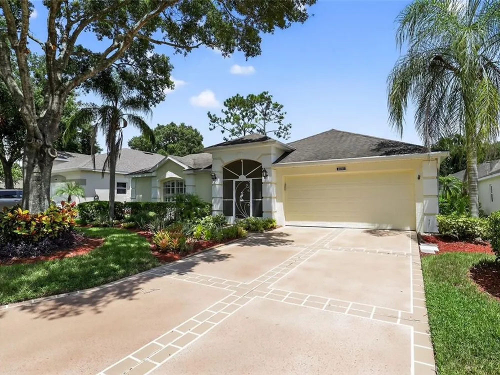 Welcome to 4003 Hammersmith Drive, a beautifully maintained St. Ives II courtyard home nestled in the serene, 55+ gated Kings Ridge community of Clermont. This residence offers a private enclosed courtyard, 3 bedrooms (including an ideal in-law suite), 2 full bathrooms, and a 2-car garage. At the heart of the property, a charming open-air courtyard separates the in-law suite from the main home, creating both privacy and a relaxing outdoor space. The kitchen features granite countertops, stainless steel appliances, and plantation shutters, complemented by tile and laminate flooring throughout. The spacious master suite includes a walk-in shower, garden tub, and plenty of room for comfort. A covered rear patio provides a tranquil retreat, ideal for gardening or simply enjoying quiet moments. Kings Ridge offers resort-style amenities, including heated swimming pools, a fitness center, clubhouse with planned activities, tennis and pickleball courts, and golf cart access to nearby shopping and dining. This home is turnkey and move-in ready, combining comfort, functionality, and lifestyle. Don’t miss this opportunity to live in one of Clermont’s most desirable 55+ communities—schedule your private showing today!