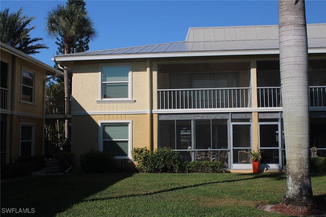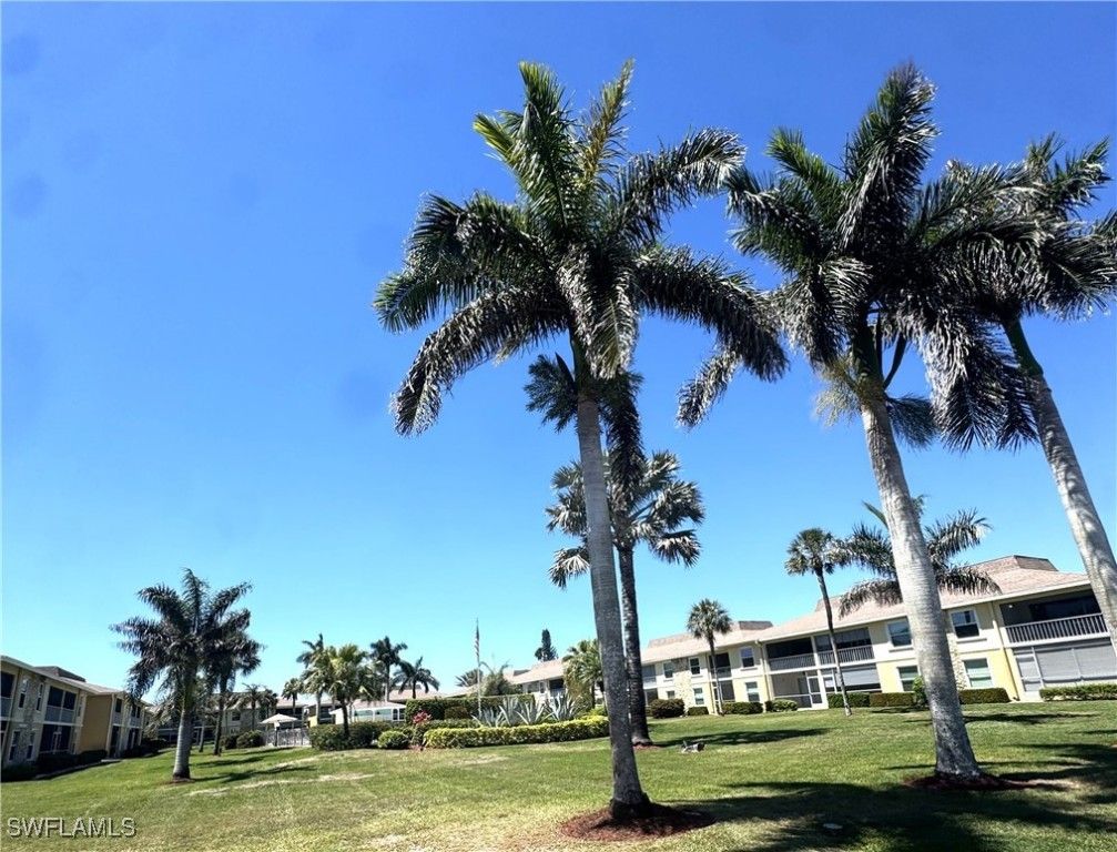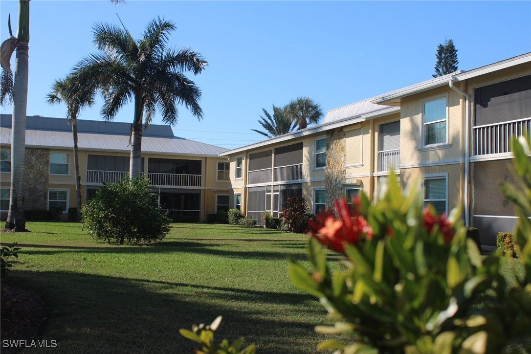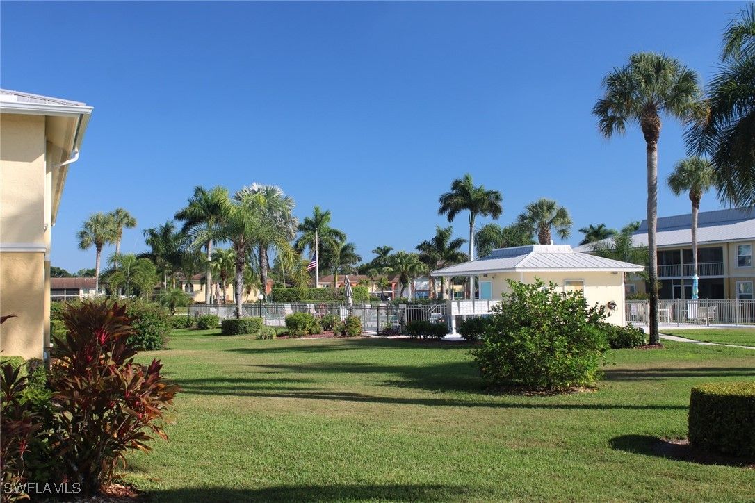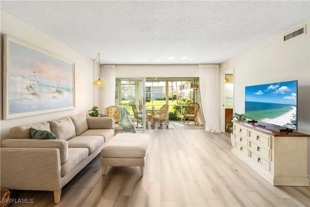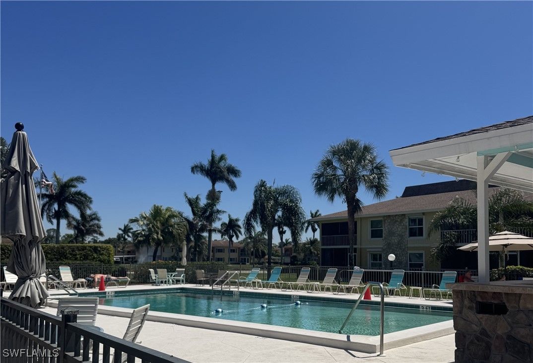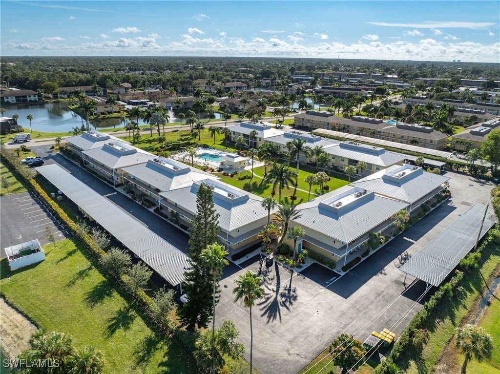 Priced to sell! This light and bright end unit is freshly painted throughout, with brand new LVP floors in all living areas. Bathrooms are both newly updated with modern vanities, mirrors, lighting, and new tile floors. This stylish condo is a much sought after first floor end unit, with covered assigned parking and guest parking steps from the front door. The lanai gives direct access to the pool, grill, and cheeky bar and comes with a power shutter for added shade/ storm/rain protection. Windows are hurricane rated and there is a brand new roof! Enjoy this vibrant community with regular "happy hours" for those who like to socialize, and plenty of places to walk or ride bikes. It is also just minutes to pristene Naples beaches, 5th Ave S, shopping, restaurants, groceries, and so much more. Affordable HOA fees with an extensive list of inclusions, and located in Flood Zone X500. This is a mostly 55+ community, no pets. Professional photos to come after recent updates!