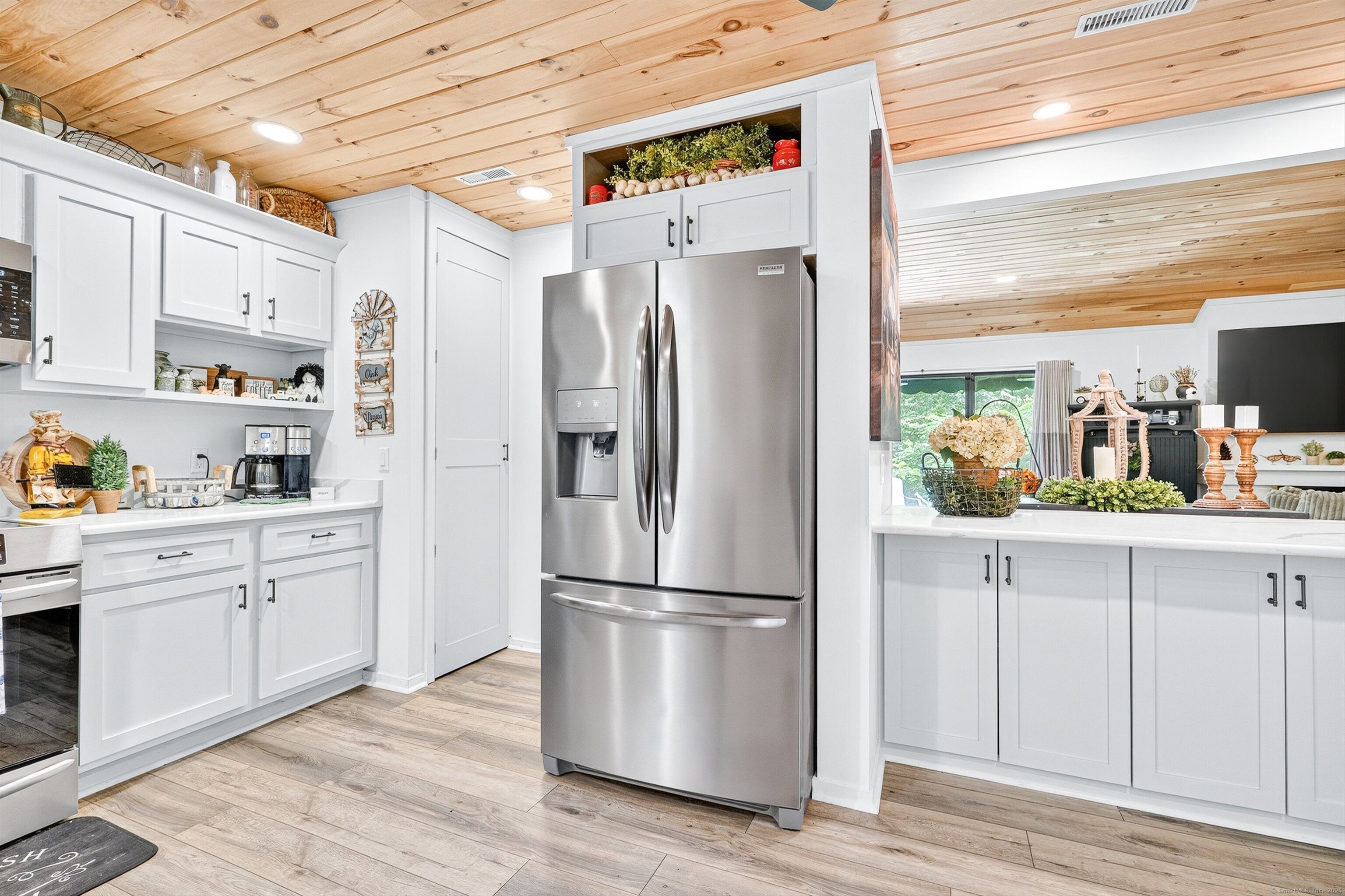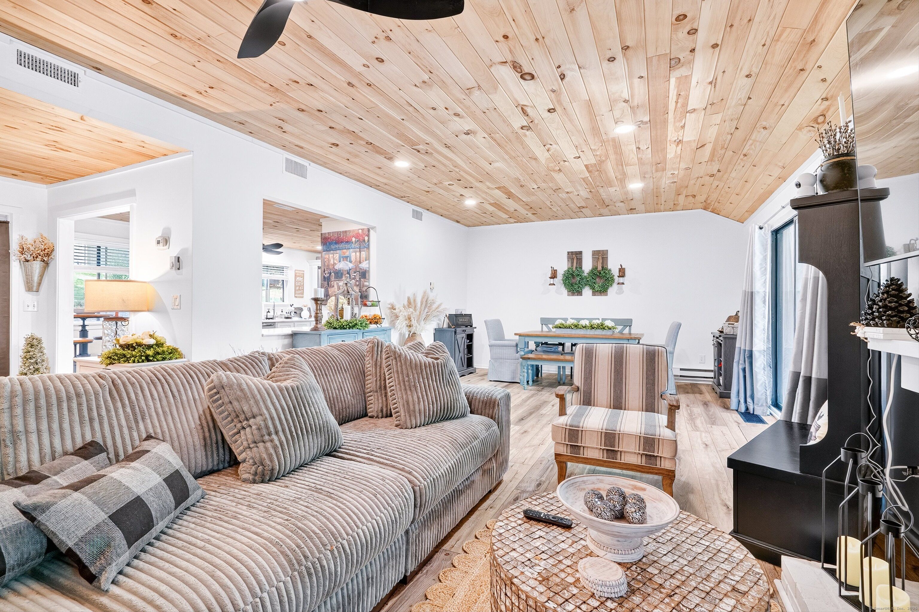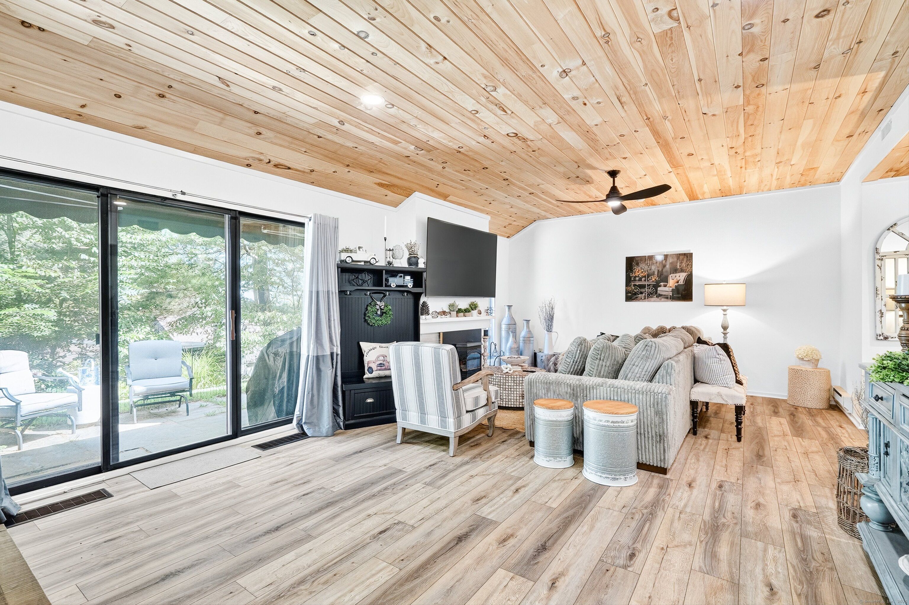 Step into this beautifully renovated 2-bedroom Sherman end-unit in the sought-after Heritage Village. Flooded with natural light, this home stands out as one of the brightest and most inviting residences in the community. The kitchen is a true showpiece, designed with quartz countertops, brand-new stainless steel appliances (including an induction range and bottom-freezer refrigerator), and a custom-built L-shaped window bench that perfectly frames your dining space. A breakfast bar window opens directly into the living/dining area-ideal for entertaining with ease. The open layout flows seamlessly into a spacious dining room with sliders to your own private patio. A cozy wood-burning fireplace with pellet stove insert creates the perfect atmosphere for quiet evenings at home, while a mounted Smart TV with soundbar (included) is ready for your next movie night. Custom details are found throughout, including 1x6 knotty pine ceilings with stylish black lighting and ceiling fans, along with wide-plank luxury vinyl oak flooring-durable, pet-friendly, and waterproof. Both bathrooms have been updated, and the new washer/dryer makes daily living even more convenient. A pull-down attic adds extra storage space. This home offers privacy, tranquility, and character-truly move-in ready. Don't miss your chance to own one of the most desirable units in Heritage Village. HOA includes internet and cable. Buyers pay a one-time equity fee of $5,000.00 at closing to Heritage Village Foundation.