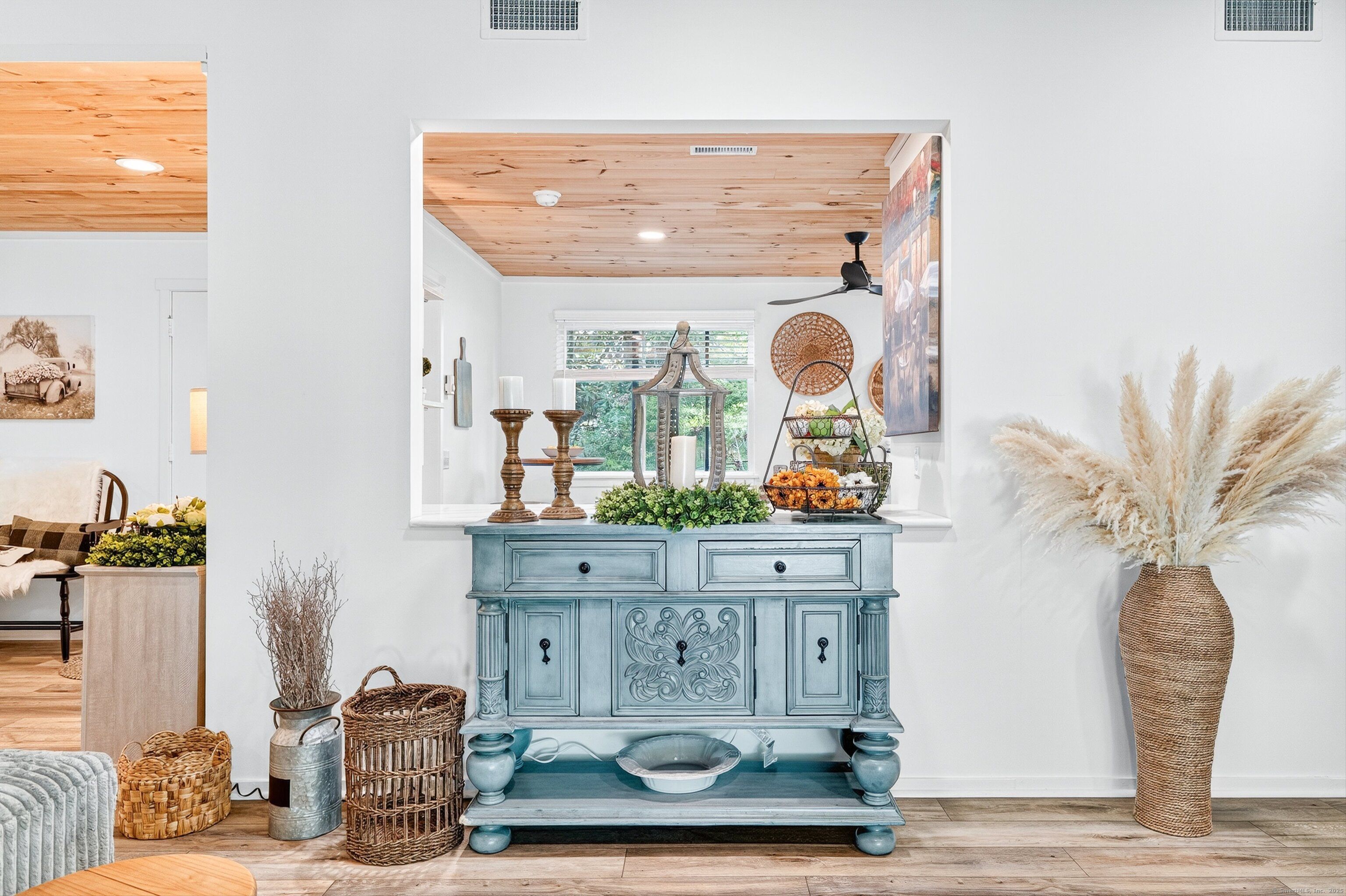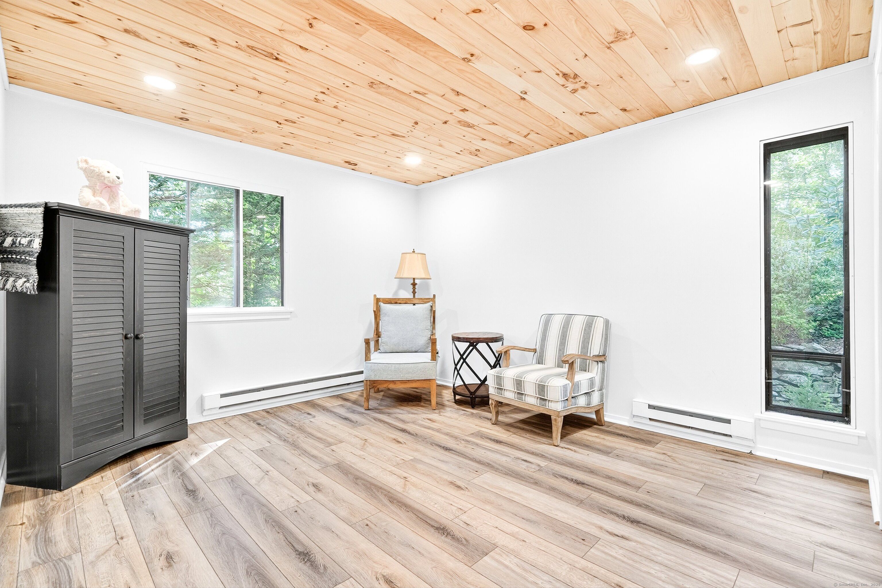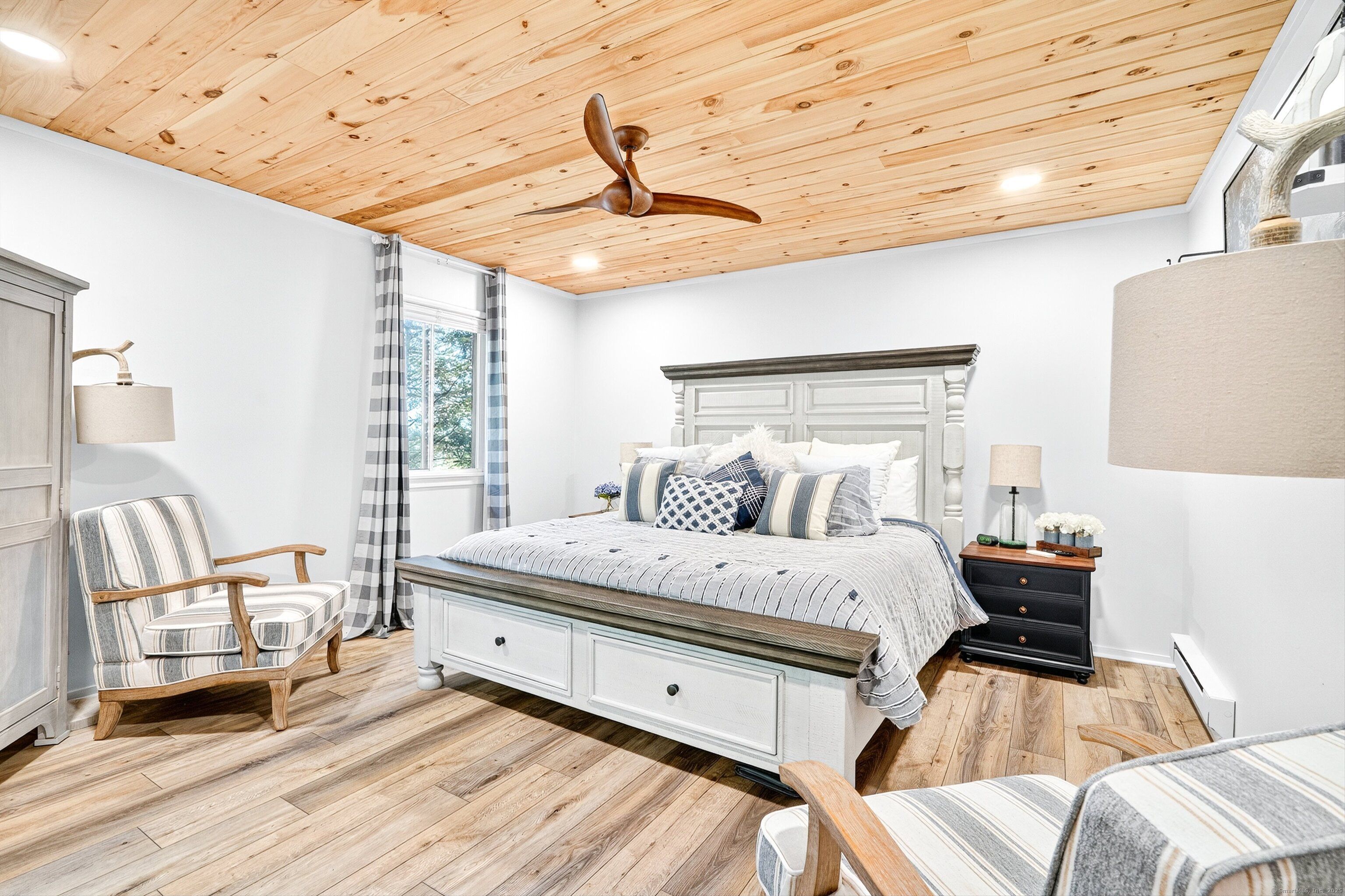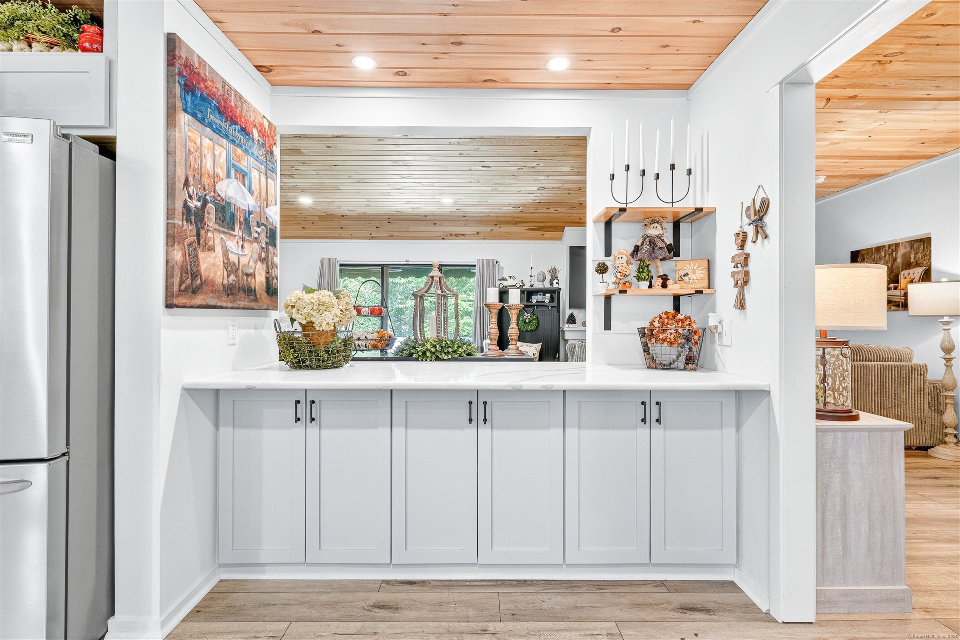Step into this beautifully renovated 2-bedroom Sherman end-unit in the sought-after Heritage Village. Flooded with natural light, this home stands out as one of the brightest and most inviting residences in the community. The kitchen is a true showpiece, designed with quartz countertops, brand-new stainless steel appliances (including an induction range and bottom-freezer refrigerator), and a custom-built L-shaped window bench that perfectly frames your dining space. A breakfast bar window opens directly into the living/dining area-ideal for entertaining with ease. The open layout flows seamlessly into a spacious dining room with sliders to your own private patio. A cozy wood-burning fireplace with pellet stove insert creates the perfect atmosphere for quiet evenings at home, while a mounted Smart TV with soundbar (included) is ready for your next movie night. Custom details are found throughout, including 1x6 knotty pine ceilings with stylish black lighting and ceiling fans, along with wide-plank luxury vinyl oak flooring-durable, pet-friendly, and waterproof. Both bathrooms have been updated, and the new washer/dryer makes daily living even more convenient. A pull-down attic adds extra storage space. This home offers privacy, tranquility, and character-truly move-in ready. Don't miss your chance to own one of the most desirable units in Heritage Village. HOA includes internet and cable. Buyers pay a one-time equity fee of $5,000.00 at closing to Heritage Village Foundation.