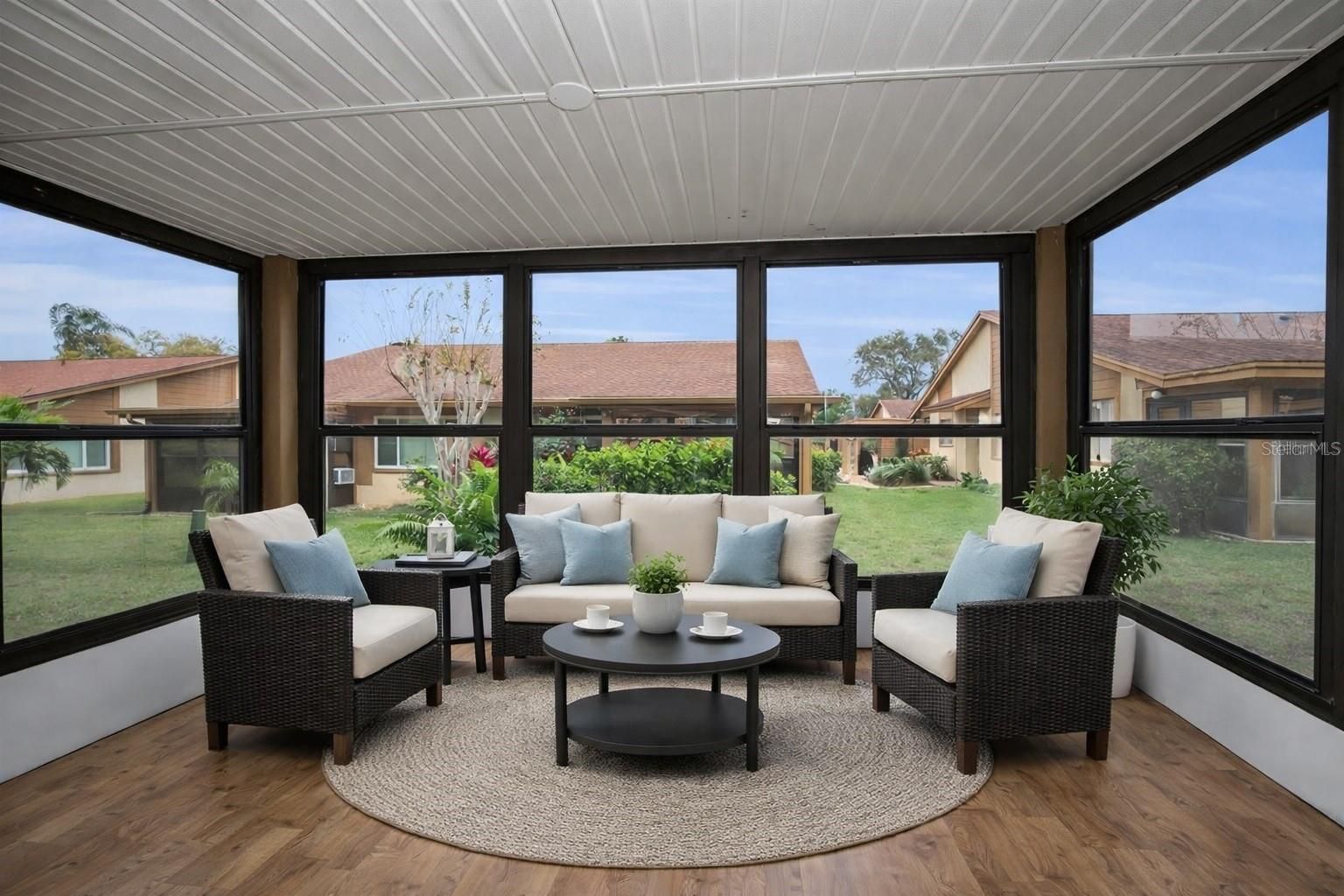 Under contract-accepting backup offers. Beautifully maintained and truly move-in ready, this first-floor 2-bedroom, 2-bath condo is located in the desirable 55+ Beacon Lakes community, a place you’ll be proud to call home. The unit includes a carport with exterior storage for added convenience. Step inside to a spacious living and dining area filled with natural light, offering ample room for entertaining family and friends. The eat-in kitchen features sliding glass doors that open to an outdoor patio—perfect for grilling or enjoying your morning coffee. The split-bedroom floor plan provides ideal privacy. The primary bedroom ensuite is located at the rear of the home, generously sized to accommodate a king-size bed and featuring a walk-in closet. A Florida room in the back offers a quiet space to unwind in the evenings. Beacon Lakes is a deed-restricted, maintenance-free community offering an active lifestyle with an impressive recreation complex, including a clubhouse, game room, community pool and spa overlooking the water, fitness center, library, gazebo, shuffleboard courts, picnic areas, and BBQs. A wide variety of daily activities are available. Conveniently located near churches, restaurants, shopping, medical facilities, and beautiful Gulf beaches, this home offers both comfort and convenience in a welcoming community.
