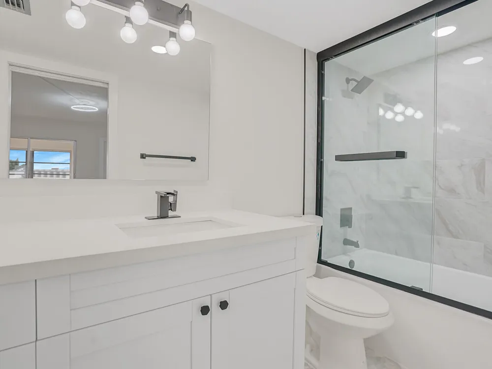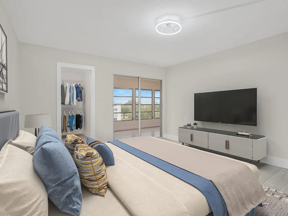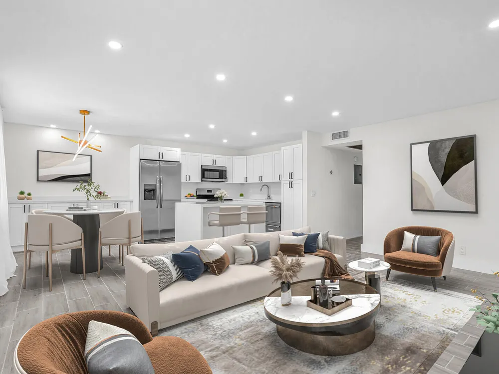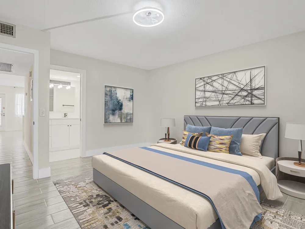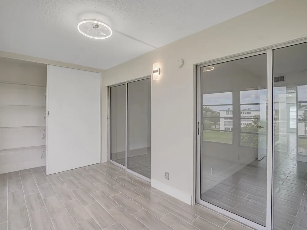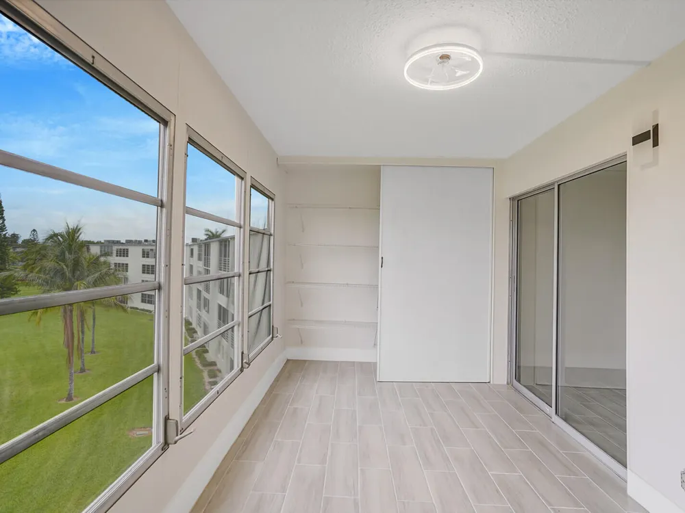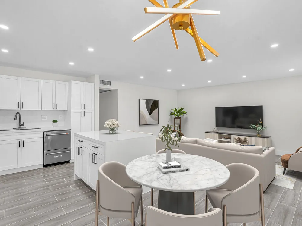 Welcome to this stunningly renovated 2BR/2BA top-floor condo in the desirable Yarmouth section of Century Village Boca Raton. From the moment you enter, you'll be captivated by the light wood-look tile flooring that flows seamlessly throughout the home, creating a bright and modern aesthetic. The chef's kitchen is a showstopper, boasting never-used stainless-steel appliances, double sinks, a double dishwasher, and gleaming Carrara quartz countertops. A large center island offers ample workspace, ideal for preparing meals or entertaining guests. A newly installed electric panel adds peace of mind and efficiency to this already updated home. The spacious living and dining area opens to a lanai with spectacular water views, creating a tranquil backdrop for daily living. The guest bedroom