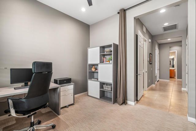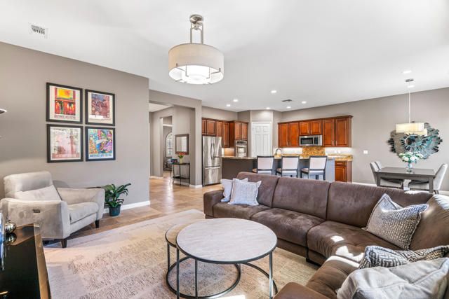 EXCEPTIONAL DESERT ELEGANCE AND REFINED COMFORT await you in the highly sought after AVALINO MODEL, offered within the guard gated 55+ community of Sun City Shadow Hills. Homes of this caliber and presentation rarely come to Market! Offered TURNKEY FURNISHED, this beautifully curated residence showcases a warm sophisticated design with an open floor plan, ideal for both everyday living and effortless entertaining. Enter from a beautifully landscaped walkway into a bright and welcoming great room, where soft designer tones, recessed lighting, upgraded shutters and tailored blinds create an atmosphere of quiet luxury! The open concept layout flows gracefully into the heart of the home! The Chefs Kitchen is designed with rich maple cabinetry, granite slab counter tops, breakfast bar seating, convection oven, dining area and walk in pantry. A generous island anchors the space while framing the captivating views of the sparking pool and freshly glazed cascading water feature, allowing loads of natural light to fill the home creating a seamless connection to the outdoors. The main living space opens beautifully to the covered patio delivering a true indoor- outdoor lifestyle. The west facing backyard is a private resort style retreat, featuring upgraded landscaping, an extended patio cover with the added value of solar screens for the warmer months, all surrounding a stunning waterfall enhanced pool! Perfect for lounging, entertaining or simply enjoying tranquil Desert sunsets. The PRIMARY SUITE is a serene retreat retreat offering both comfort and sophistication. Wake up to gentle morning light and calming pool views, then unwind in the spa inspired ensuite featuring dual vanities, a large walk in closet and a private water closet for both privacy and functionality. Every detail has been thoughtfully selected to evoke a sense of relaxed refinement. The Guest Bedroom and full bathroom in addition to the versatile FLEX Room create a private guest wing. The Flex rooms easily adapts as a third bedroom, home office or studio; Perfect for dual purpose living. Ideal for hosting guests! Completing the home is a nicely sized Laundry Room with direct access to an oversized garage with generous space for vehicles and storage, adding everyday convenience to this exceptional residence. LOVE YOUR LIFE in Sun City Shadow Hills with championship golf, fitness centers, swimming and a full calendar of clubs and social activities to keep you ACTIVE, CONNECTED and INSPIRED!!