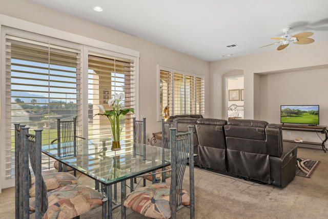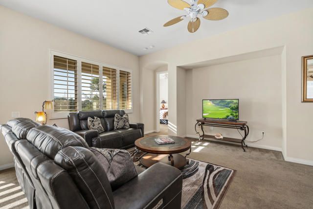 located in the sought-after Sun City Shadow Hills 55+ community, this Emilio floorplan offers approx. 1,823 sq. ft. with 2 bedrooms plus a den/office and spectacular panoramic west-facing views of the mountains, pond, and greenbelt. The entry opens to ceramic tile and neutral carpeting throughout, newer A/C. The large gourmet kitchen boasts granite countertops, double ovens, walk-in pantry, and beautiful cabinetry. The primary suite features private access to the backyard, dual vanities, and a walk-in closet. The guest bedroom includes mirrored closets, ceiling fans throughout. Outside, enjoy a covered patio and breathtaking water, mountains, pond with fountain views. Sun City Shadow Hills delivers resort-style living with two clubhouses, championship golf, fitness centers, pools & spas, pickleball and tennis courts, and a wide array of social clubs and activities. The ideal blend of recreation, relaxation, and community.