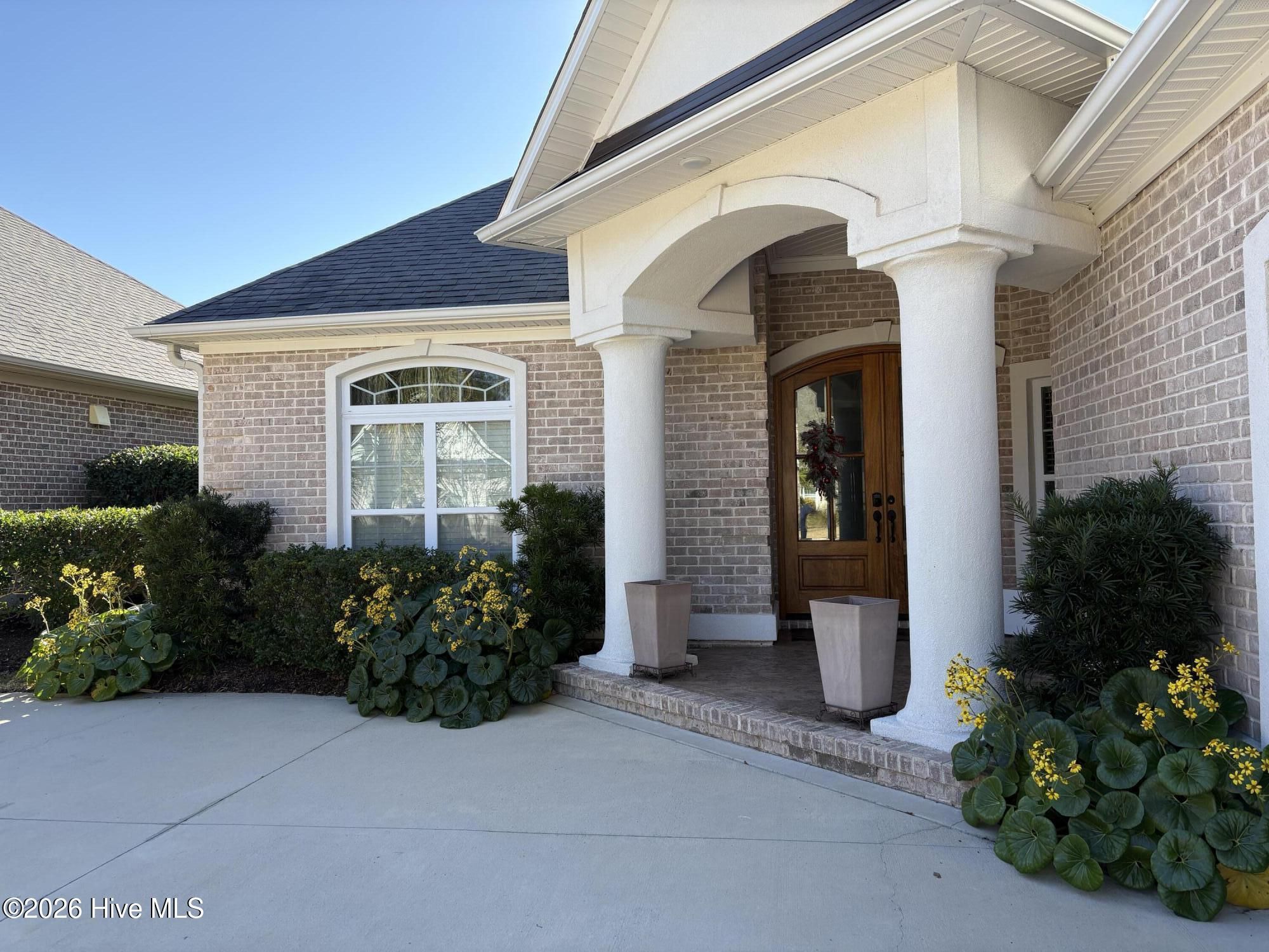Tucked within the private, gated area of Banyan Bay in Brunswick Forest, this beautifully crafted, move-in ready home offers a calm, polished lifestyle in a mature, private setting with HOA-included lawn maintenance that allows for easy, low-stress living. From the moment you arrive, the arched double front doors make a strong first impression, reflecting the thoughtful architectural details carried throughout the home. Inside, crown molding and refined ceiling treatments add subtle character, creating a space that feels comfortable and well balanced. The open floor plan connects the living room, kitchen, and dining areas, creating a space that feels comfortable and easy to live in—well suited for both everyday routines and entertaining. At the front of the home, a flexible room with double French doors offers an ideal setting for a home office or quiet workspace. The kitchen is designed as a natural gathering place, with generous prep space, ample cabinetry, and a large walk-in pantry. Quartz countertops and an oversized island featuring a modern waterfall-style design add both function and a refined finish. The primary suite is thoughtfully positioned for privacy, creating a comfortable retreat with generous space and a large walk-in closet filled with natural light. The en-suite bath has a spa-like feel, featuring a soaking tub and a zero-entry frameless glass shower designed for both comfort and ease of use. Two additional bedrooms offer flexibility for guests, a bonus room, or space for hobbies, while thoughtful storage solutions throughout the home—including a conveniently located climate-controlled storage room, laundry room, walk-in attic, and attached garage—support an organized, easy lifestyle. A standout feature of the home is the large enclosed climate-controlled sunroom with Tambour wood ceiling, an extension of the living space that invites year-round enjoyment. Whether used as a cozy sitting area, reading room, or entertaining space, it opens directly to a patio with an outdoor fireplaceperfect for quiet mornings, evening gatherings, and relaxed weekends at home. Professionally landscaped grounds, irrigation, and outdoor lighting complete the serene setting. Set alongside Cape Fear National Golf Course, Brunswick Forest offers a resort-style lifestyle anchored by exceptional amenities. Residents enjoy a state-of-the-art fitness center, pickleball and tennis courts, kayak-friendly lakes, and miles of walking and biking trails. A nearby community pool and the main amenity center are easily reached by foot or bike. With convenient access to shopping, dining, and area beaches, life here is designed to be well-connected, low-maintenance, and easy to enjoywhether as a full-time residence or a coastal escape.