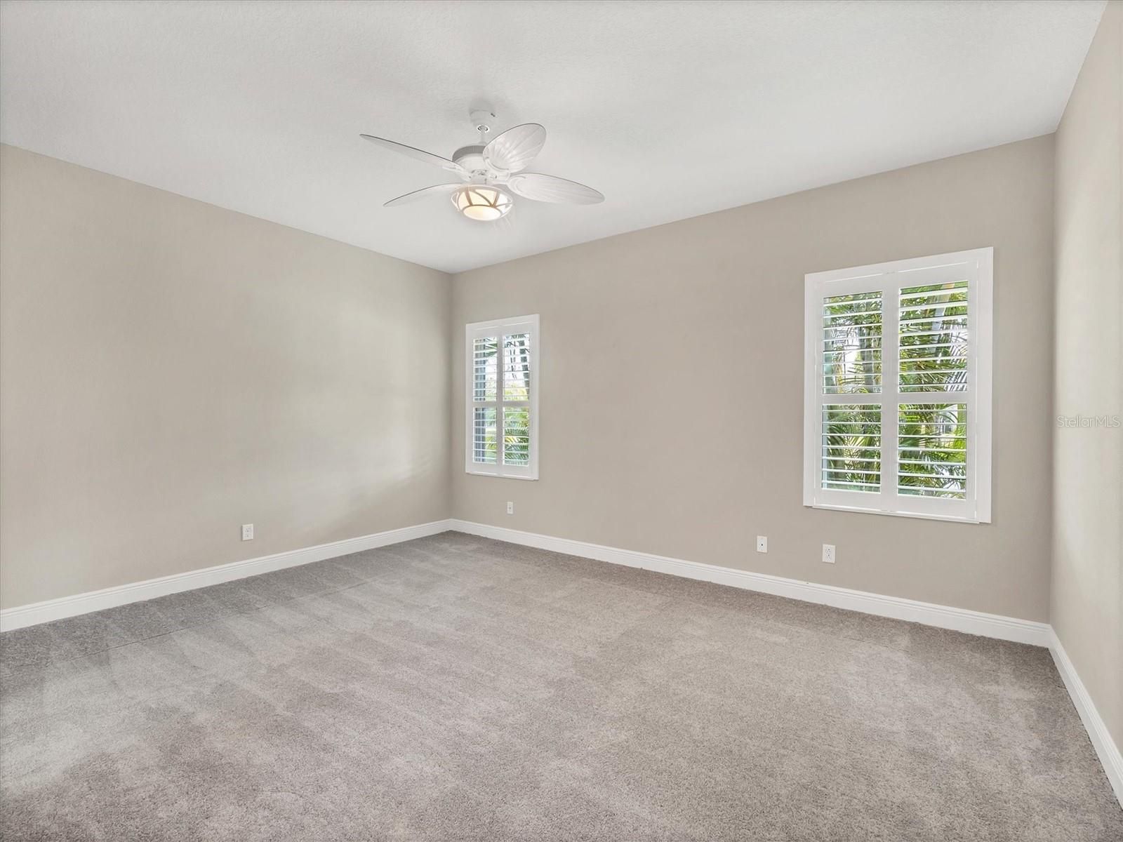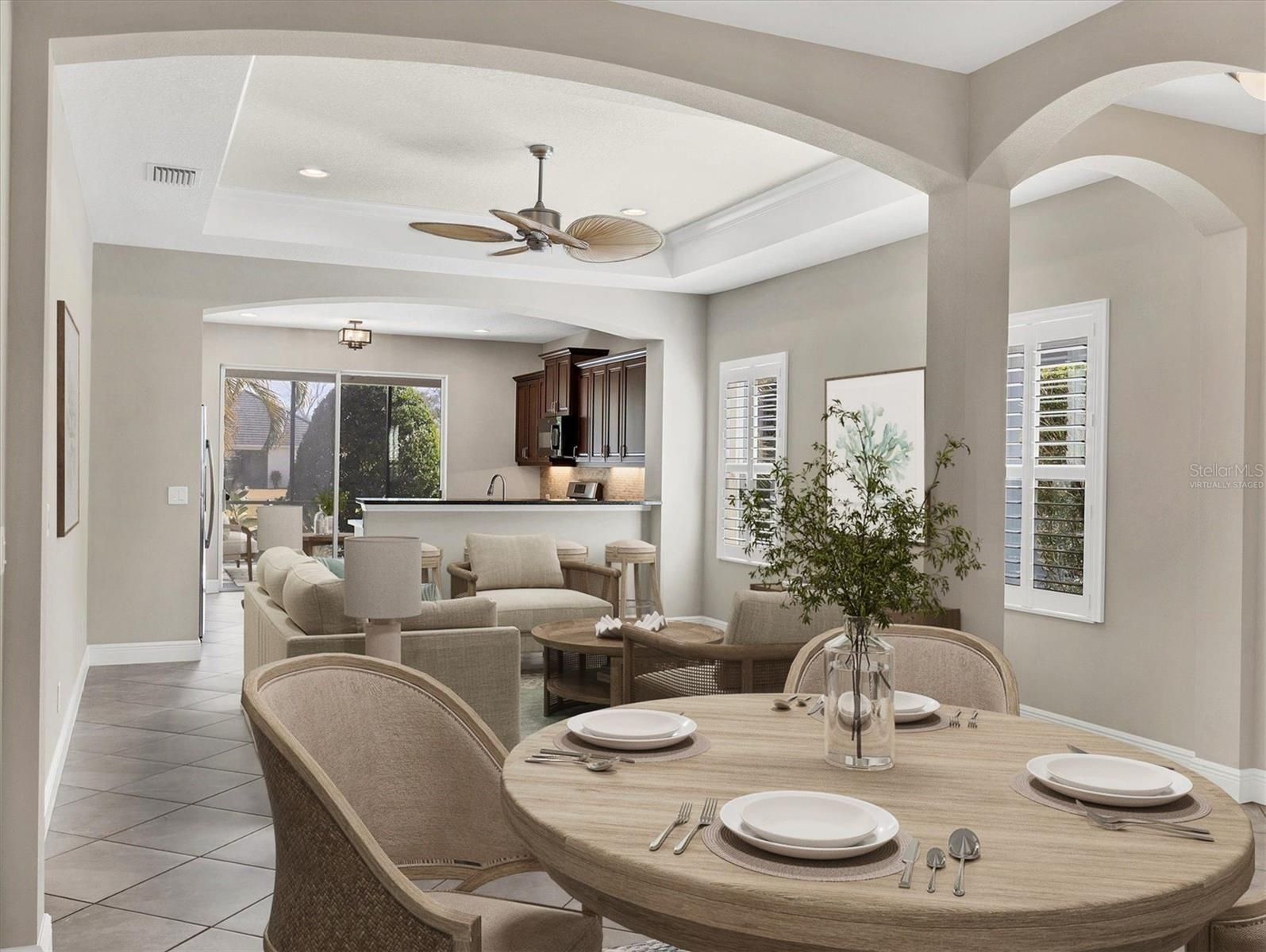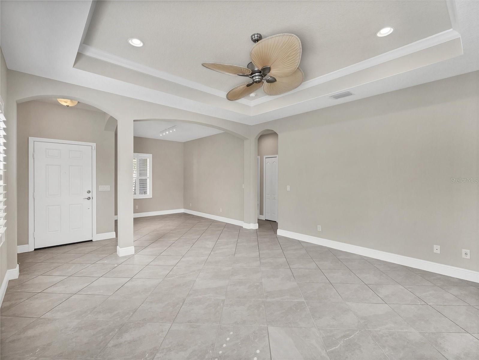 - Ceiling Fan(s), Crown Molding, High Ceilings, Living/Dining Room, Open Floorplan, Main Level Primary, Solid-Wood Cabinets, Stone Counters, Tray Ceiling(s), Walk-In Closet(s), Window Treatments