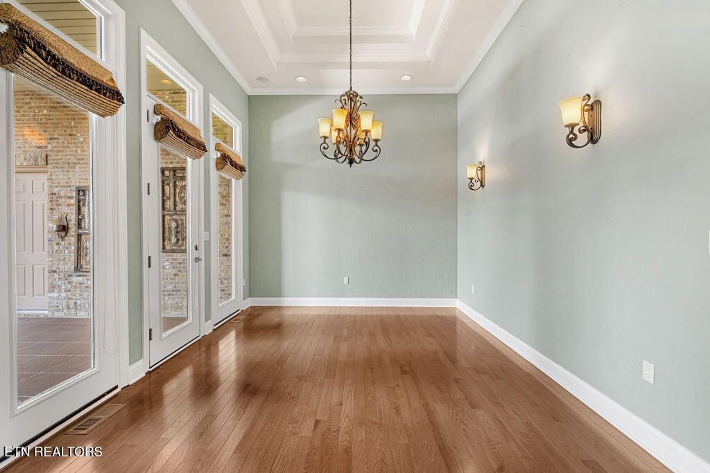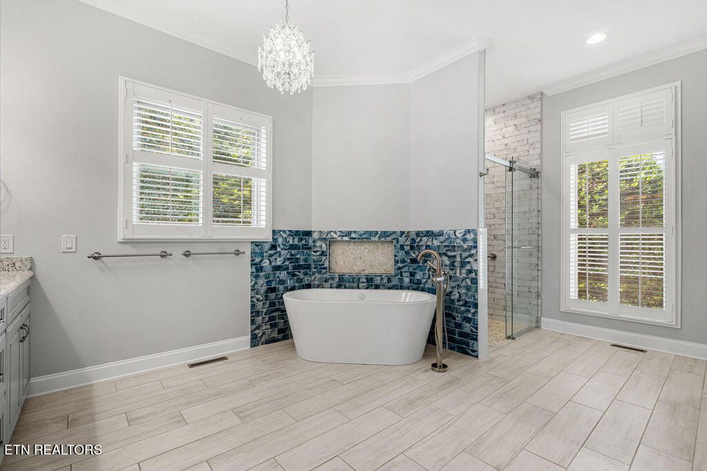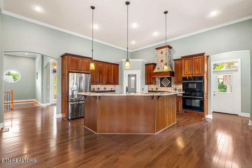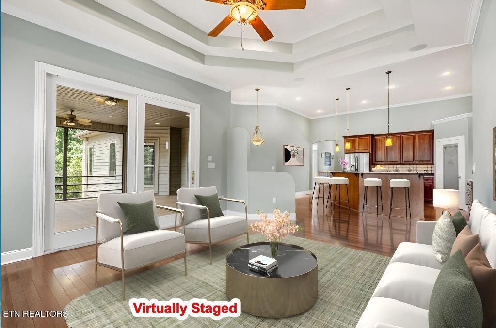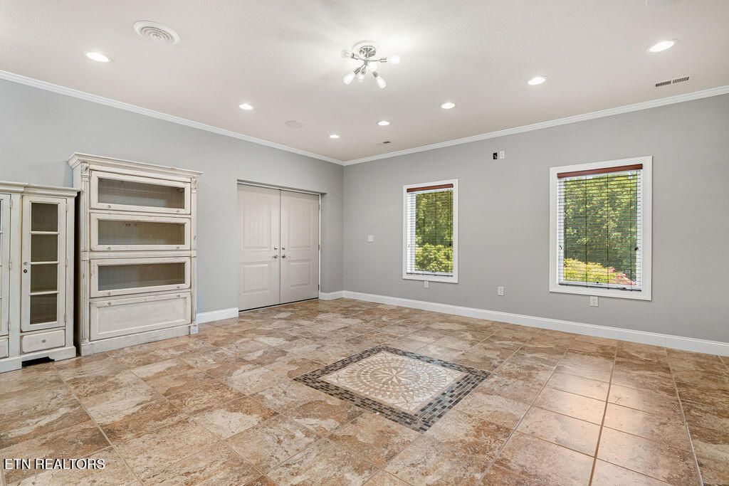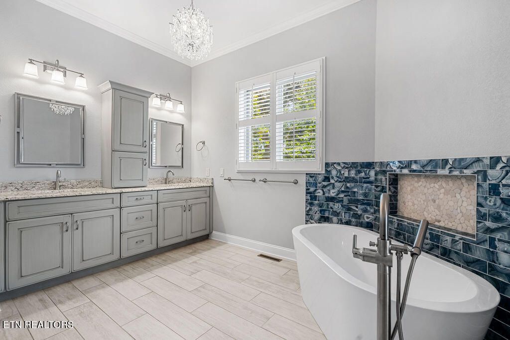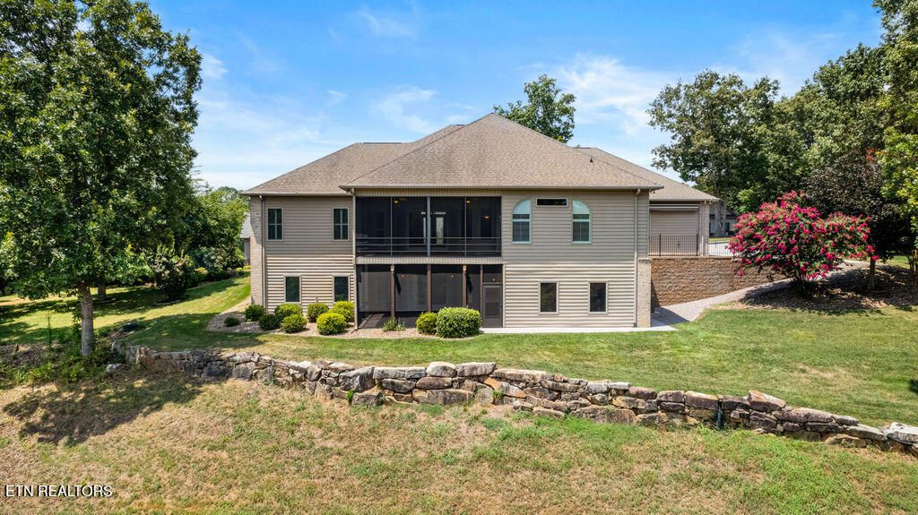 BRAND NEW ROOF 11-2025! Welcome to 402 Catoosa Lane, a captivating lake view residence nestled in the prestigious Tellico Village Lake & Golfing Community. This home offers comfort and an inviting and functional main level that sets the tone for exquisite living. Upon entry, you're greeted by the grandeur of hardwood floors extending throughout the main level, accentuating the tall ceilings and crown molding to create a sense of openness and elegance. The formal dining room, just off the foyer, invites you to host elegant dinners, while the adjacent office or sitting area, adorned with a trayed and coffered ceiling, and large sliding glass doors, leads to a screened lake view porch for a tranquil escape. Guest Bedroom #1 is filled with natural light from large windows with transoms, while the guest half bath features elegant tile flooring, faux-painted walls, and custom cabinetry, adding texture and warmth. The lakeview primary bedroom offers a serene atmosphere with a double tray ceiling and plantation shutters for privacy. It opens to a screened porch with stunning lake views. The remodeled en suite bathroom is a spa-like sanctuary, featuring wood-look tile flooring, custom cabinetry with a double vanity, granite countertops, a floor-to-ceiling shower with stainless fixtures, a soaking tub, and a water closet. The kitchen is equipped with custom wood cabinetry, granite countertops, under-cabinet lighting, and a tiled backsplash. High-end appliances, including a stainless GE refrigerator, Thermador induction cooktop, convection microwave, oven, and KitchenAid dishwasher, make meal preparation a joy. The custom island with granite countertop, stainless sink, seating room, and pantry with a decorative door offers additional storage and a breakfast area. The great room features large sliding glass doors opening to the screened porch, seamlessly blending indoor and outdoor living. Additional main level features include a versatile hallway off the kitchen with a large closet, Guest Full Bathroom #1 with custom cabinetry, and a spacious three-car side entry garage with epoxy-coated flooring. Lower Walkout Basement Level blends functionality with style, featuring crown molding throughout for a sophisticated touch. The expansive open floor plan family room is highlighted by wood-look tile flooring and sliding glass doors leading to a spacious lower lake view screened porch. The kitchen area is complete w/custom cabinetry, a granite countertop, and a sink, along with a Frigidaire dishwasher and retro-look Whirlpool refrigerator/freezer. Custom cabinet pull-out pantry shelving and a stone floor-to-ceiling wall with a granite top enhance both functionality and aesthetics. The guest suite area is designed for comfort and privacy, featuring Guest Bedrooms #3 and #4, Guest Bathroom #3 boasting tiled flooring, a large tiled jetted tub, custom cabinetry with a sink, a granite countertop, a large mirror, and fixtures and Guest Bathroom #4 offering large floor-to-ceiling tiled shower with sliding glass doors, custom cabinetry, and granite countertop. Additional features include a versatile flex room with wall cabinetry, a utility closet, a Milele washer and dryer, and a utility sink, as well as an art/sewing/craft room equipped for creative pursuits. The exterior of the home is beautifully adorned with brick and vinyl siding, and an oversized concrete driveway with double lamp pole lighting leads to a large covered front porch, perfect for welcoming guests. The professionally landscaped grounds, complete with irrigation, remain lush and vibrant year-round. A paver sidewalk and walkway with aluminum powder-coated fencing lead from the garage side to the side and back of the home, highlighting the thoughtful exterior design. The lush backyard is framed by an expansive stone retaining wall, offering partial lake views in the spring and summer and full views in the cooler months. For more detailed information see The Features Sheet