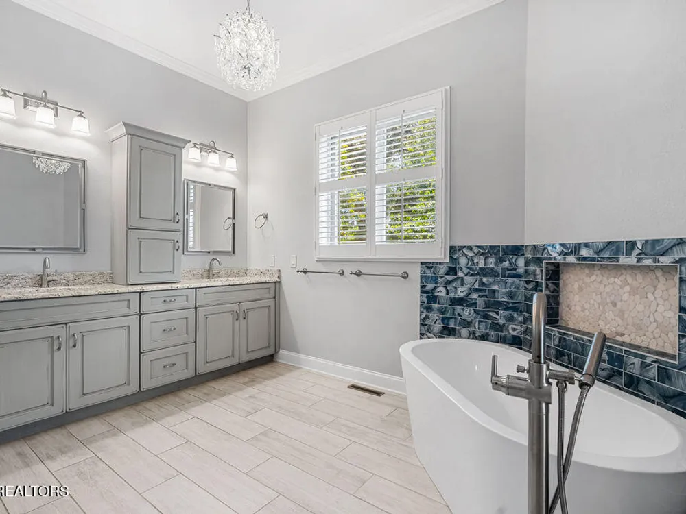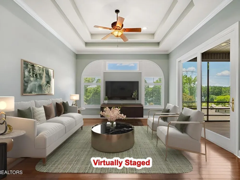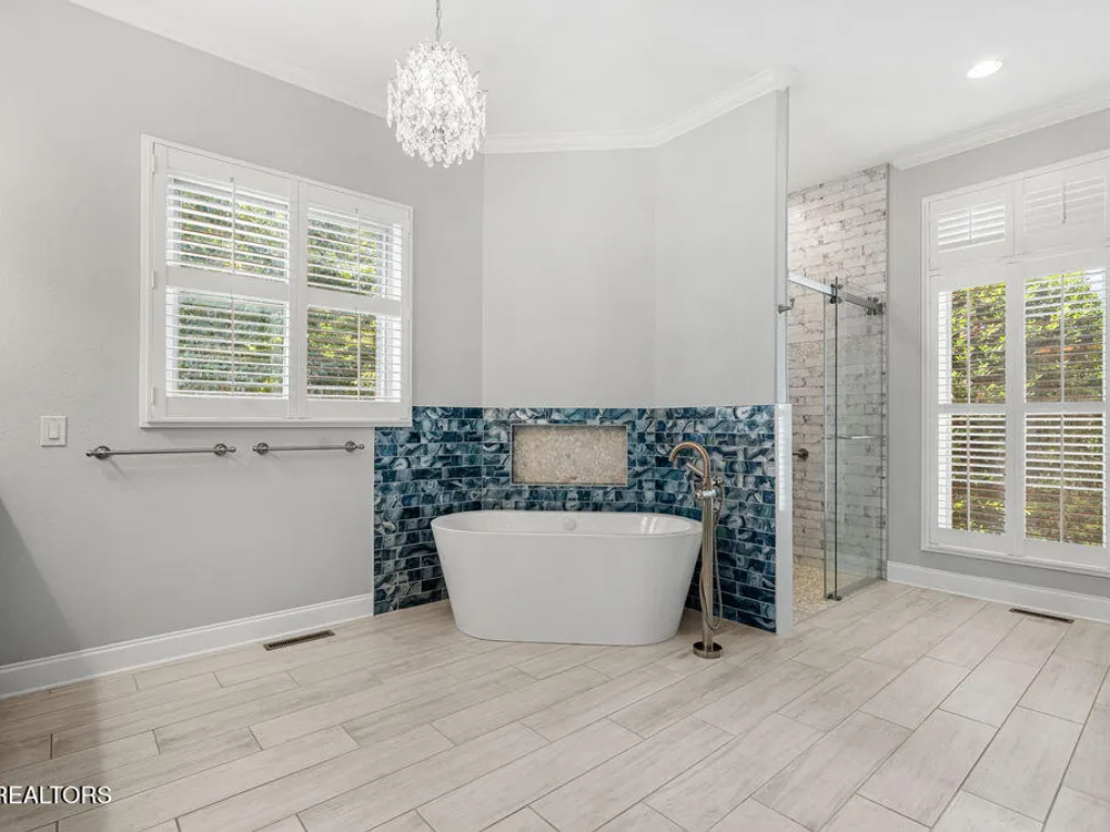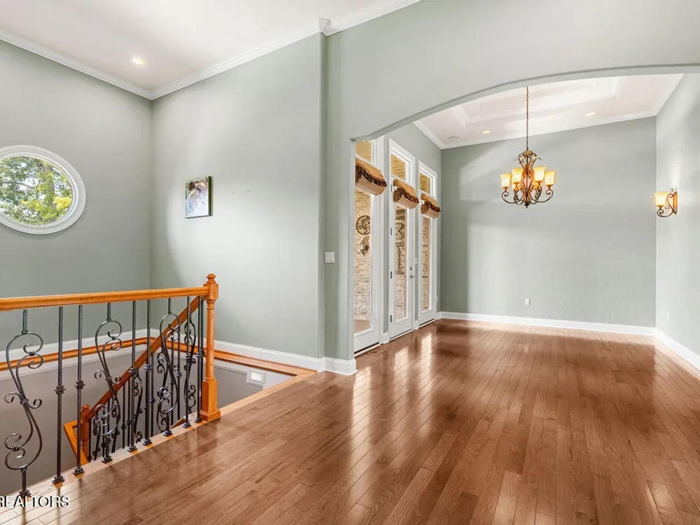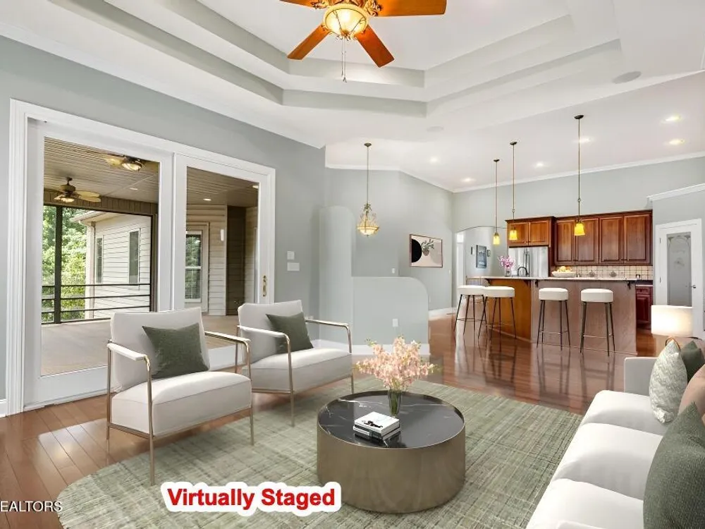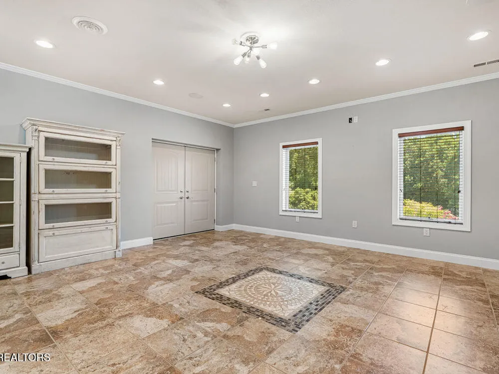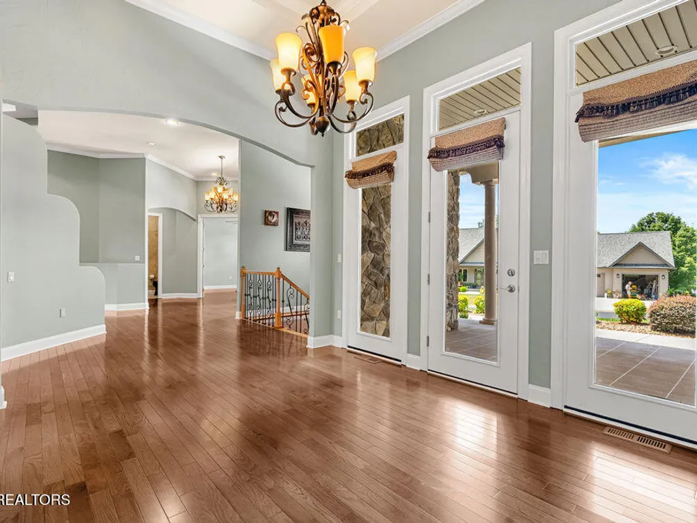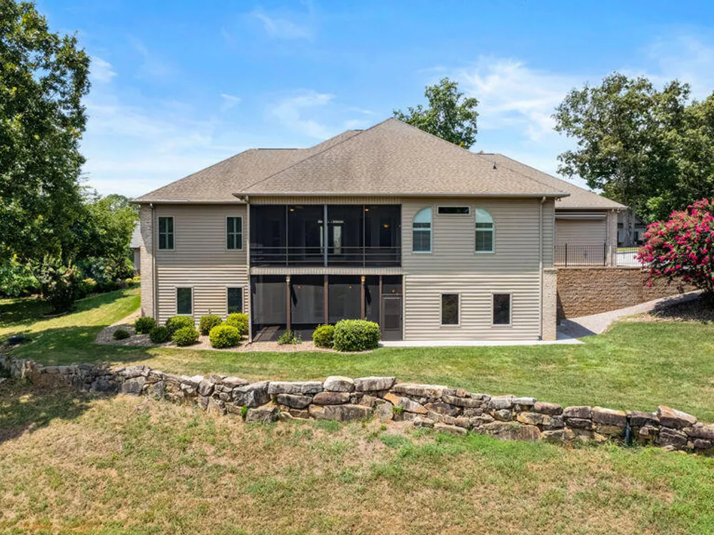 Welcome to 402 Catoosa Lane, a captivating lake view residence nestled in the prestigious Tellico Village Lake & Golfing Community. This home perfectly encapsulates luxury and comfort, offering an inviting and functional main level that sets the tone for exquisite living. Upon entry, you're greeted by the grandeur of hardwood floors extending throughout the main level, accentuating the tall ceilings and crown molding to create a sense of openness and elegance. The formal dining room, just off the foyer, invites you to host elegant dinners, while the adjacent office or sitting area, adorned with a trayed and coffered ceiling, and large sliding glass doors, leads to a screened lake view porch for a tranquil escape. Guest Bedroom #1 is filled with natural light from large windows with transoms, while the guest half bath features elegant tile flooring, faux-painted walls, and custom cabinetry, adding texture and warmth. The lakeview primary bedroom offers a serene atmosphere with a double tray ceiling and plantation shutters for privacy. It opens to a screened porch with stunning lake views. The remodeled en suite bathroom is a spa-like sanctuary, featuring wood-look tile flooring, custom cabinetry with a double vanity, granite countertops, a floor-to-ceiling shower with stainless fixtures, a soaking tub, and a water closet. The kitchen is equipped with custom wood cabinetry, granite countertops, under-cabinet lighting, and a tiled backsplash. High-end appliances, including a stainless GE refrigerator, Thermador induction cooktop, convection microwave, oven, and KitchenAid dishwasher, make meal preparation a joy. The custom island with granite countertop, stainless sink, seating room, and pantry with a decorative door offers additional storage and a breakfast area. The great room features large sliding glass doors opening to the screened porch, seamlessly blending indoor and outdoor living. Additional main level features include a versatile hallway off the kitchen with a large closet, Guest Full Bathroom #1 with custom cabinetry, and a spacious three-car side entry garage with epoxy-coated flooring. Lower Walkout Basement Level blends functionality with style, featuring crown molding throughout for a sophisticated touch. The expansive open floor plan family room is highlighted by wood-look tile flooring and sliding glass doors leading to a spacious lower lake view screened porch. The kitchen area is complete w/custom cabinetry, a granite countertop, and a sink, along with a Frigidaire dishwasher and retro-look Whirlpool refrigerator/freezer. Custom cabinet pull-out pantry shelving and a stone floor-to-ceiling wall with a granite top enhance both functionality and aesthetics. The guest suite area is designed for comfort and privacy, featuring Guest Bedrooms #3 and #4, Guest Bathroom #3 boasting tiled flooring, a large tiled jetted tub, custom cabinetry with a sink, a granite countertop, a large mirror, and fixtures and Guest Bathroom #4 offering large floor-to-ceiling tiled shower with sliding glass doors, custom cabinetry, and granite countertop. Additional features include a versatile flex room with wall cabinetry, a utility closet, a Milele washer and dryer, and a utility sink, as well as an art/sewing/craft room equipped for creative pursuits. The exterior of the home is beautifully adorned with brick and vinyl siding, and an oversized concrete driveway with double lamp pole lighting leads to a large covered front porch, perfect for welcoming guests. The professionally landscaped grounds, complete with irrigation, remain lush and vibrant year-round. A paver sidewalk and walkway with aluminum powder-coated fencing lead from the garage side to the side and back of the home, highlighting the thoughtful exterior design. The lush backyard is framed by an expansive stone retaining wall, offering partial lake views in the spring and summer and full views in the cooler months. For more detailed information see The Features Sheet.