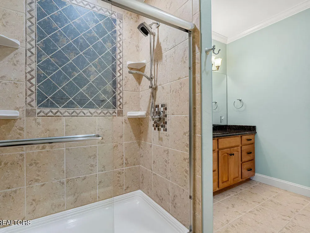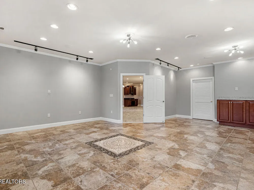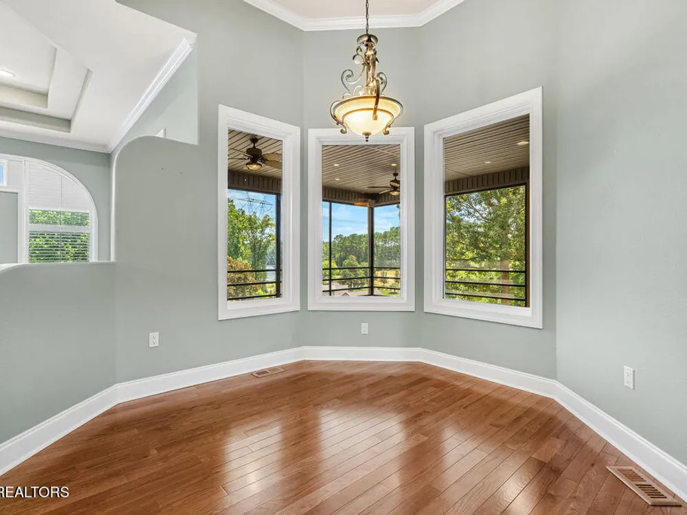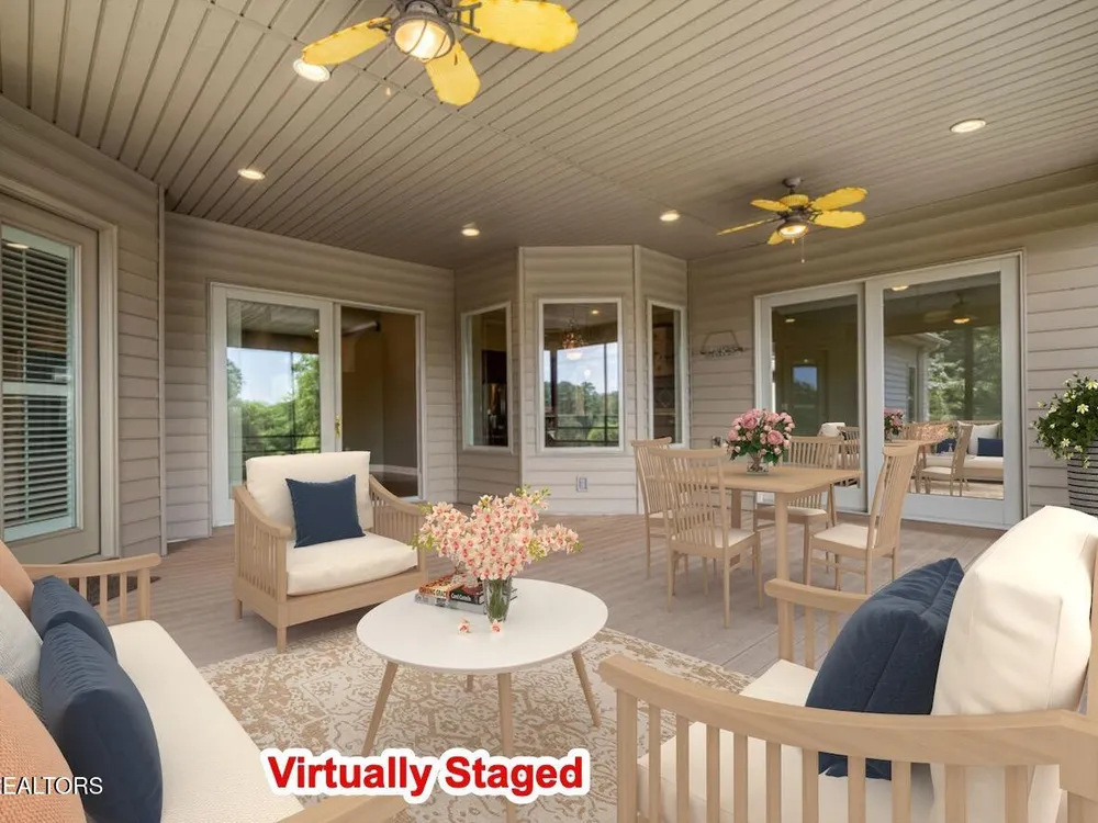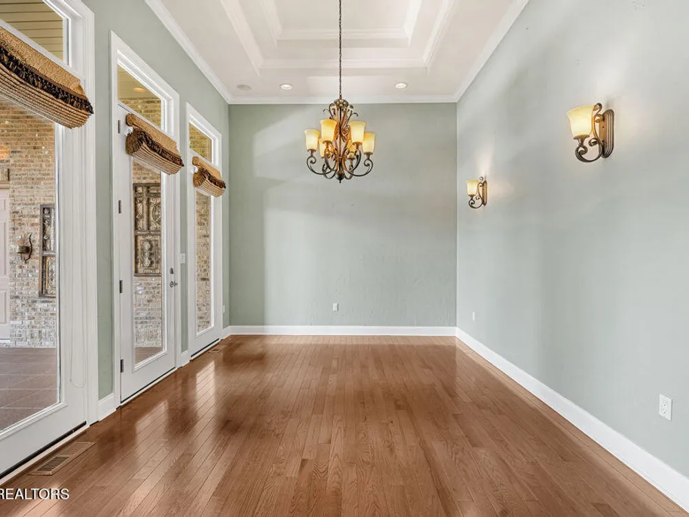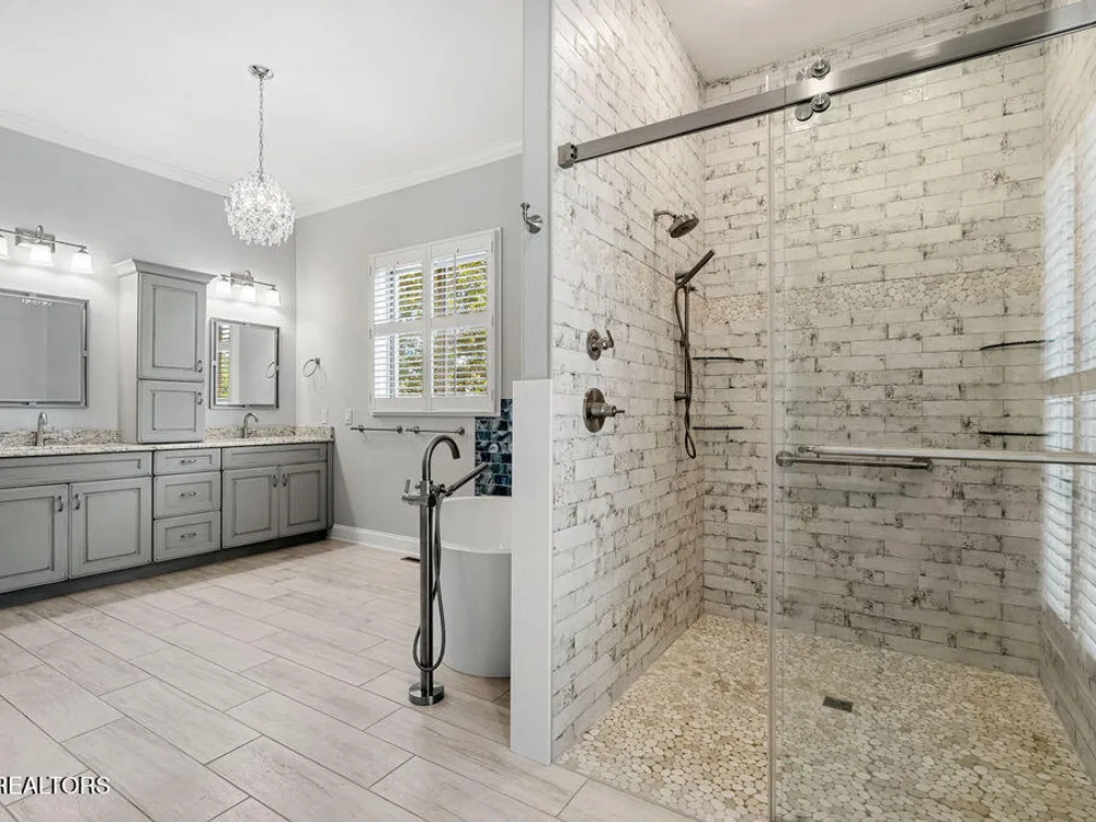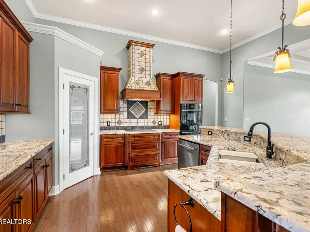 Welcome to 402 Catoosa Lane, a captivating lake view residence nestled in the prestigious Tellico Village Lake & Golfing Community. This home perfectly encapsulates luxury and comfort, offering an inviting and functional main level that sets the tone for exquisite living. Upon entry, you're greeted by the grandeur of hardwood floors extending throughout the main level, accentuating the tall ceilings and crown molding to create a sense of openness and elegance. The formal dining room, just off the foyer, invites you to host elegant dinners, while the adjacent office or sitting area, adorned with a trayed and coffered ceiling, and large sliding glass doors, leads to a screened lake view porch for a tranquil escape. Guest Bedroom #1 is filled with natural light from large windows with transoms, while the guest half bath features elegant tile flooring, faux-painted walls, and custom cabinetry, adding texture and warmth. The lakeview primary bedroom offers a serene atmosphere with a double tray ceiling and plantation shutters for privacy. It opens to a screened porch with stunning lake views. The remodeled en suite bathroom is a spa-like sanctuary, featuring wood-look tile flooring, custom cabinetry with a double vanity, granite countertops, a floor-to-ceiling shower with stainless fixtures, a soaking tub, and a water closet. The kitchen is equipped with custom wood cabinetry, granite countertops, under-cabinet lighting, and a tiled backsplash. High-end appliances, including a stainless GE refrigerator, Thermador induction cooktop, convection microwave, oven, and KitchenAid dishwasher, make meal preparation a joy. The custom island with granite countertop, stainless sink, seating room, and pantry with a decorative door offers additional storage and a breakfast area. The great room features large sliding glass doors opening to the screened porch, seamlessly blending indoor and outdoor living. Additional main level features include a versatile hallway off the kitchen with a large closet, Guest Full Bathroom #1 with custom cabinetry, and a spacious three-car side entry garage with epoxy-coated flooring. Lower Walkout Basement Level blends functionality with style, featuring crown molding throughout for a sophisticated touch. The expansive open floor plan family room is highlighted by wood-look tile flooring and sliding glass doors leading to a spacious lower lake view screened porch. The kitchen area is complete w/custom cabinetry, a granite countertop, and a sink, along with a Frigidaire dishwasher and retro-look Whirlpool refrigerator/freezer. Custom cabinet pull-out pantry shelving and a stone floor-to-ceiling wall with a granite top enhance both functionality and aesthetics. The guest suite area is designed for comfort and privacy, featuring Guest Bedrooms #3 and #4, Guest Bathroom #3 boasting tiled flooring, a large tiled jetted tub, custom cabinetry with a sink, a granite countertop, a large mirror, and fixtures and Guest Bathroom #4 offering large floor-to-ceiling tiled shower with sliding glass doors, custom cabinetry, and granite countertop. Additional features include a versatile flex room with wall cabinetry, a utility closet, a Milele washer and dryer, and a utility sink, as well as an art/sewing/craft room equipped for creative pursuits. The exterior of the home is beautifully adorned with brick and vinyl siding, and an oversized concrete driveway with double lamp pole lighting leads to a large covered front porch, perfect for welcoming guests. The professionally landscaped grounds, complete with irrigation, remain lush and vibrant year-round. A paver sidewalk and walkway with aluminum powder-coated fencing lead from the garage side to the side and back of the home, highlighting the thoughtful exterior design. The lush backyard is framed by an expansive stone retaining wall, offering partial lake views in the spring and summer and full views in the cooler months. For more detailed information see The Features Sheet.