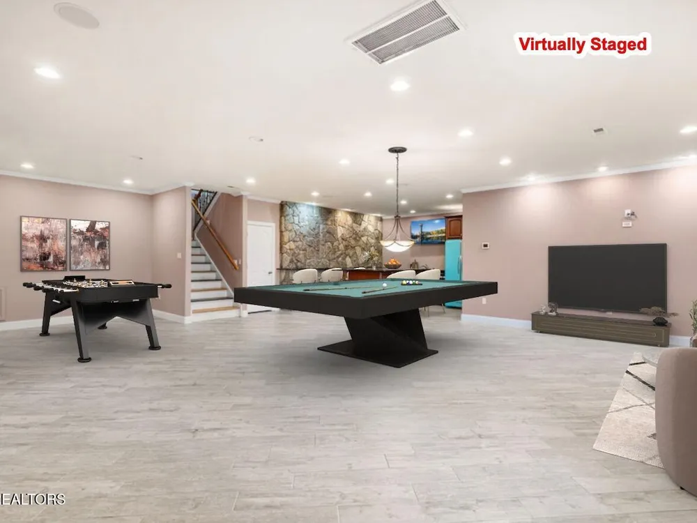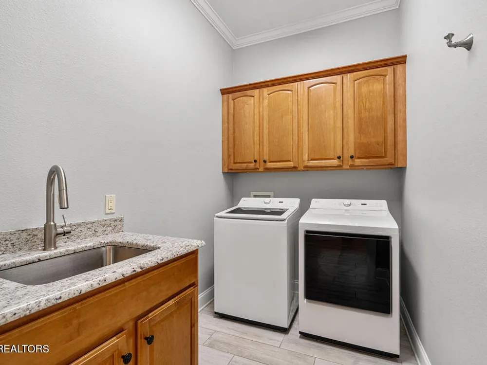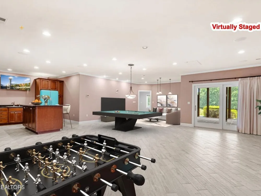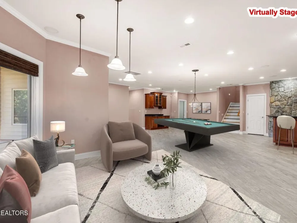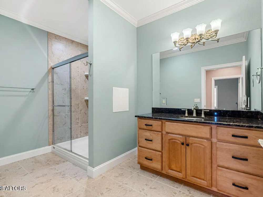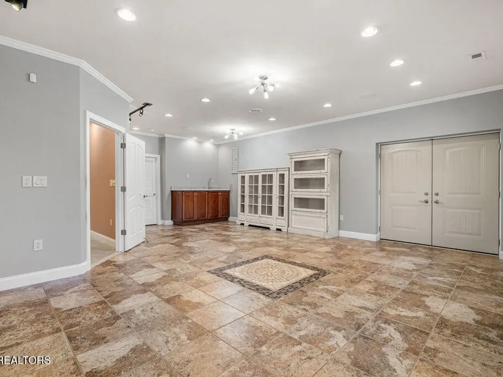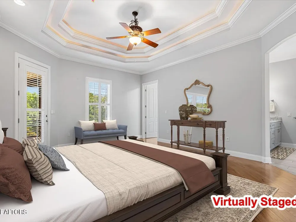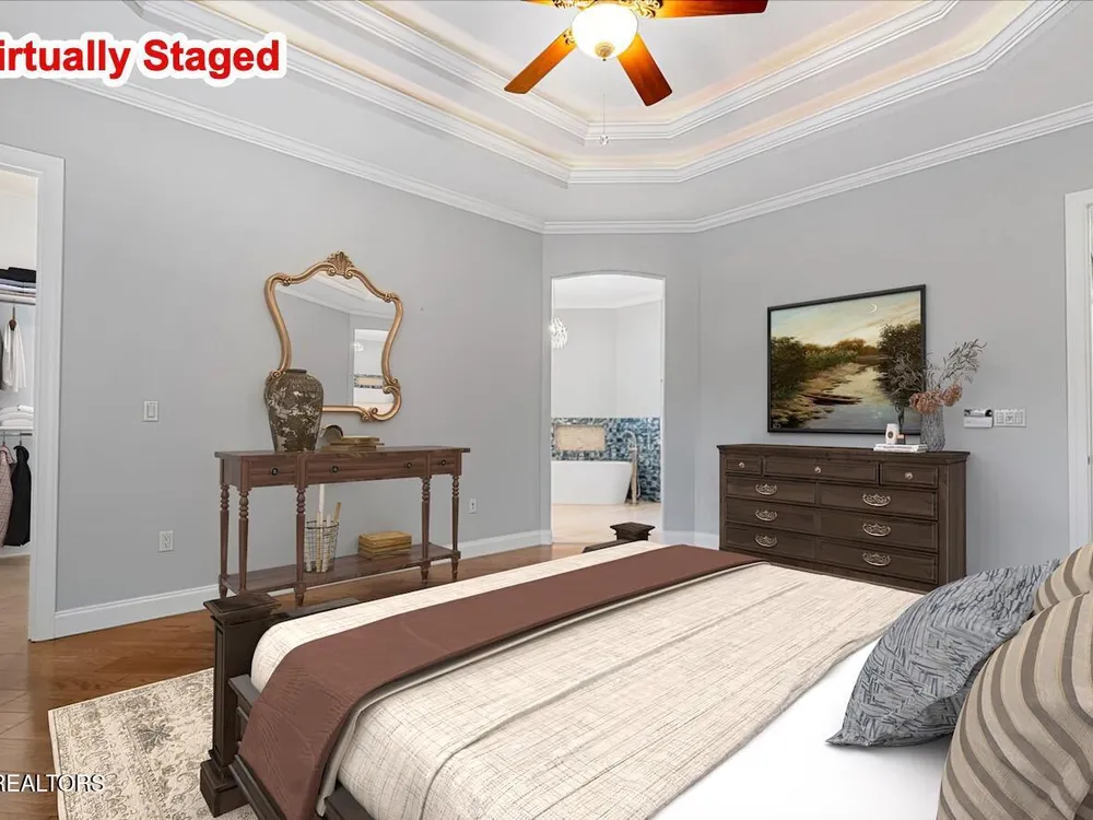 Welcome to 402 Catoosa Lane, a captivating lake view residence nestled in the prestigious Tellico Village Lake & Golfing Community. This home perfectly encapsulates luxury and comfort, offering an inviting and functional main level that sets the tone for exquisite living. Upon entry, you're greeted by the grandeur of hardwood floors extending throughout the main level, accentuating the tall ceilings and crown molding to create a sense of openness and elegance. The formal dining room, just off the foyer, invites you to host elegant dinners, while the adjacent office or sitting area, adorned with a trayed and coffered ceiling, and large sliding glass doors, leads to a screened lake view porch for a tranquil escape. Guest Bedroom #1 is filled with natural light from large windows with transoms, while the guest half bath features elegant tile flooring, faux-painted walls, and custom cabinetry, adding texture and warmth. The lakeview primary bedroom offers a serene atmosphere with a double tray ceiling and plantation shutters for privacy. It opens to a screened porch with stunning lake views. The remodeled en suite bathroom is a spa-like sanctuary, featuring wood-look tile flooring, custom cabinetry with a double vanity, granite countertops, a floor-to-ceiling shower with stainless fixtures, a soaking tub, and a water closet. The kitchen is equipped with custom wood cabinetry, granite countertops, under-cabinet lighting, and a tiled backsplash. High-end appliances, including a stainless GE refrigerator, Thermador induction cooktop, convection microwave, oven, and KitchenAid dishwasher, make meal preparation a joy. The custom island with granite countertop, stainless sink, seating room, and pantry with a decorative door offers additional storage and a breakfast area. The great room features large sliding glass doors opening to the screened porch, seamlessly blending indoor and outdoor living. Additional main level features include a versatile hallway off the kitchen with a large closet, Guest Full Bathroom #1 with custom cabinetry, and a spacious three-car side entry garage with epoxy-coated flooring. Lower Walkout Basement Level blends functionality with style, featuring crown molding throughout for a sophisticated touch. The expansive open floor plan family room is highlighted by wood-look tile flooring and sliding glass doors leading to a spacious lower lake view screened porch. The kitchen area is complete w/custom cabinetry, a granite countertop, and a sink, along with a Frigidaire dishwasher and retro-look Whirlpool refrigerator/freezer. Custom cabinet pull-out pantry shelving and a stone floor-to-ceiling wall with a granite top enhance both functionality and aesthetics. The guest suite area is designed for comfort and privacy, featuring Guest Bedrooms #3 and #4, Guest Bathroom #3 boasting tiled flooring, a large tiled jetted tub, custom cabinetry with a sink, a granite countertop, a large mirror, and fixtures and Guest Bathroom #4 offering large floor-to-ceiling tiled shower with sliding glass doors, custom cabinetry, and granite countertop. Additional features include a versatile flex room with wall cabinetry, a utility closet, a Milele washer and dryer, and a utility sink, as well as an art/sewing/craft room equipped for creative pursuits. The exterior of the home is beautifully adorned with brick and vinyl siding, and an oversized concrete driveway with double lamp pole lighting leads to a large covered front porch, perfect for welcoming guests. The professionally landscaped grounds, complete with irrigation, remain lush and vibrant year-round. A paver sidewalk and walkway with aluminum powder-coated fencing lead from the garage side to the side and back of the home, highlighting the thoughtful exterior design. The lush backyard is framed by an expansive stone retaining wall, offering partial lake views in the spring and summer and full views in the cooler months. For more detailed information see The Features Sheet.
