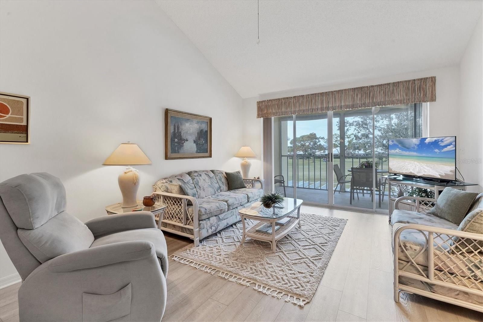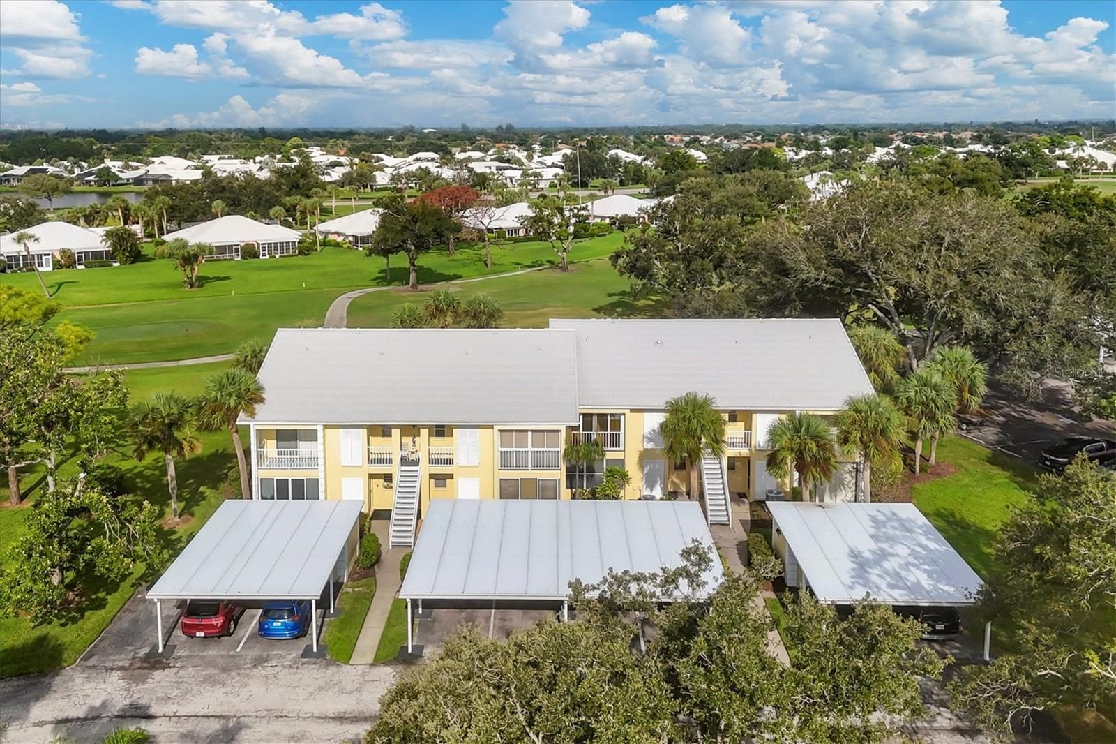 Enjoy fabulous Florida sunsets overlooking the 8th tee & Fairway of the Bobcat course from this tastefully furnished 2nd floor, end unit. The residence features soaring cathedral ceilings and and stylish vinyl plank flooring throughout. The primary bedroom boasts an en-suite bath and a spacious walk-in closet. The guest suite with an adjacent bathroom offers its own private balcony where you can enjoy the sunrise while you sip your coffee or tea. Recent updates include new hot water tank in 2023, a new metal roof in 2024, new carports and storage roofs in 2024-25,recently completed exterior painting and a newly paved parking lot and roadway. Sold furnished, this condo is move-in ready. NO CDD FEES. Residents can take advantage of the nearby neighborhood pool and clubhouse, ideal for social gatherings, exercise or relaxation. The community is conveniently located near downtown Wellen Park, downtown Venice and some of Florida's most spectacular beaches. The optional private country club offers various membship types to suit every lifestyle.